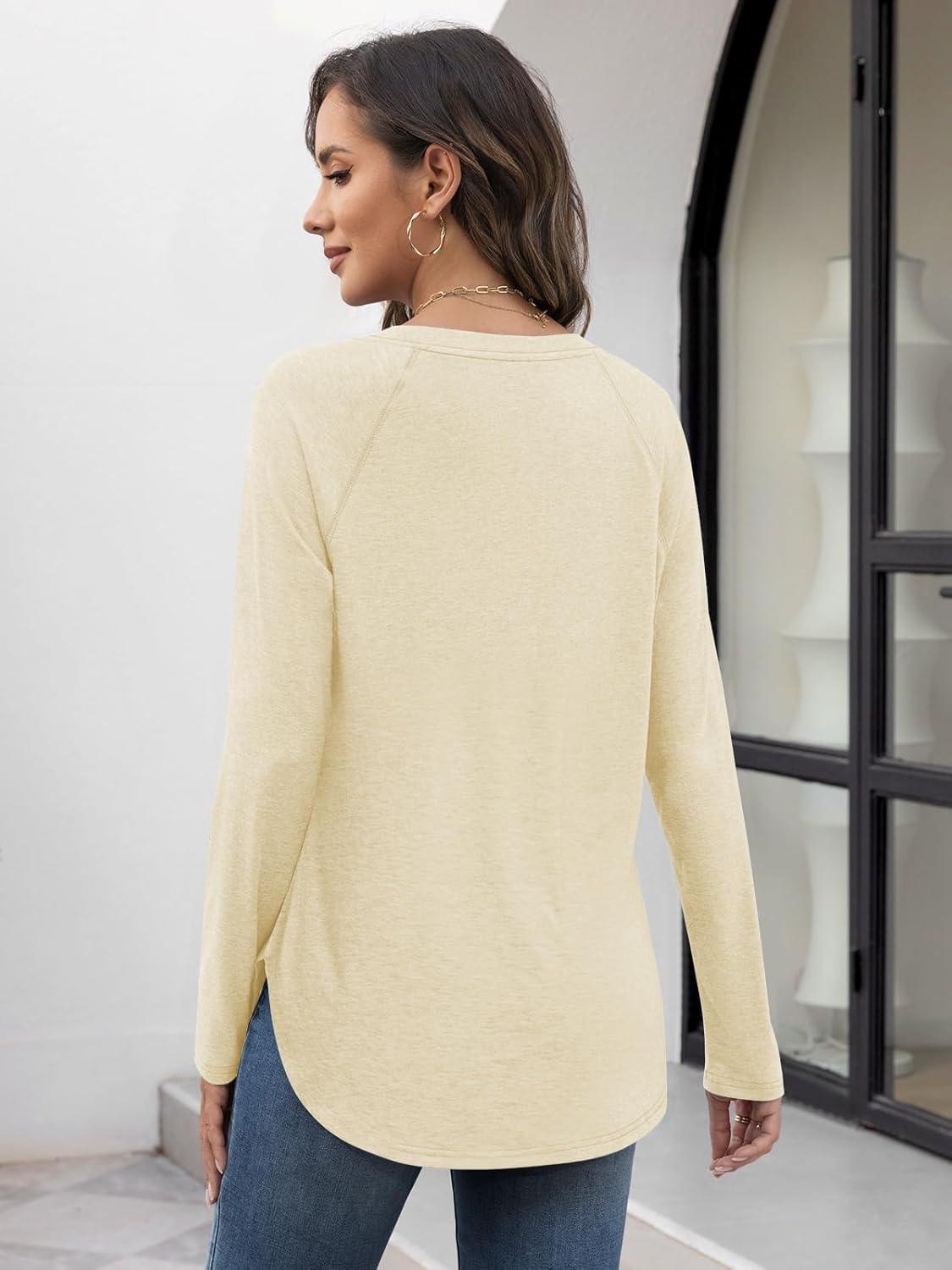ATHMILE Long Sleeve Shirts for Women Fall Outfit 2025 Fashion Casual T Shirt Round Neck Basic Loose Tunic Tops(Cream)