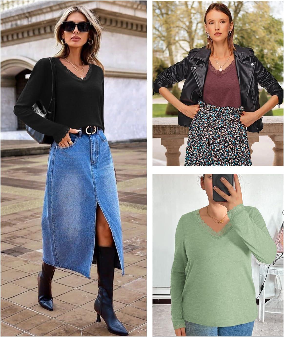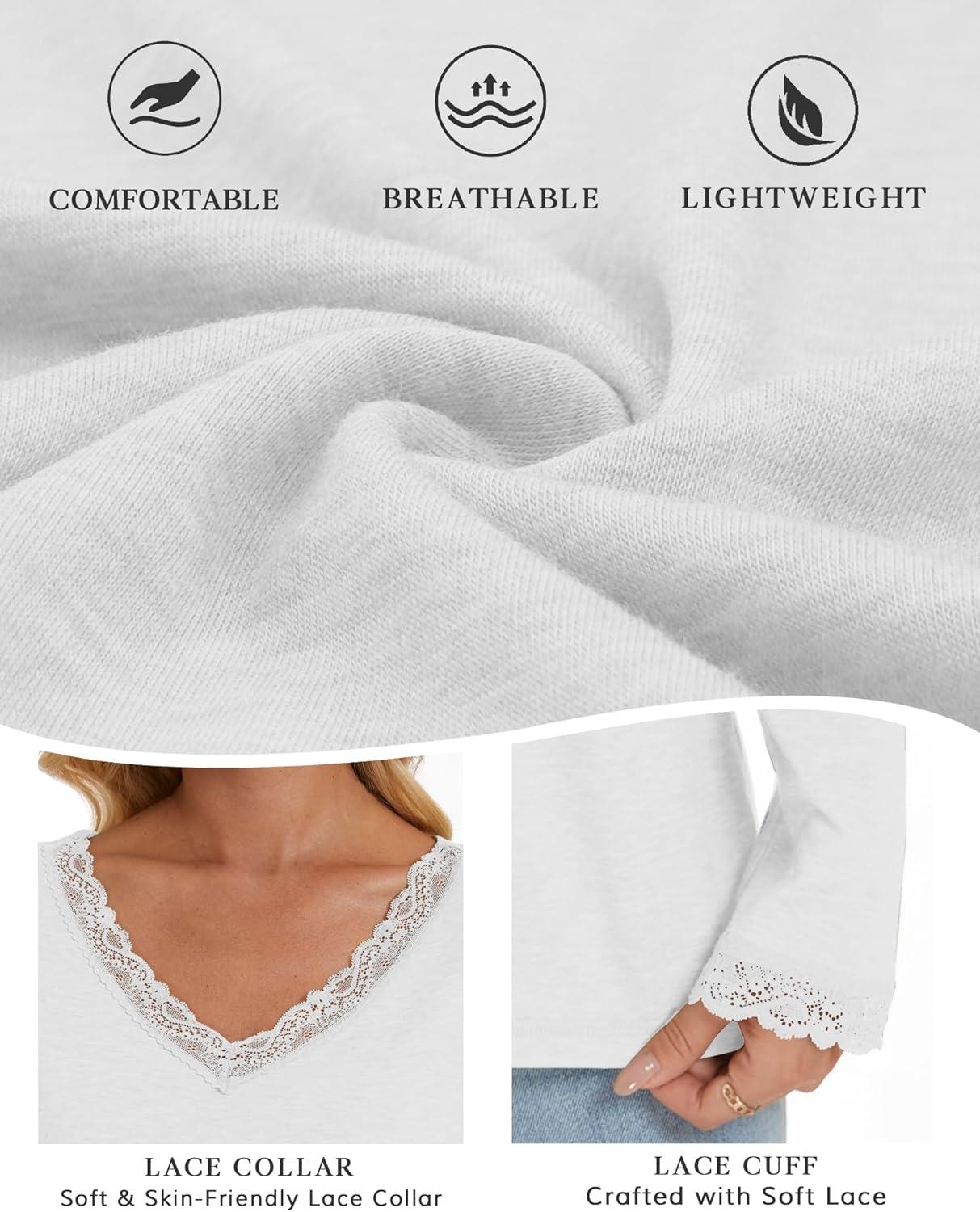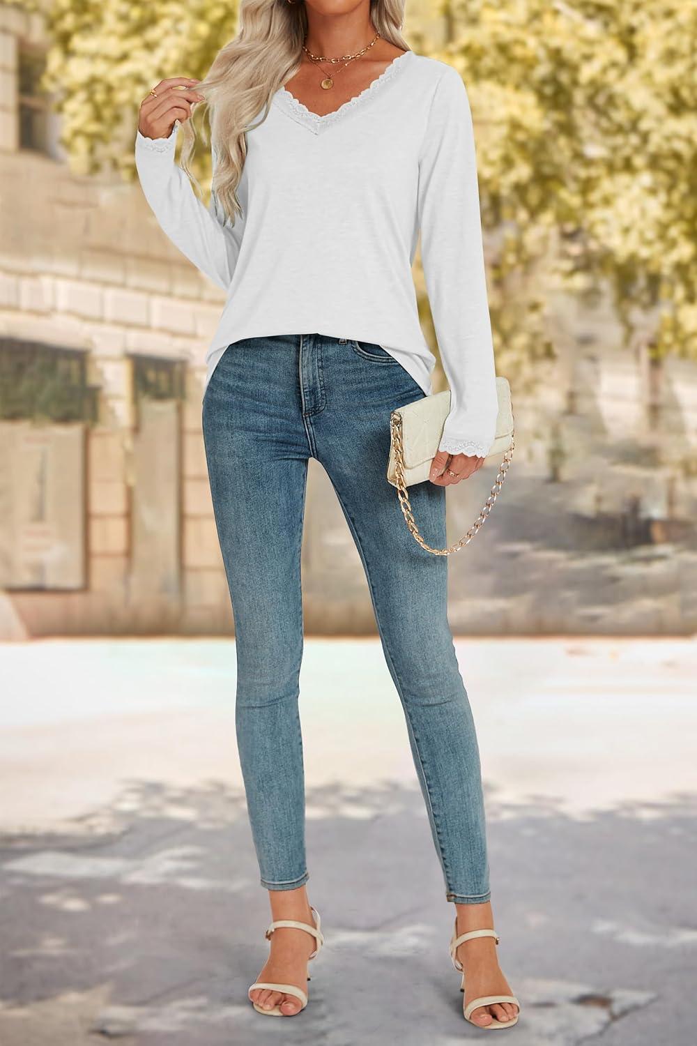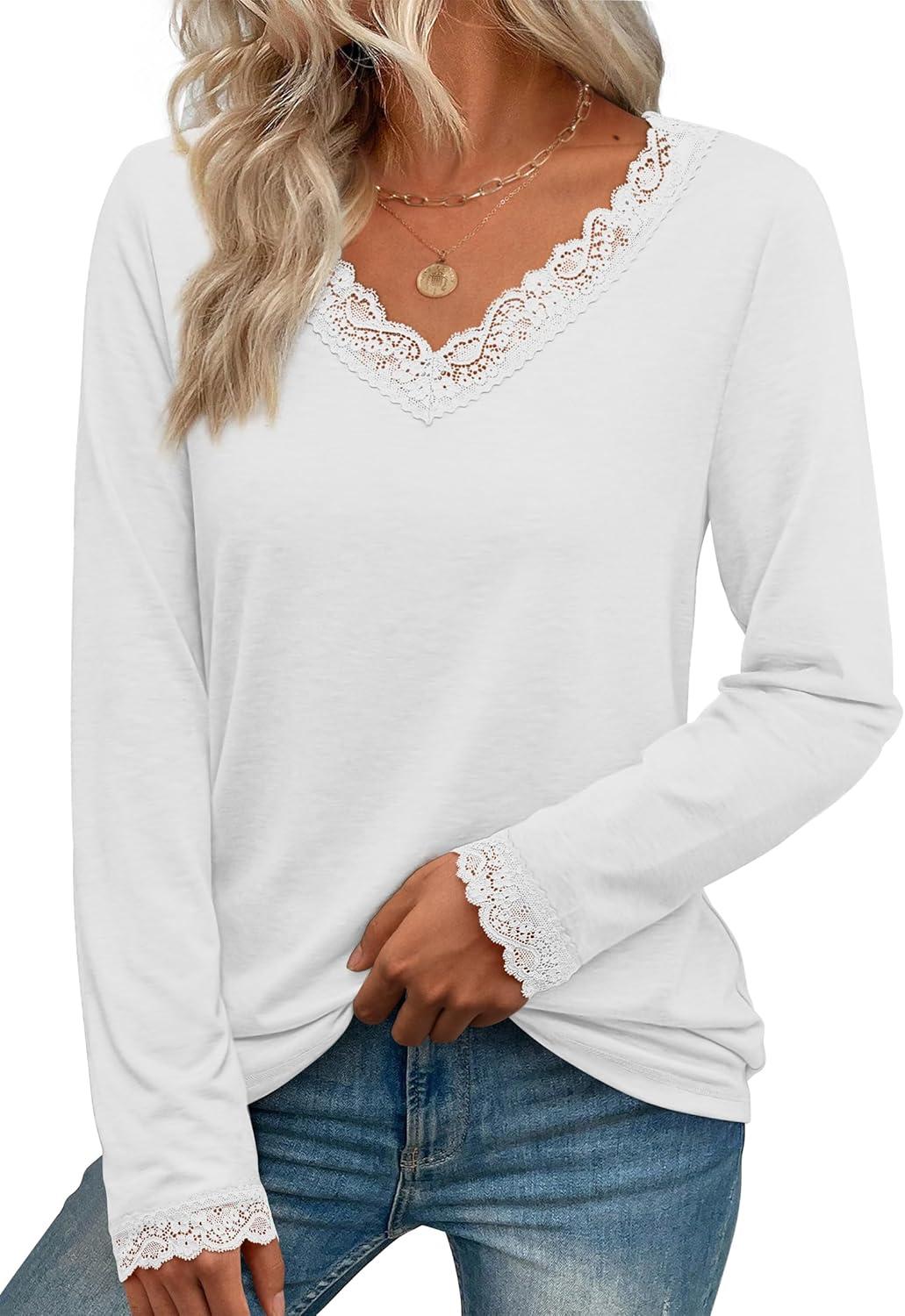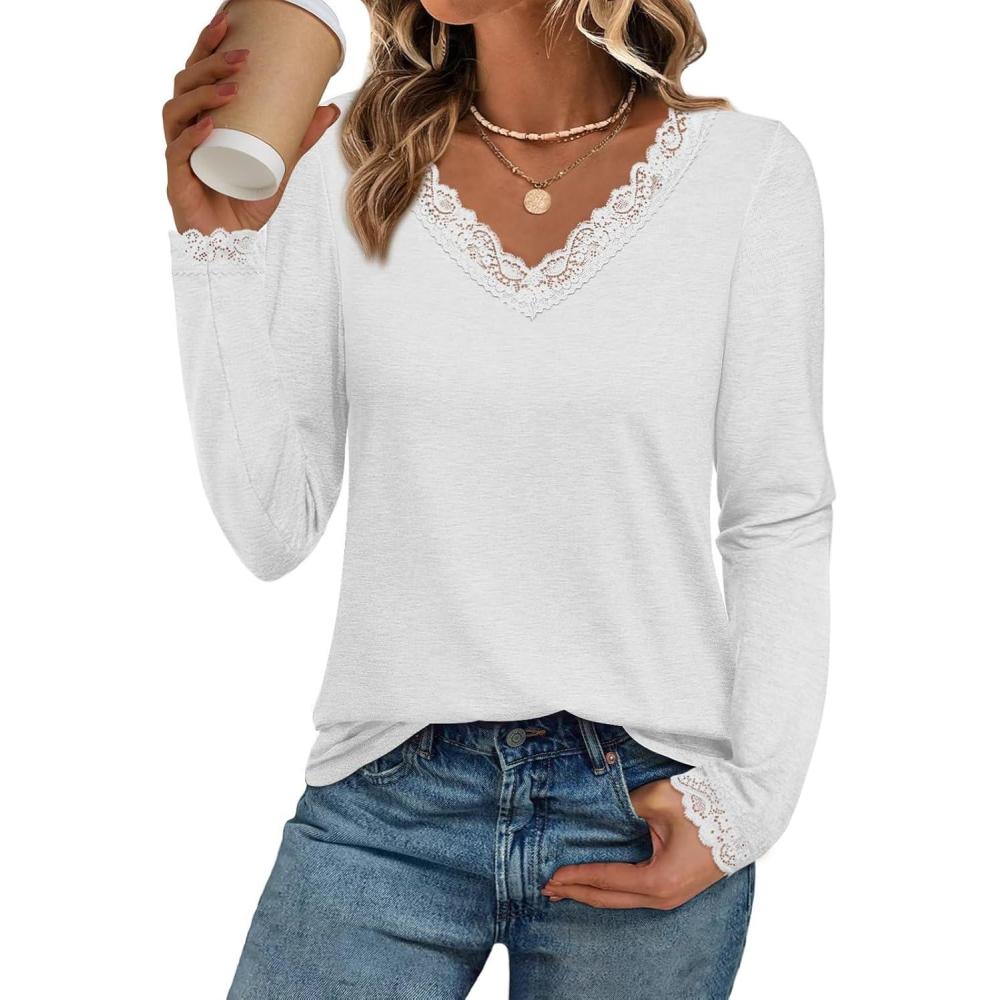 Get the ATHMILE Long Sleeve T Shirts for Women Lace V Neck Casual Cute Tops Loose Fit Fall Winter Basic Clothing(White) you want at a price you can afford with our markdown sale.