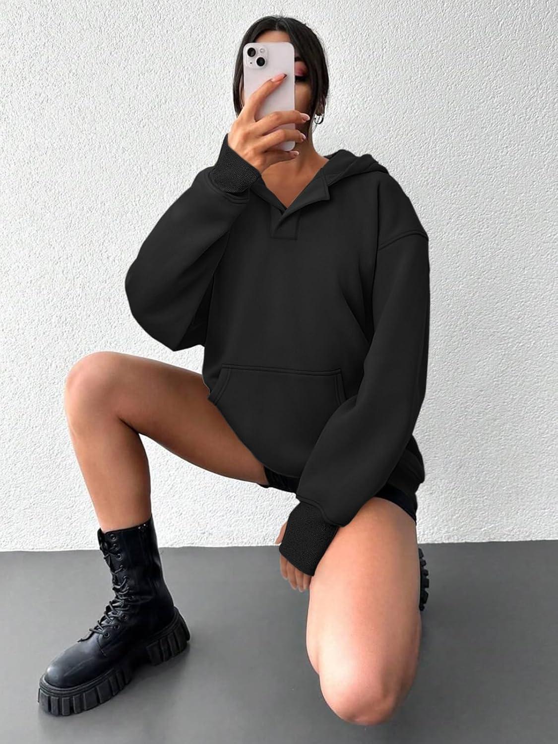ATHMILE Oversized Hoodies for Women Fashion V Neck Pullover Sweatshirts with Thumb Hole Y2k Clothes Fall Outfits 2025(Black)