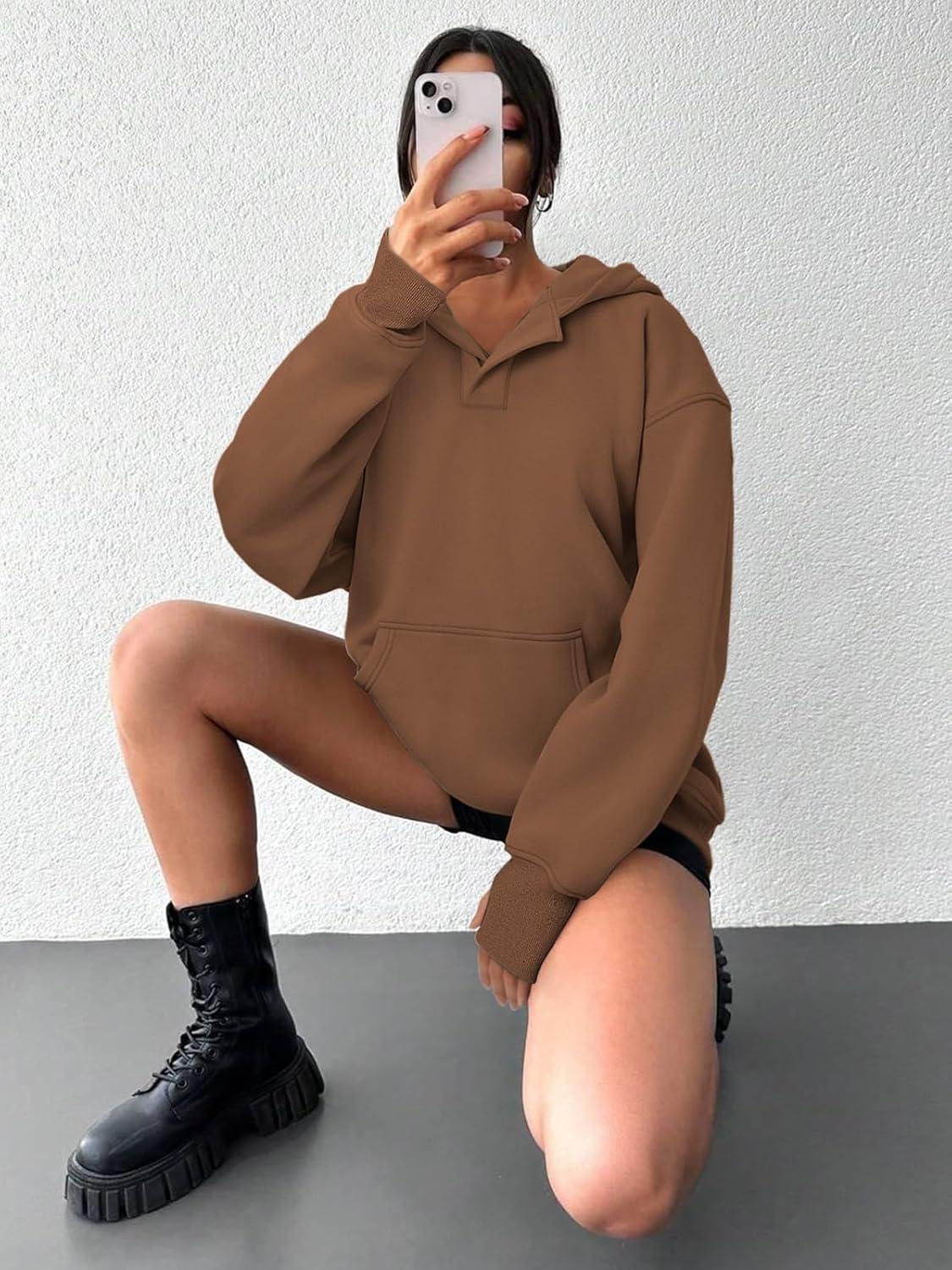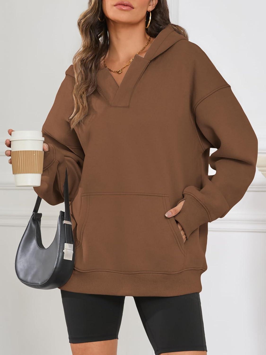 ATHMILE Oversized Hoodies for Women Fashion V Neck Pullover Sweatshirts with Thumb Hole Y2k Clothes Fall Outfits 2025(Coffee)