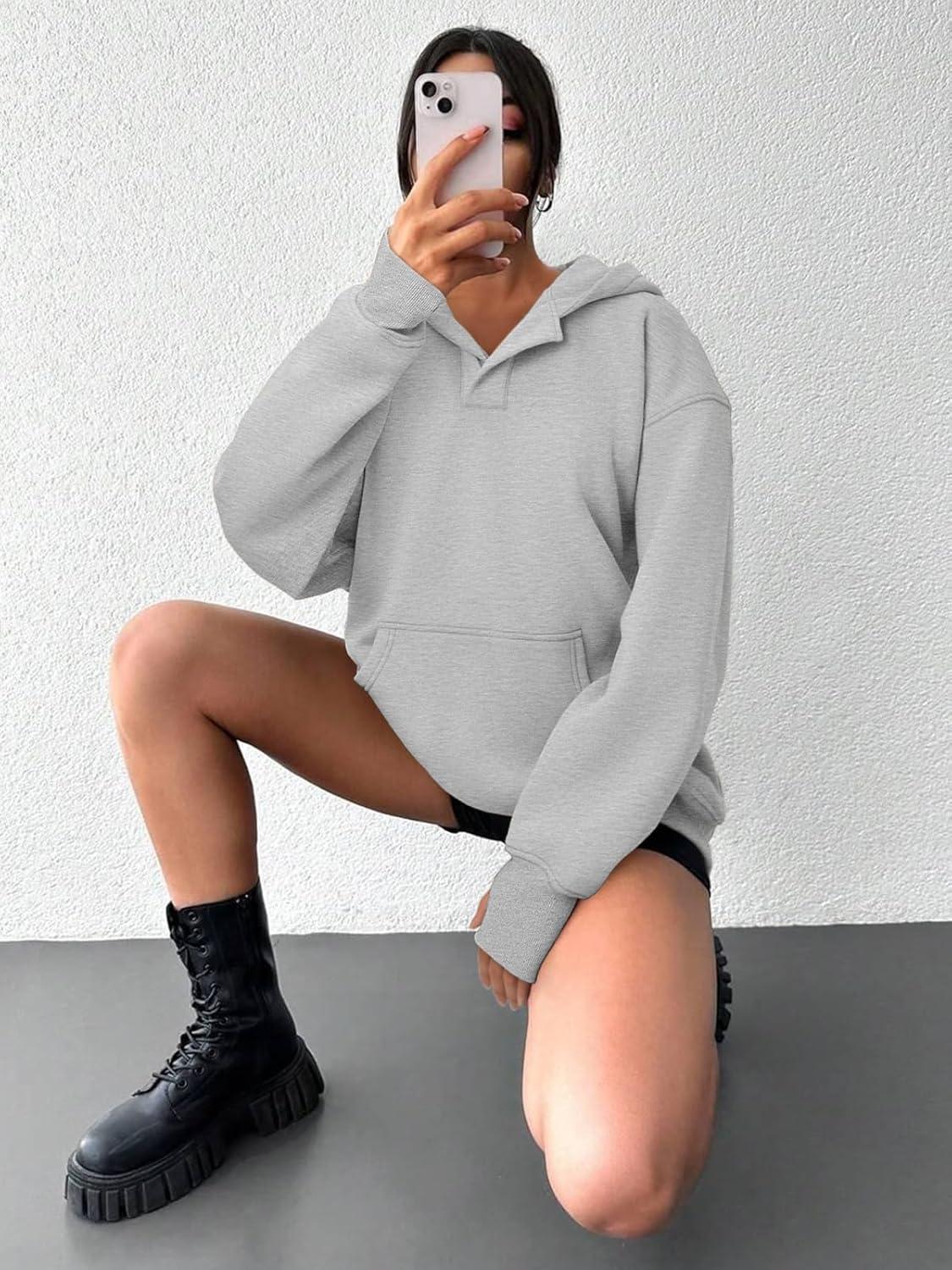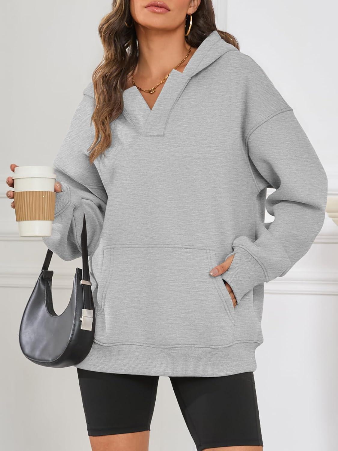 ATHMILE Oversized Hoodies for Women Fashion V Neck Pullover Sweatshirts with Thumb Hole Y2k Clothes Fall Outfits 2025(Light Gray)