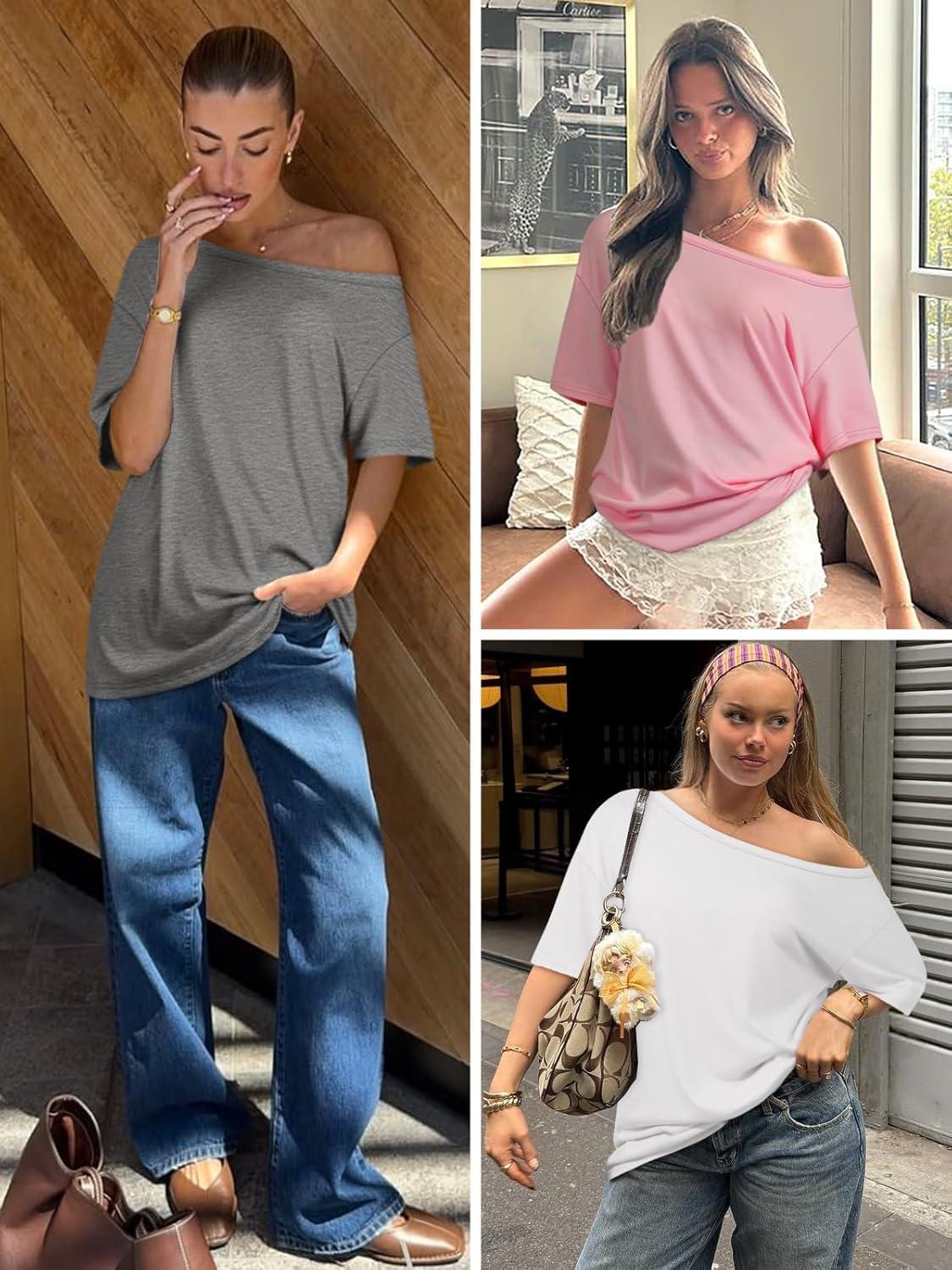 ATHMILE Oversized T-Shirts for Womens Off The Shoulder Tops Short Sleeve Tees Summer 2025 Casual Spring Fashion Clothes(Darkgrey)