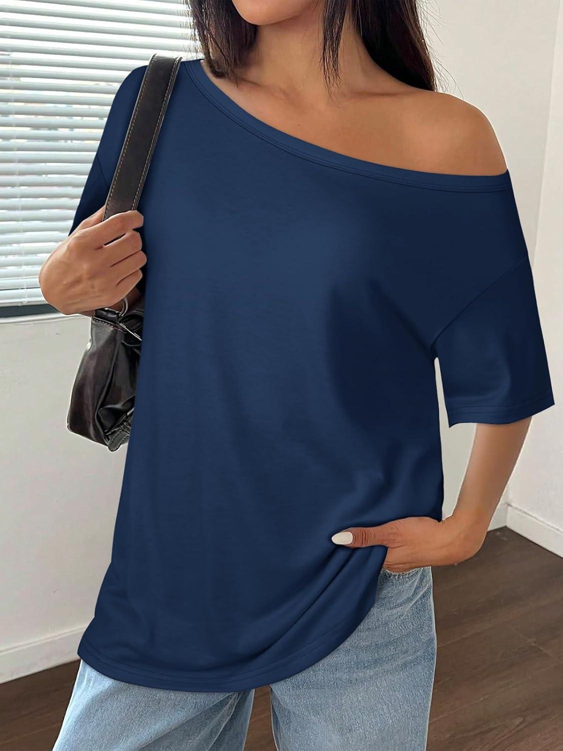 ATHMILE Oversized T-Shirts for Womens Off The Shoulder Tops Short Sleeve Tees Summer 2025 Casual Spring Fashion Clothes(Blue)