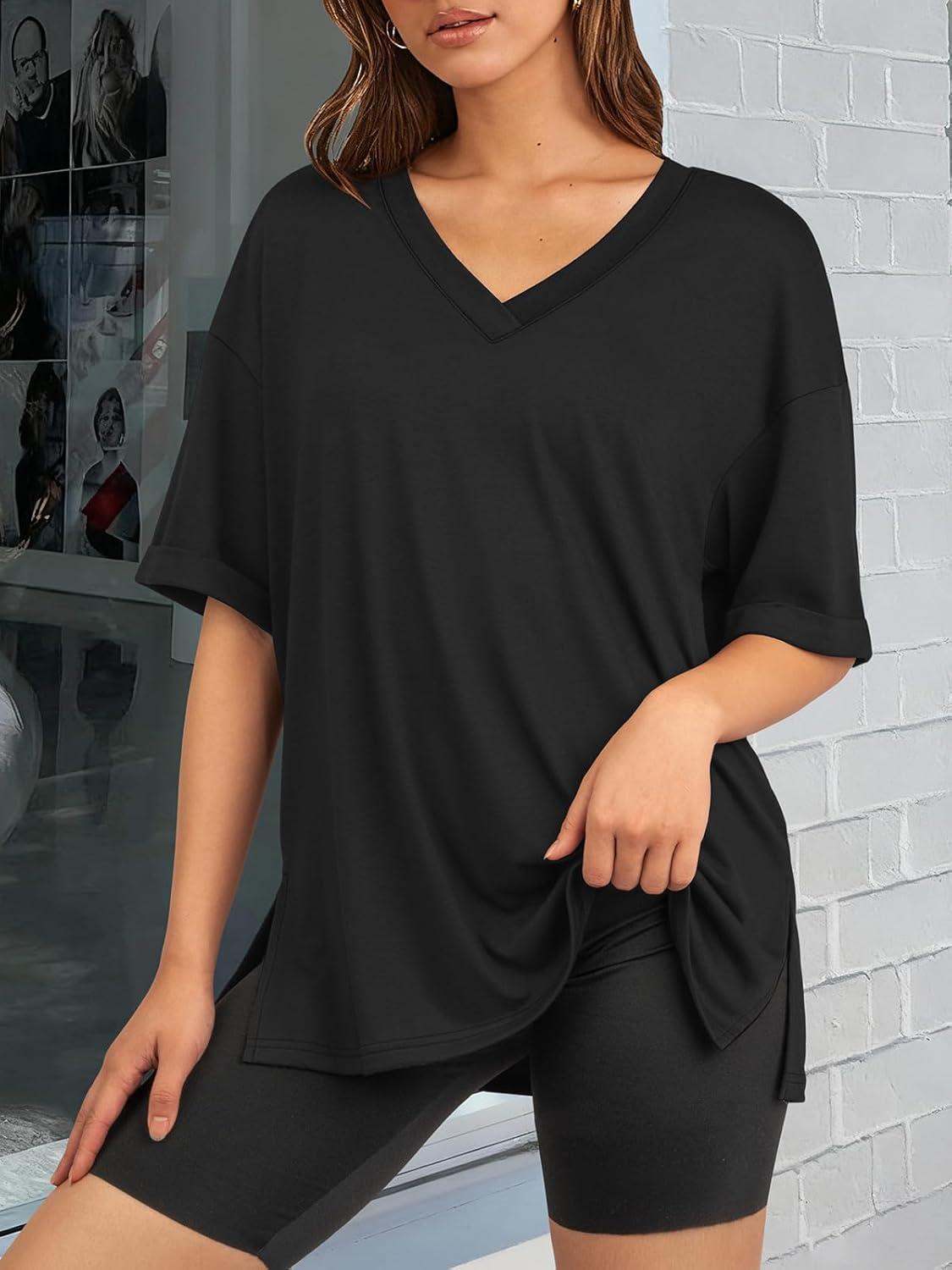 ATHMILE Oversized Tshirts for Women Summer 2026 V Neck Casual Workout Plus Size Tops Spring Fashion Cute Basic Trendy Outfits(Black)