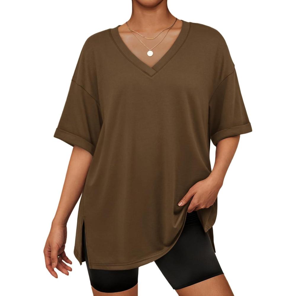 ATHMILE Oversized Tshirts for Women Summer 2026 V Neck Casual Workout Plus Size Tops Spring Fashion Cute Basic Trendy Outfits(Brown)