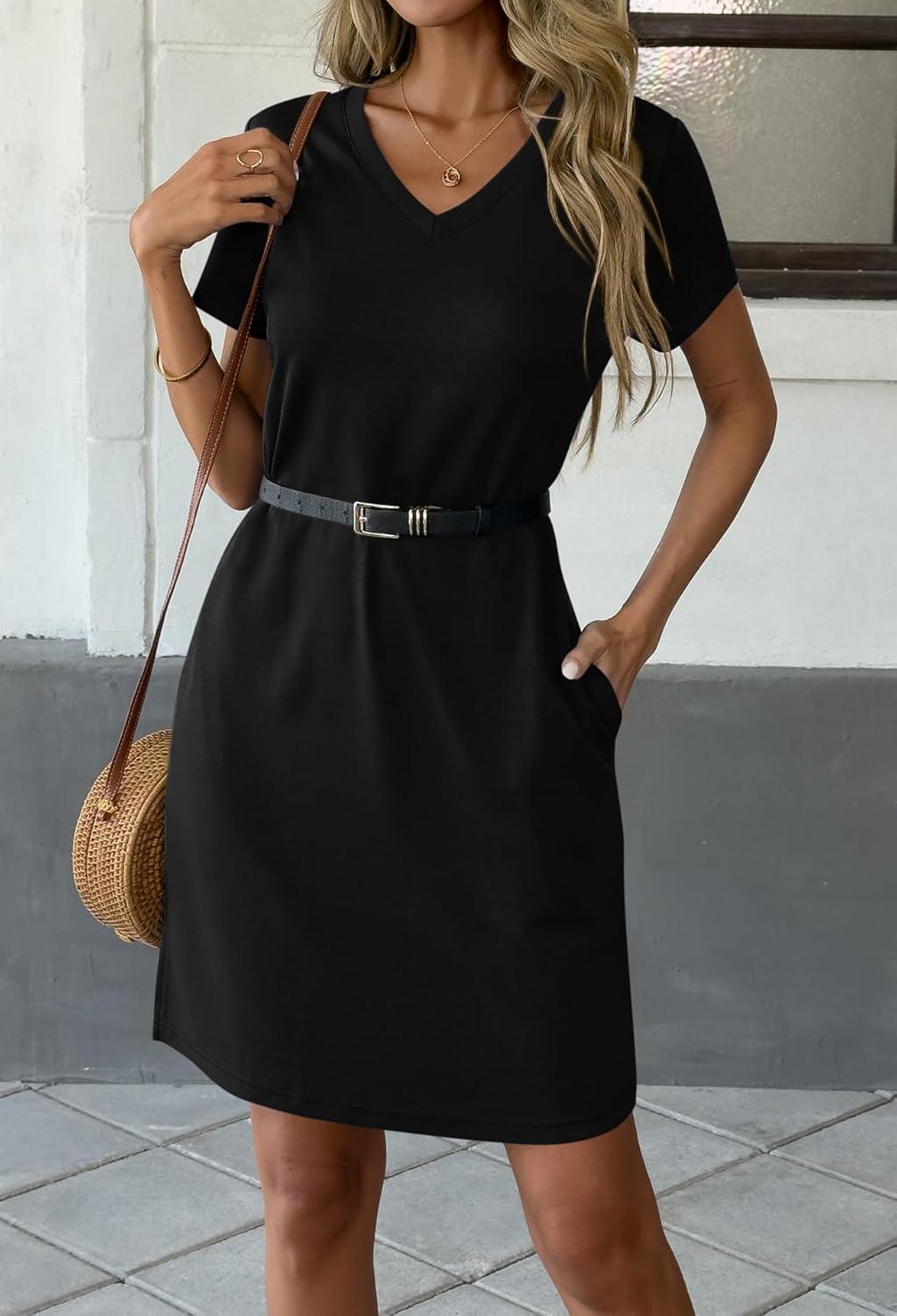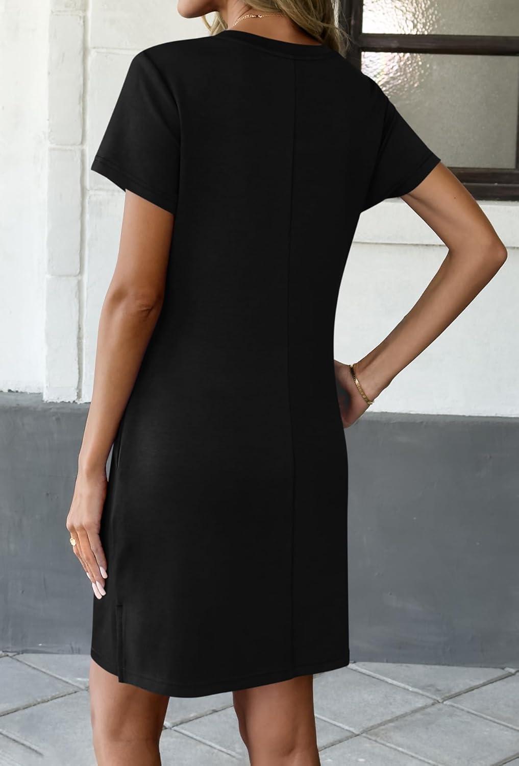 ATHMILE Summer Casual Dresses for Women V-Neck Beach Vacation Clothes Short Sleeve Split Hem Sundress with Pockets(Black)