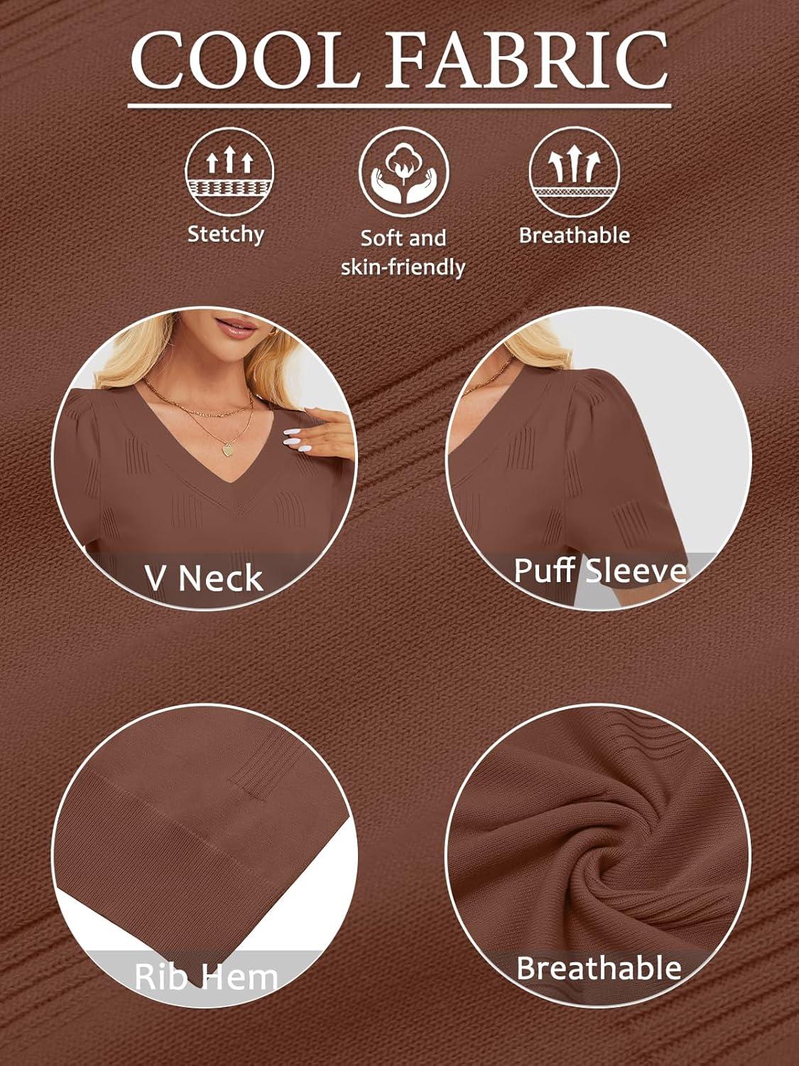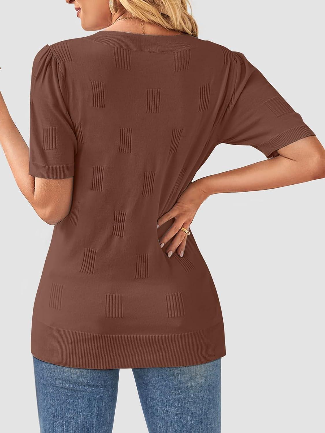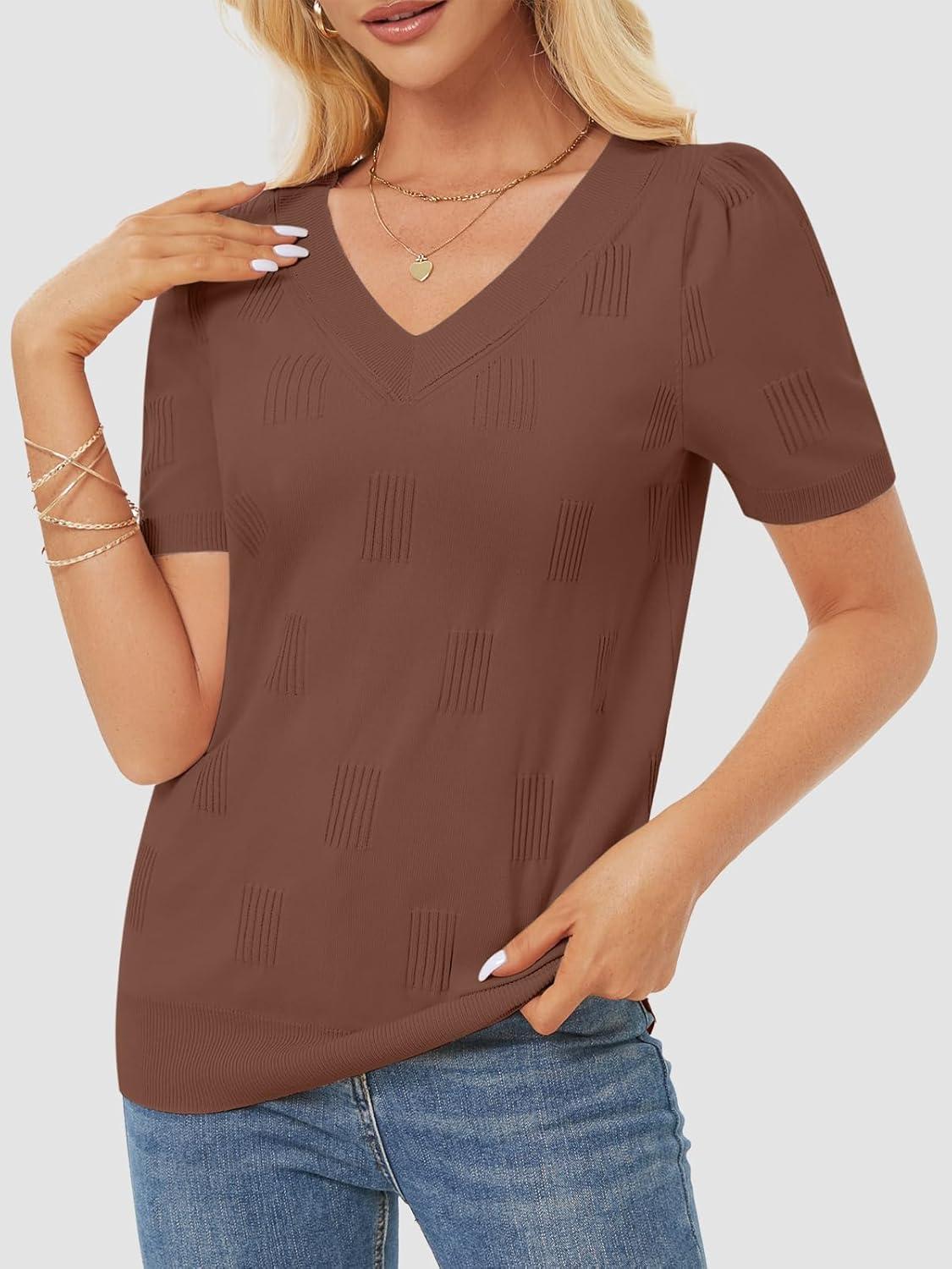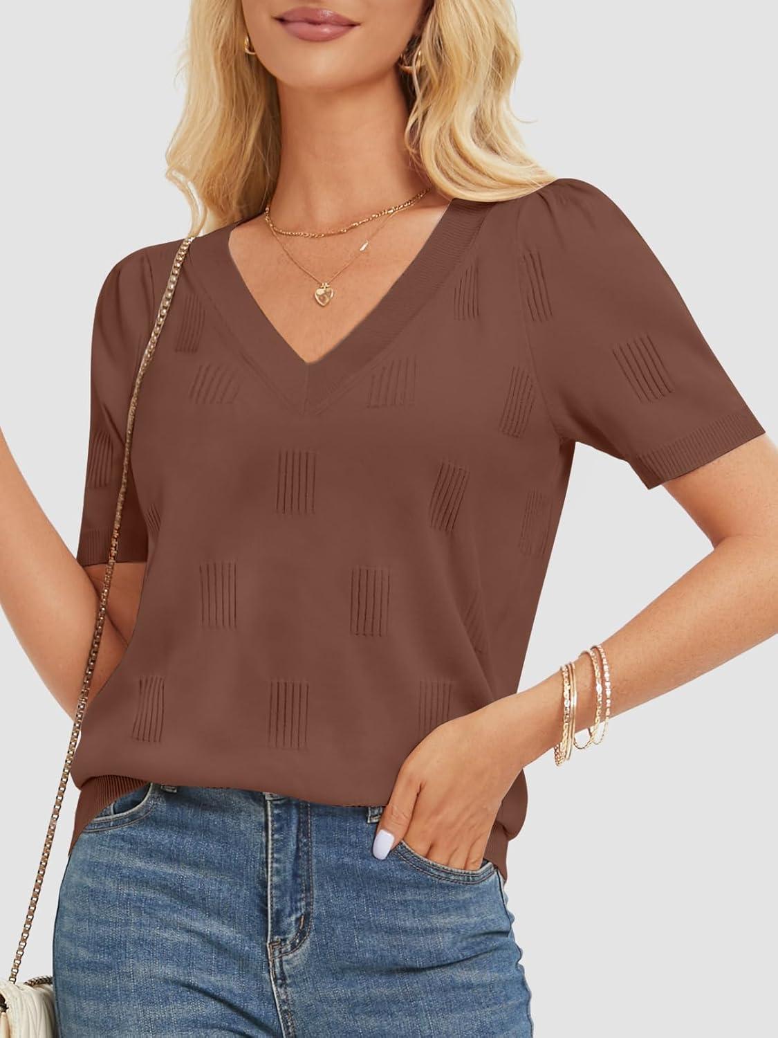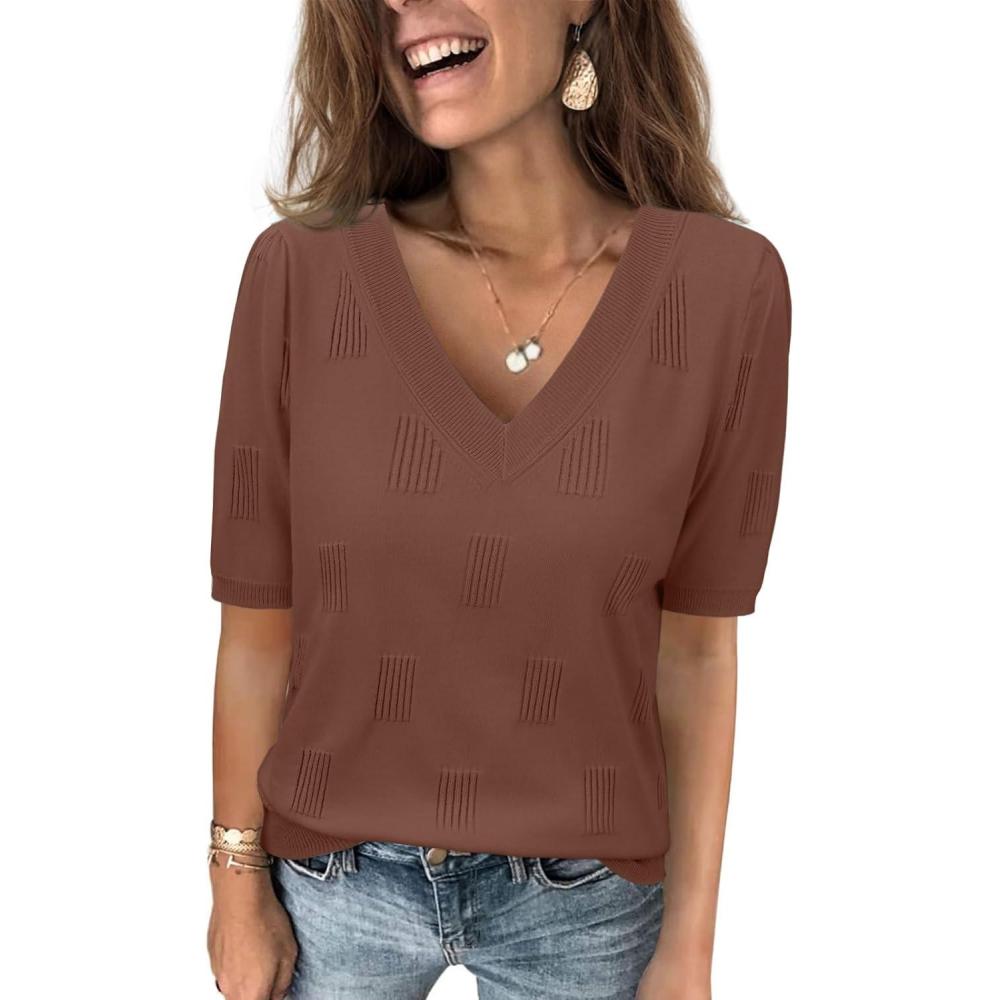 ATHMILE Summer Tops for Women 2025 Short Sleeve V Neck Sweaters Dressy Casual Blouses Lightweight Thin Knit Fashion Shirts(Rust)