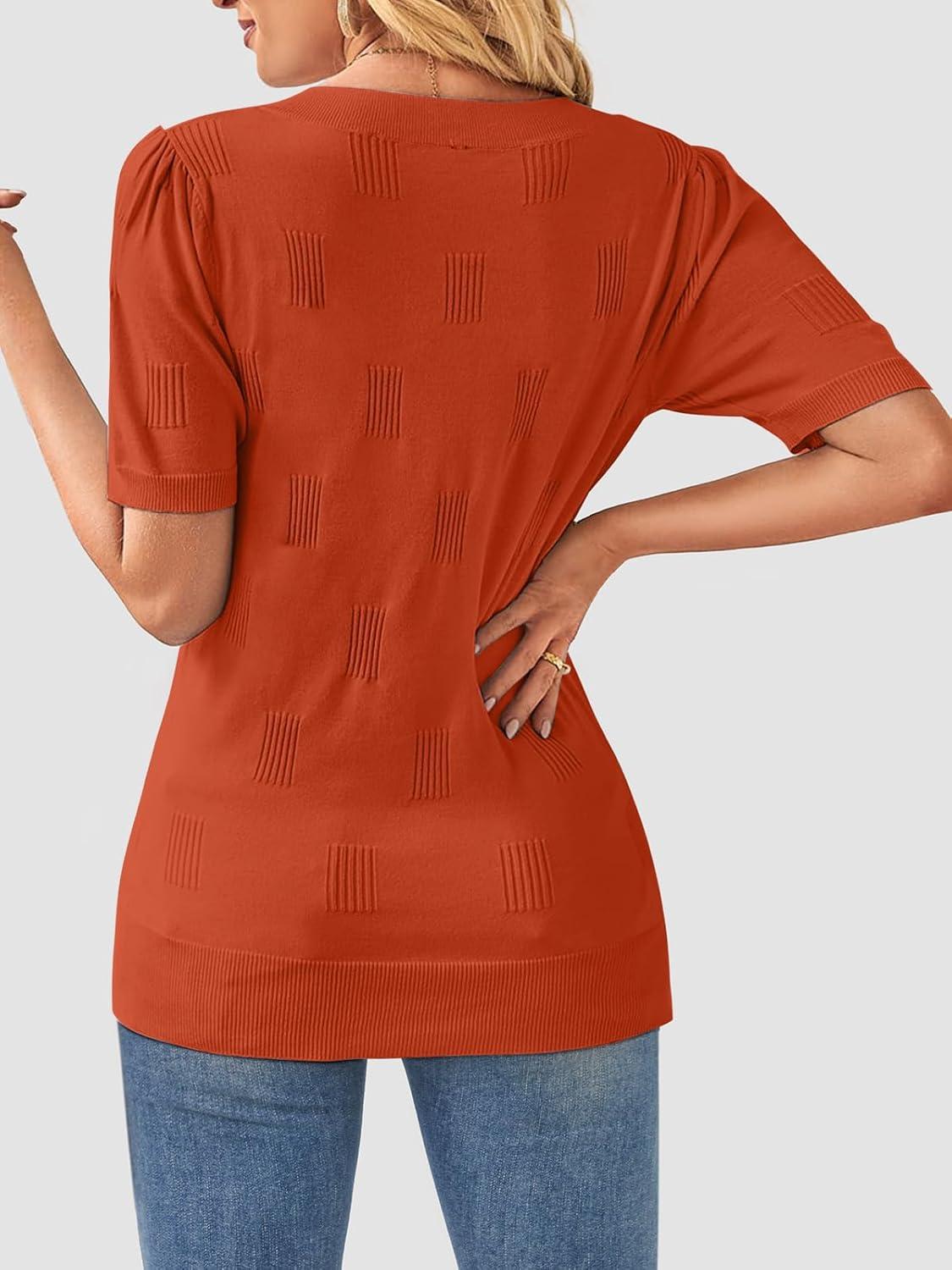 ATHMILE Summer Tops for Women 2025 Short Sleeve V Neck Sweaters Dressy Casual Blouses Lightweight Thin Knit Fashion Shirts(Rust)