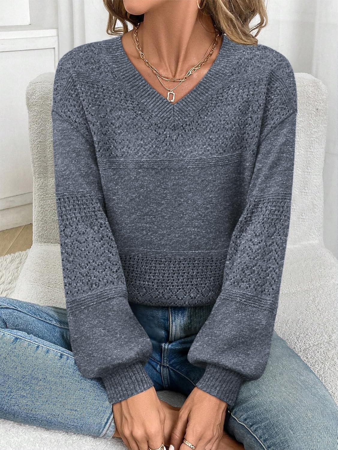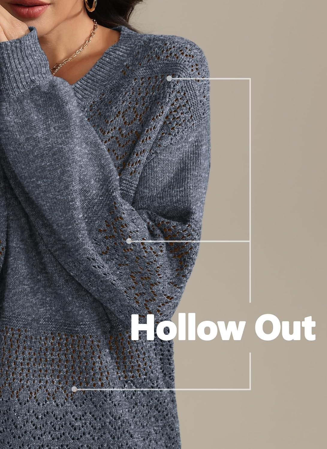ATHMILE Sweaters for Women Fall Outfits Oversized Long Sleeve V Neck Crochet Sweaters Lightweight Knit Pullover Jumper(Blue)