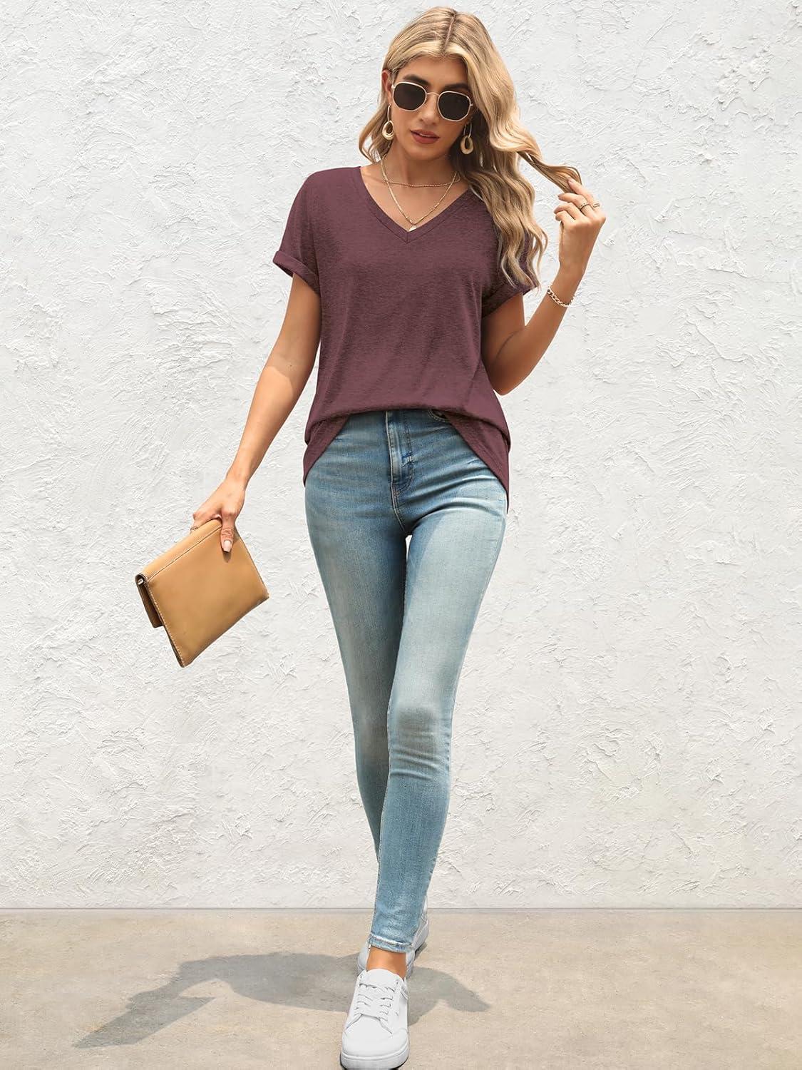 ATHMILE T Shirts Short Sleeve V Neck Tees for Women Fashion Tops Trendy Lightweight Casual Summer Outfits Clothes 2025 Beach(Winered)