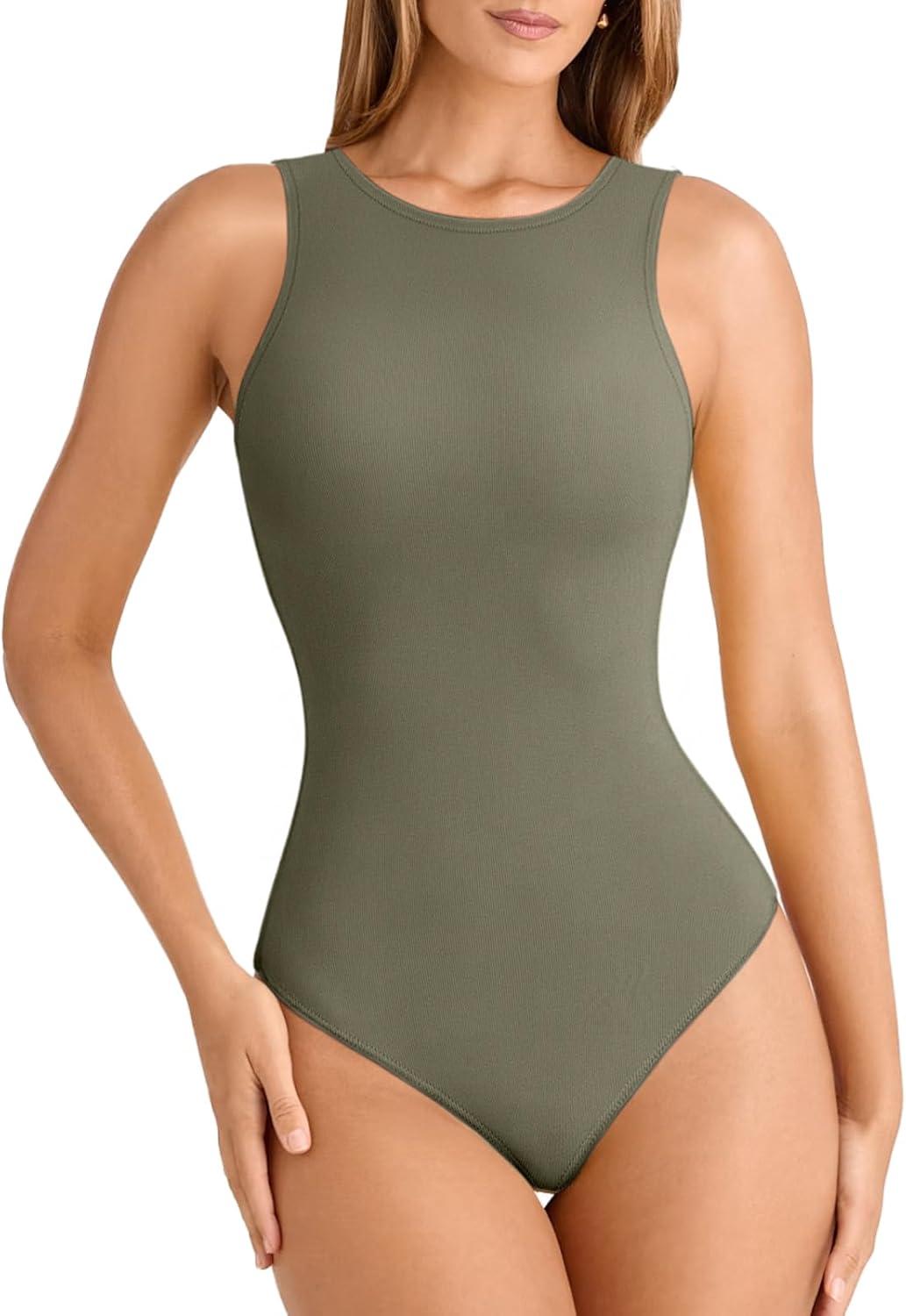 ATHMILE Tank Top Body Suits Women Sexy Crew Neck Racerback Halter Ribbed Sleeveless Bodysuit for Women(Grey Green)
