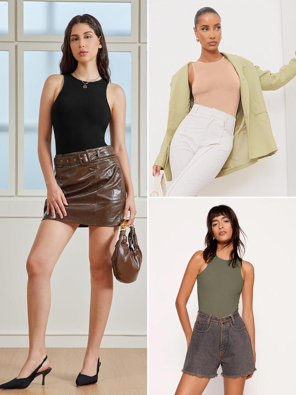 ATHMILE Tank Top Body Suits Women Sexy Crew Neck Racerback Halter Ribbed Sleeveless Bodysuit for Women(Mocha)