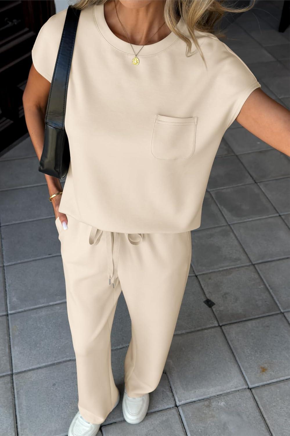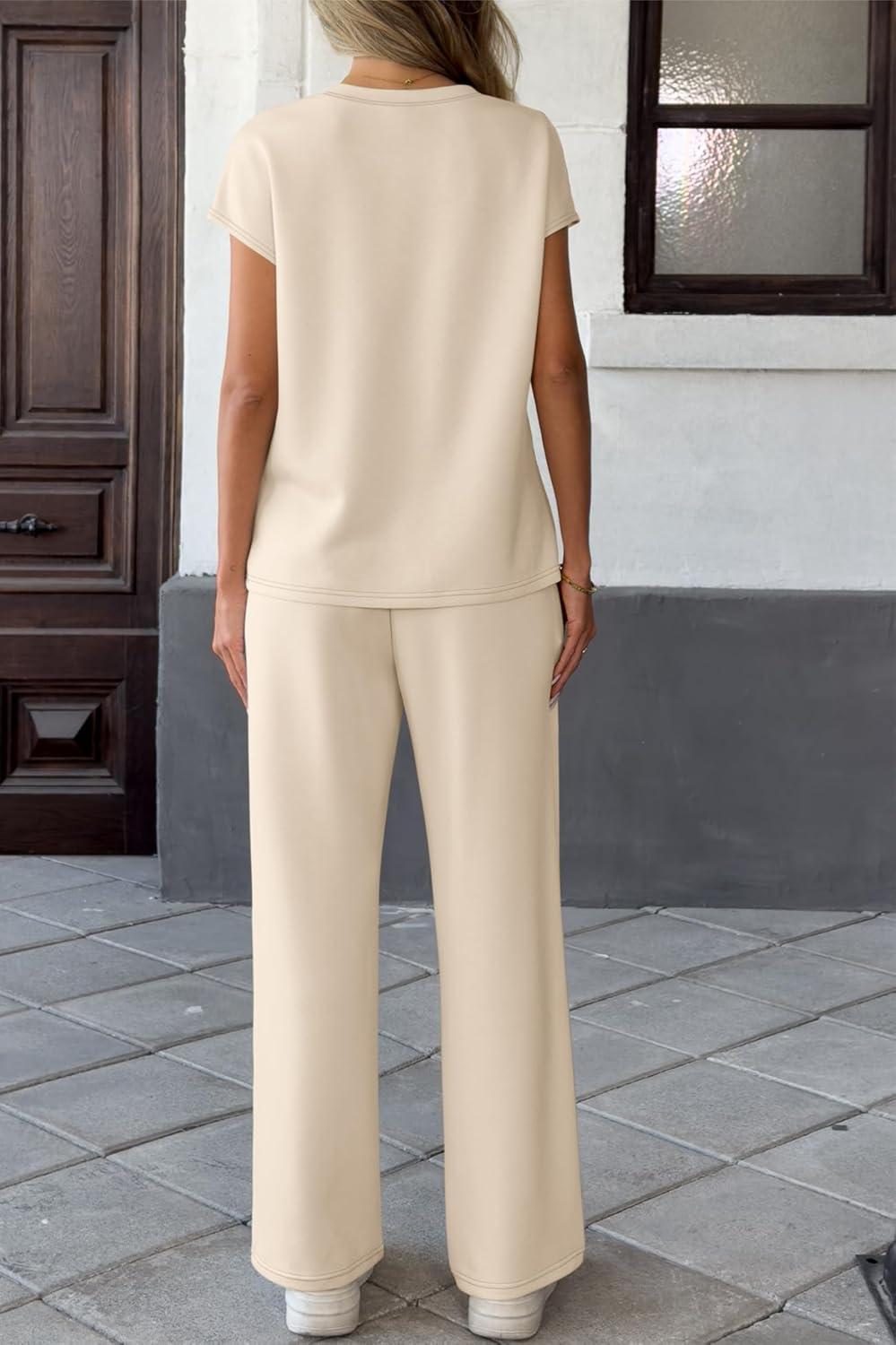 ATHMILE Two Piece Sets for Women Casual Summer Travel Outfits Cap Sleeve Vacation Cap Sleeve Wide Leg Pants Lounge Set(Beige)