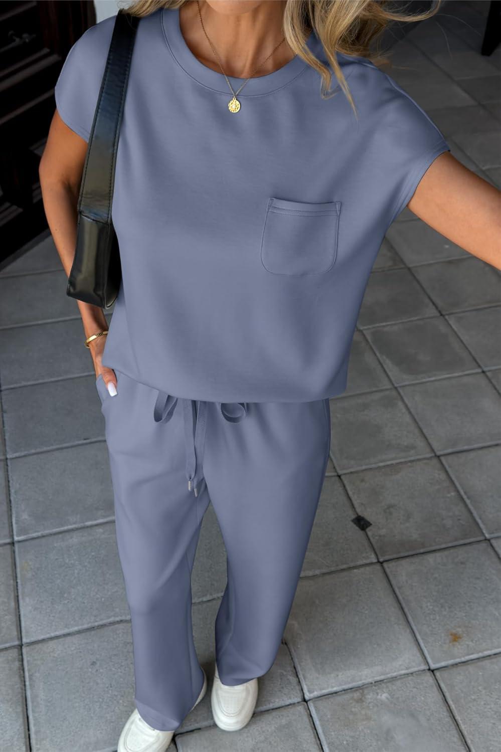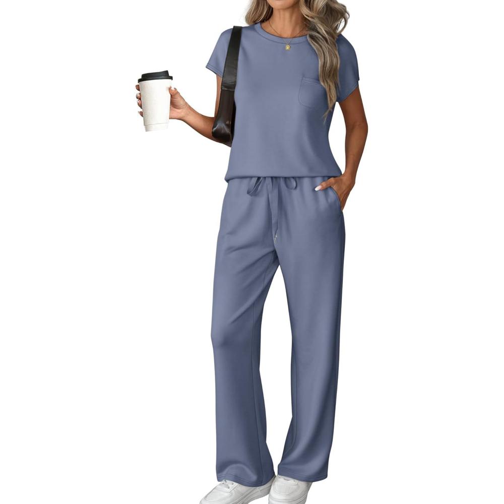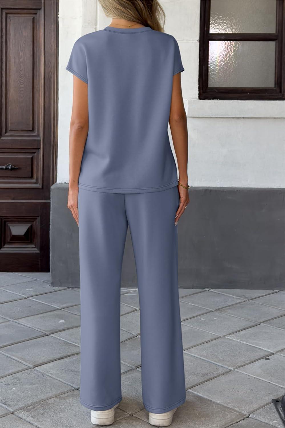 Two Piece Sets for Women Summer Travel Vacation Outfits Cap Sleeve Lounge Matching Sets Wide Leg Pants