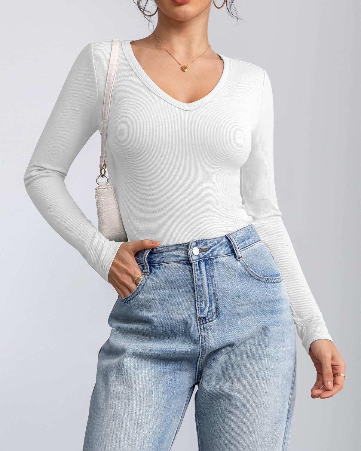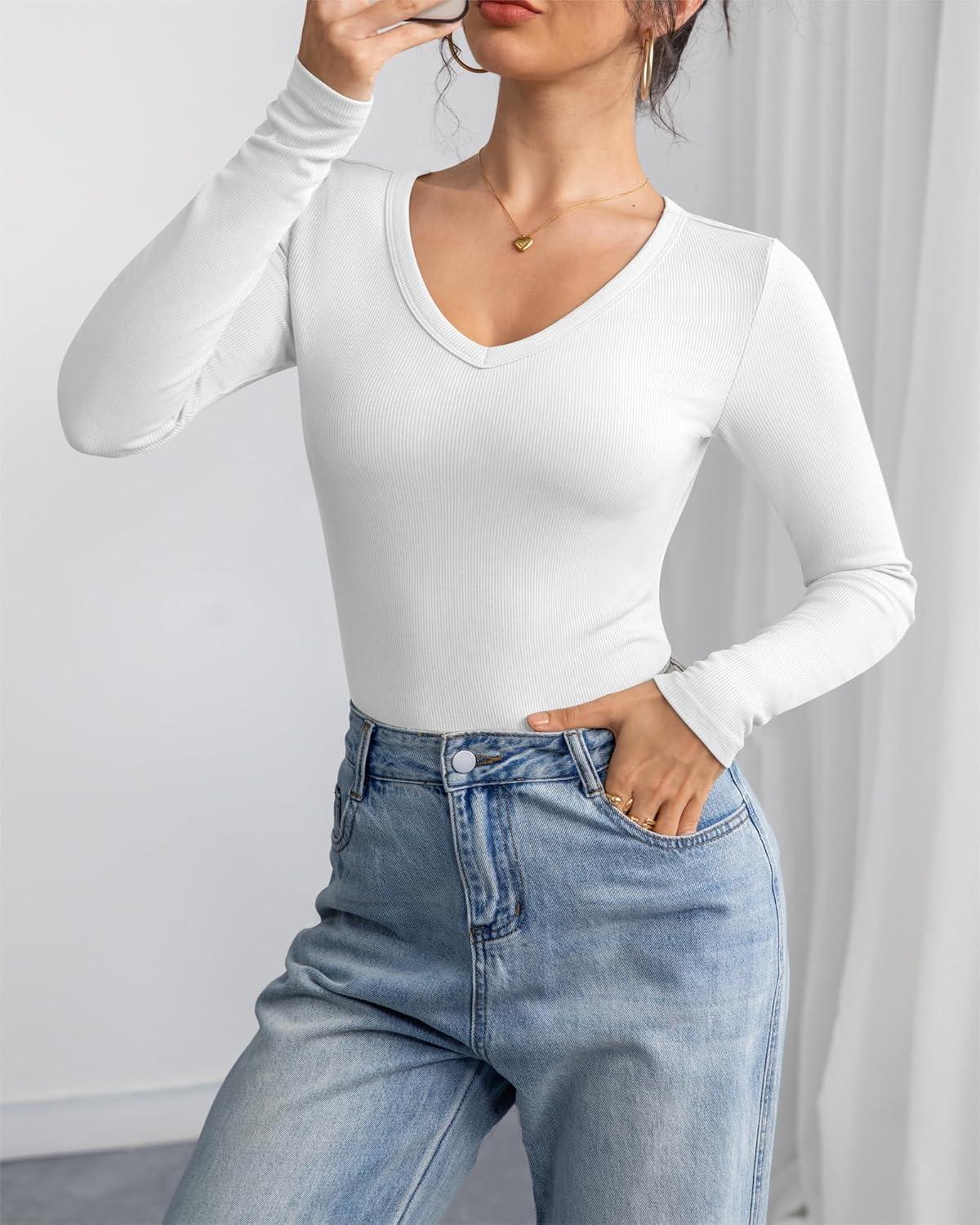 ATHMILE Women Short Sleeve V Neck Ribbed Knit Fitted Shirts Basic Tees Tops 2025 Summer Casual T-Shirts Going Out Outfits(L-white)