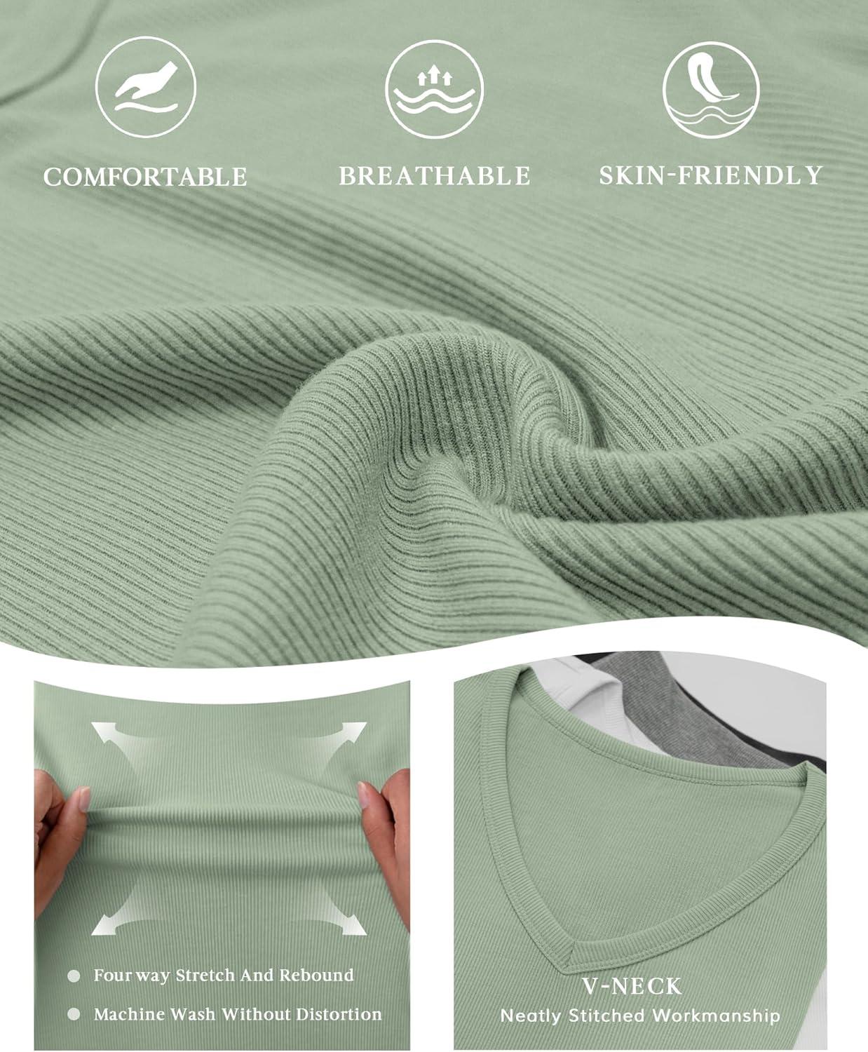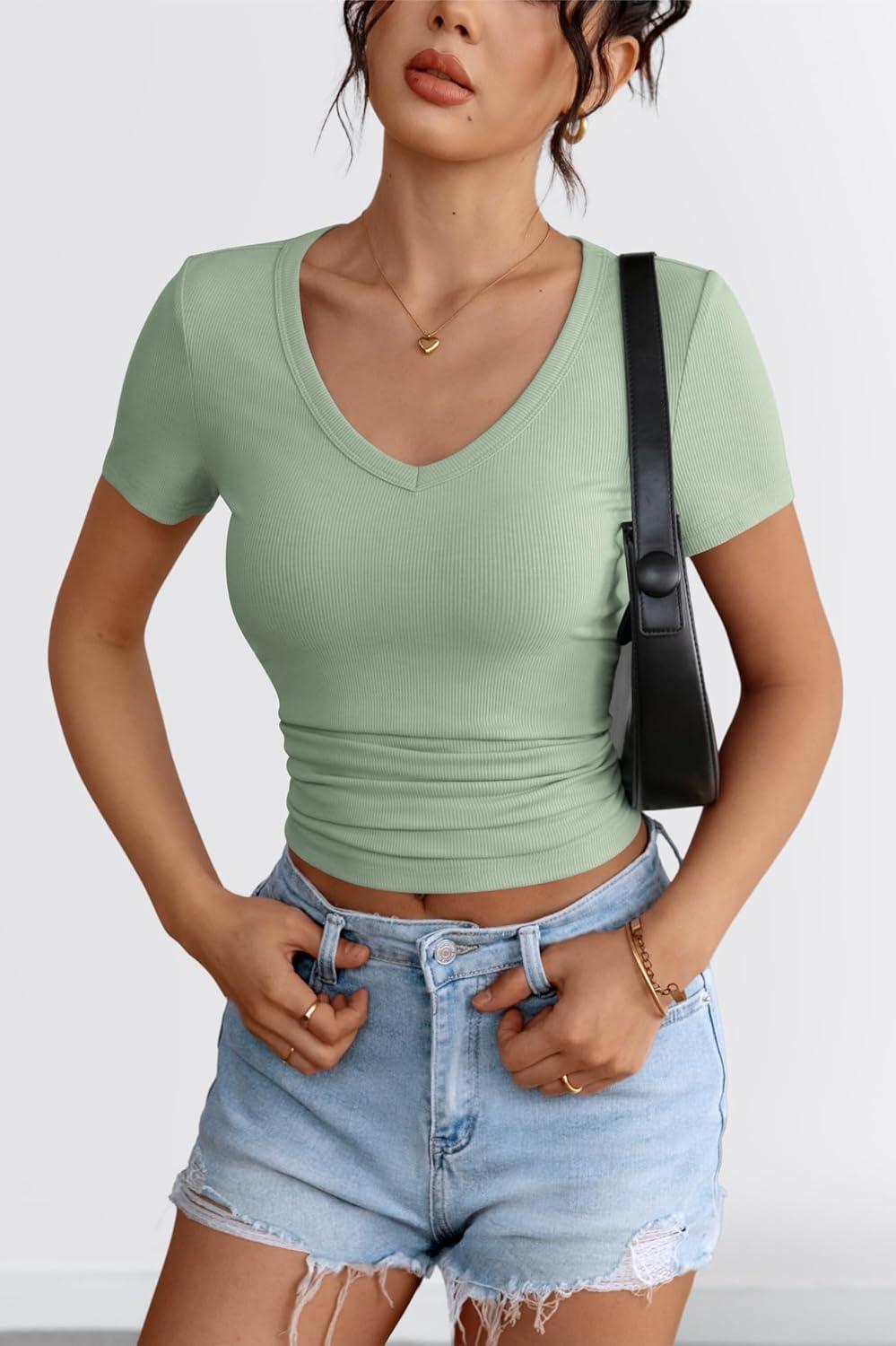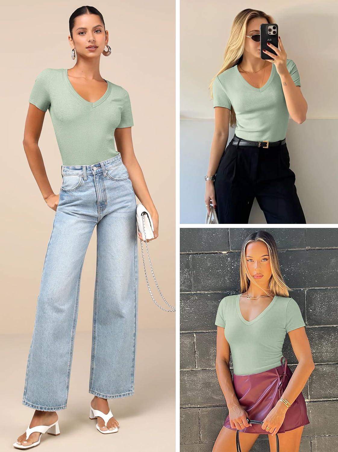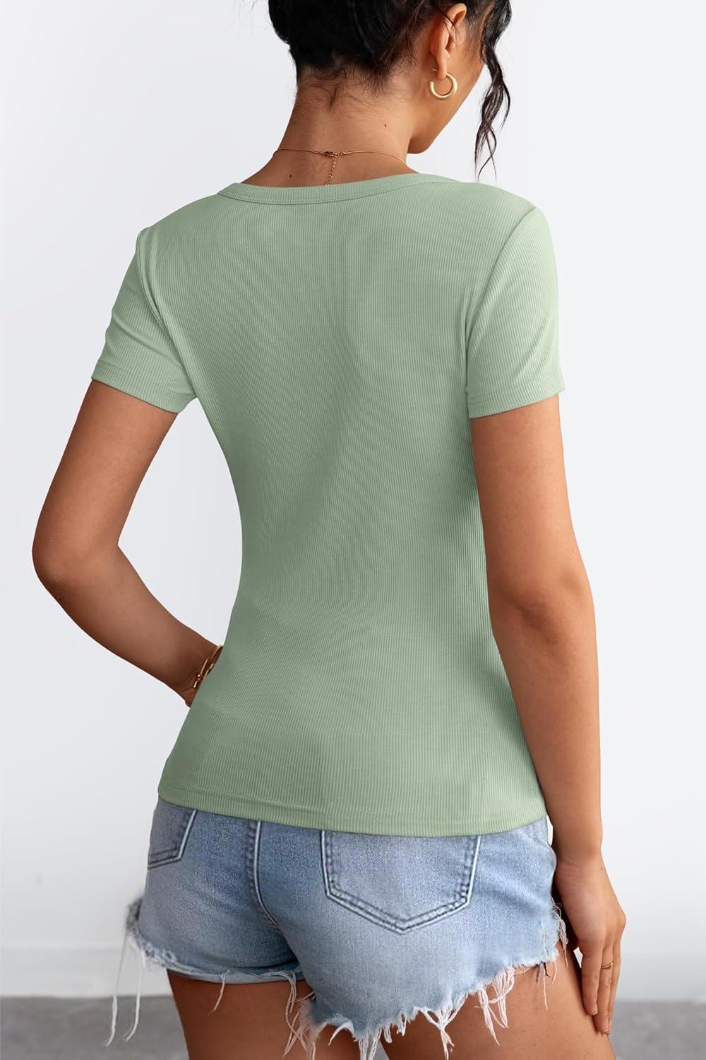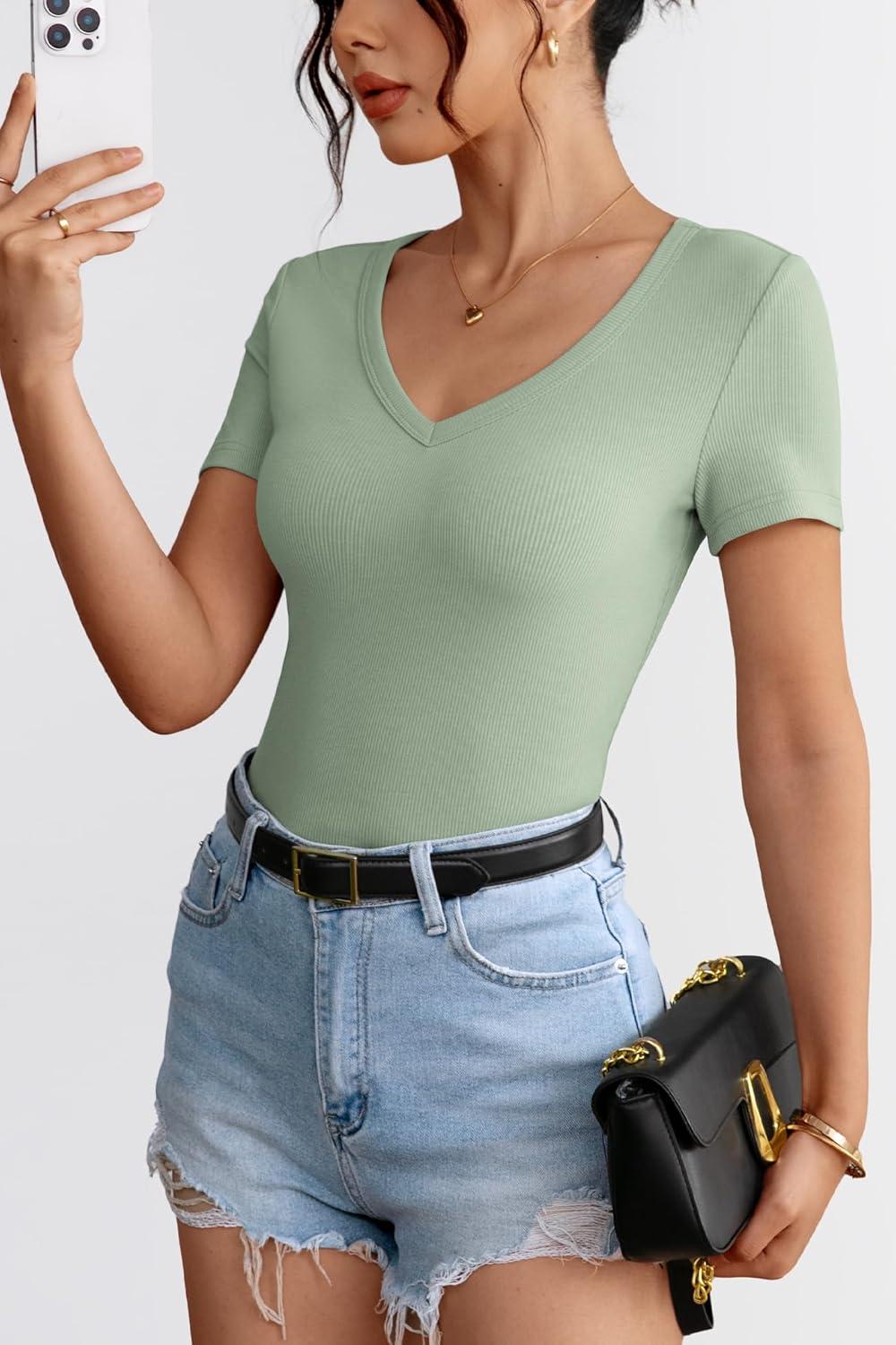 ATHMILE Women Short Sleeve V Neck Ribbed Knit Fitted Shirts Basic Tees Tops 2025 Summer Casual T-Shirts Going Out Outfits(Sage Green)