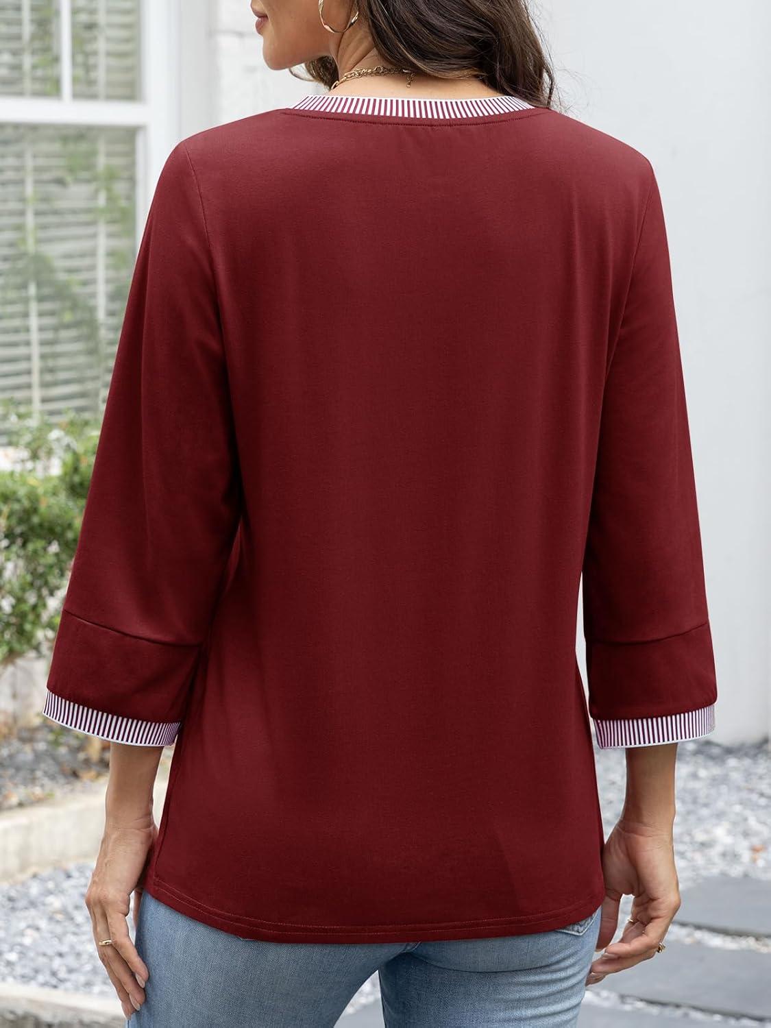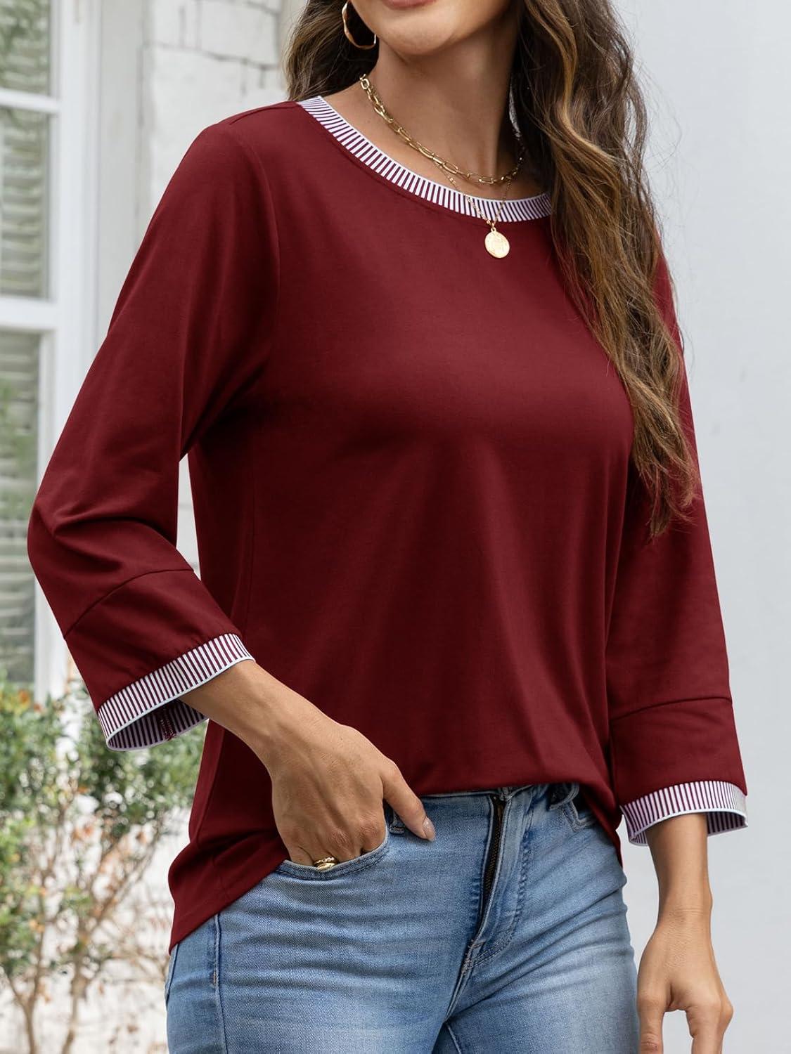 ATHMILE Women's 3/4 Length Sleeve Tops Dressy Casual Striped Crew Neck Fall T Shirts Spring Blouse Summer Tunics(Wine Red)