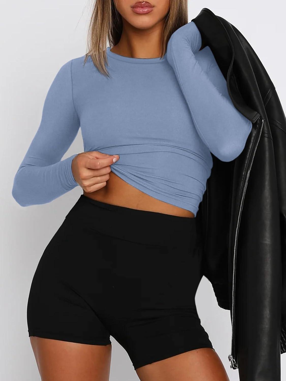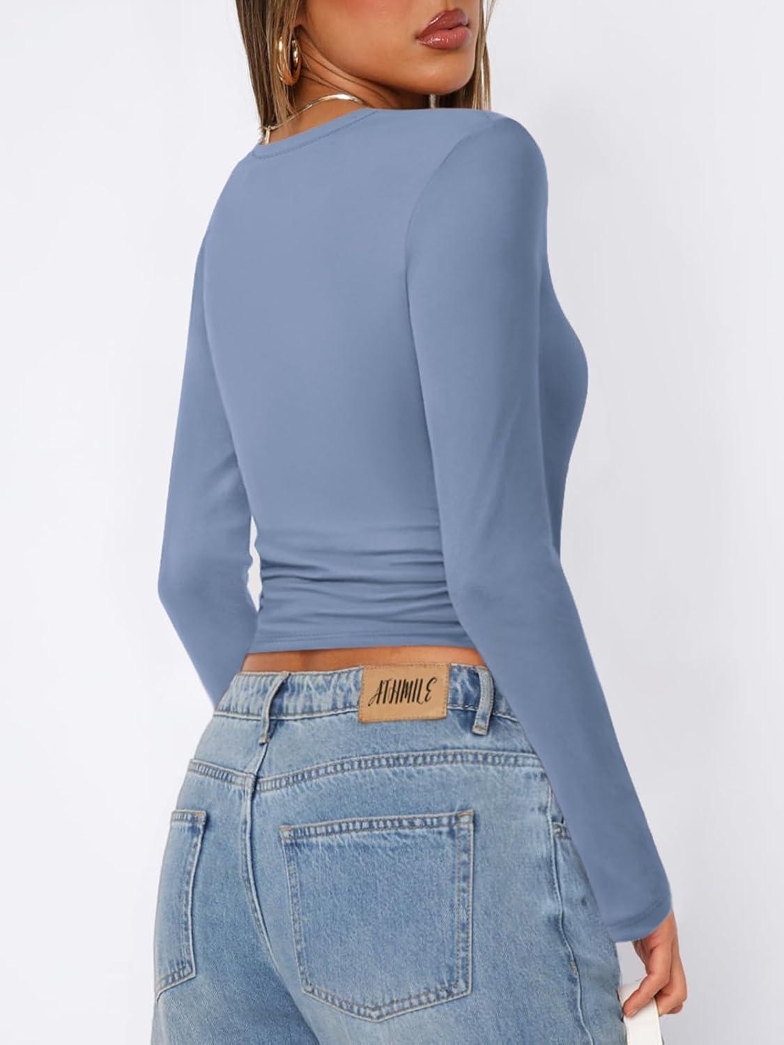 ATHMILE Womens Basic T-Shirts Going Out Crop Tops Tight Slim Fit Cute Teen Girls Short Sleeve/Long Sleeve Y2k Clothes(2-blue Gray)