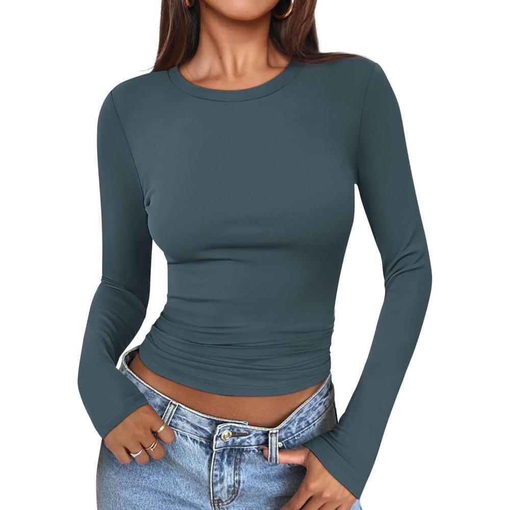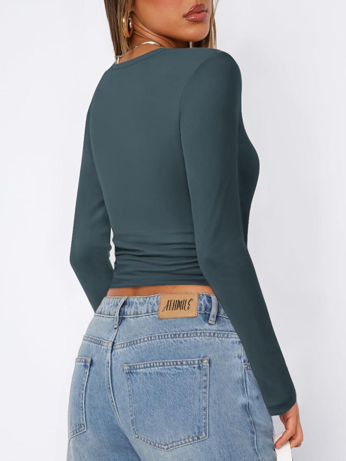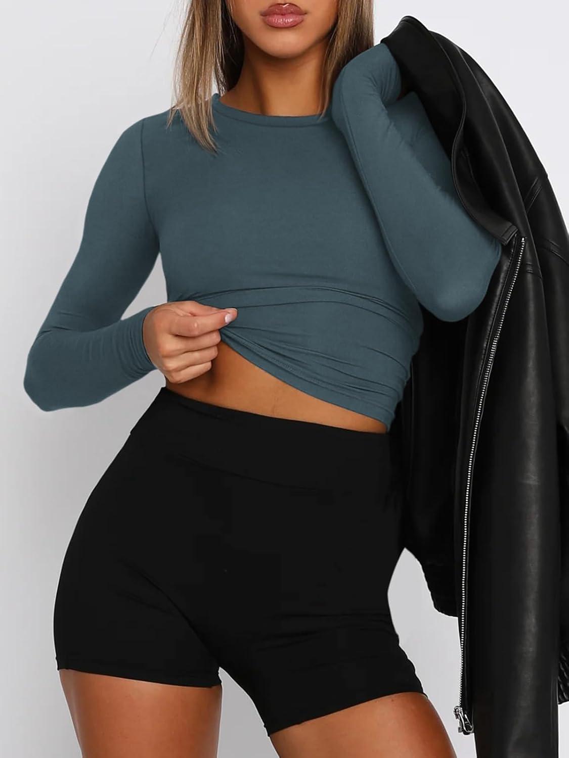ATHMILE Womens Basic T-Shirts Going Out Crop Tops Tight Slim Fit Cute Teen Girls Short Sleeve/Long Sleeve Y2k Clothes(2-haze Blue)