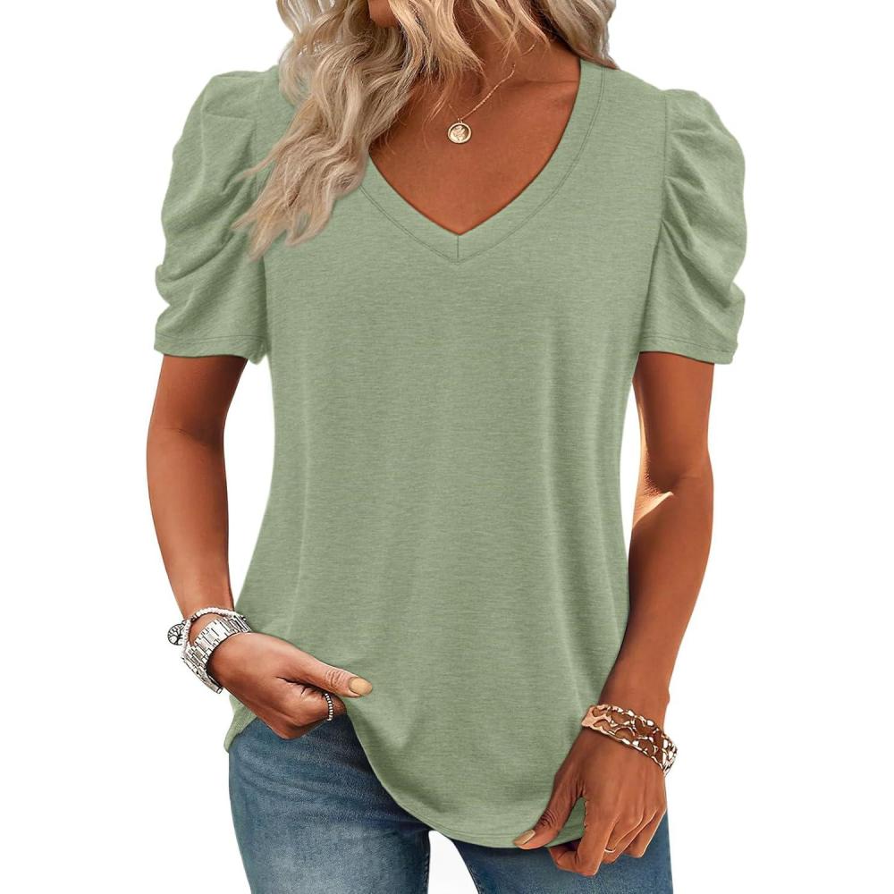 ATHMILE Womens Blouse Dressy Casual V Neck Puff Short Sleeve Tshirts Boho Fashion Summer Spring Tunic Top Clothes(Grey Green)