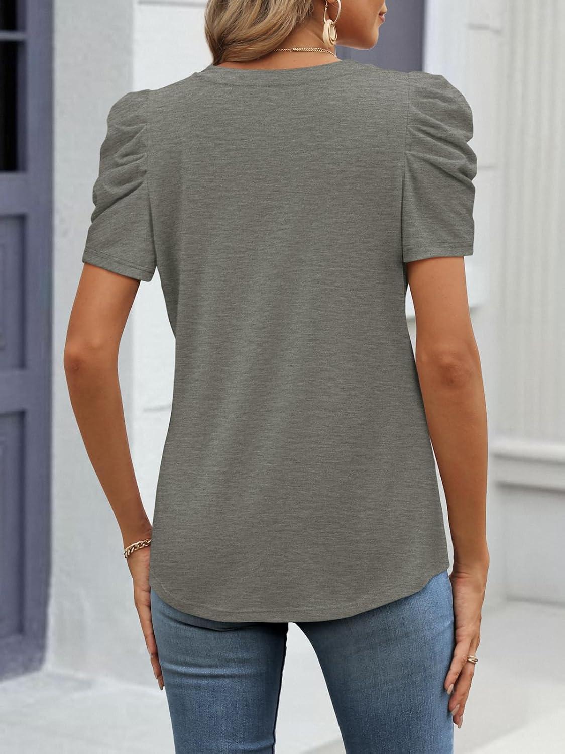 ATHMILE Womens Blouse Dressy Casual V Neck Puff Short Sleeve Tshirts Boho Fashion Summer Spring Tunic Top Clothes(Grey)