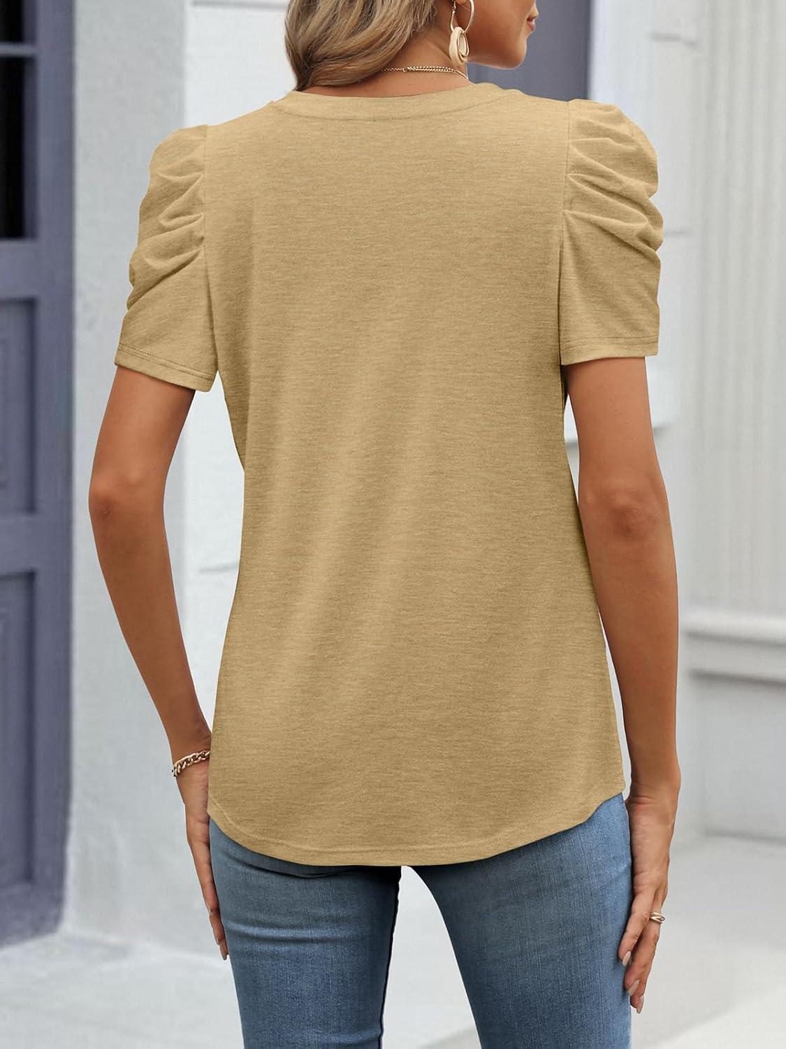 ATHMILE Womens Blouse Dressy Casual V Neck Puff Short Sleeve Tshirts Boho Fashion Summer Spring Tunic Top Clothes(Khaki)