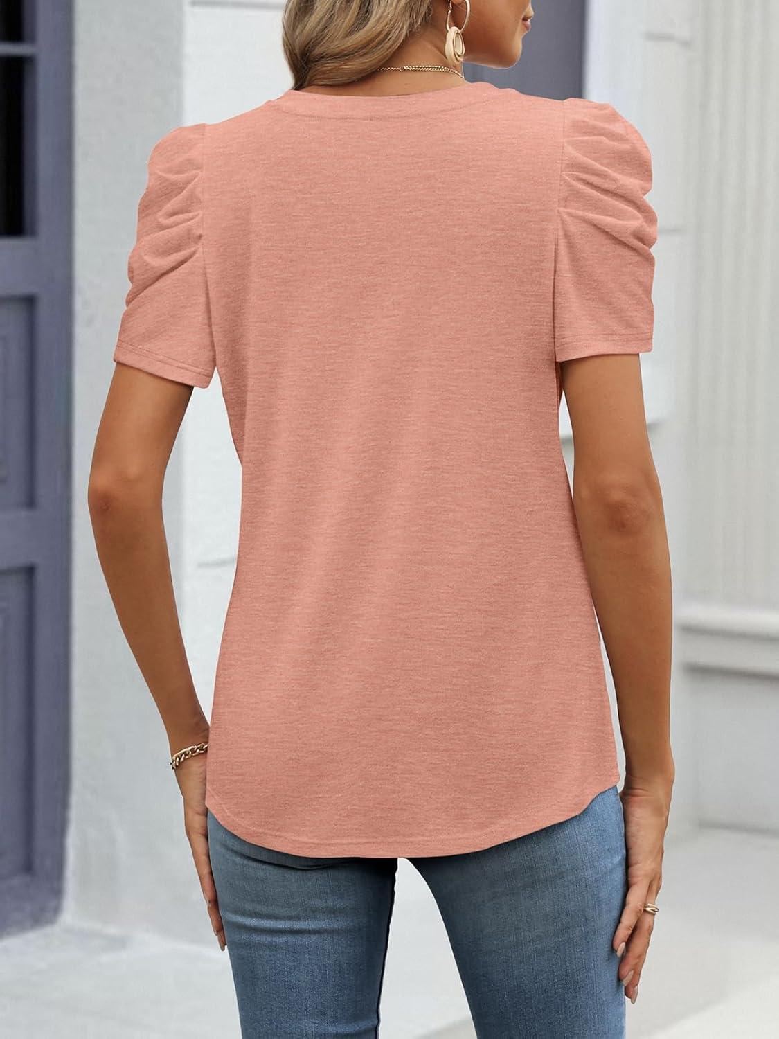 ATHMILE Womens Blouse Dressy Casual V Neck Puff Short Sleeve Tshirts Boho Fashion Summer Spring Tunic Top Clothes(Pink)