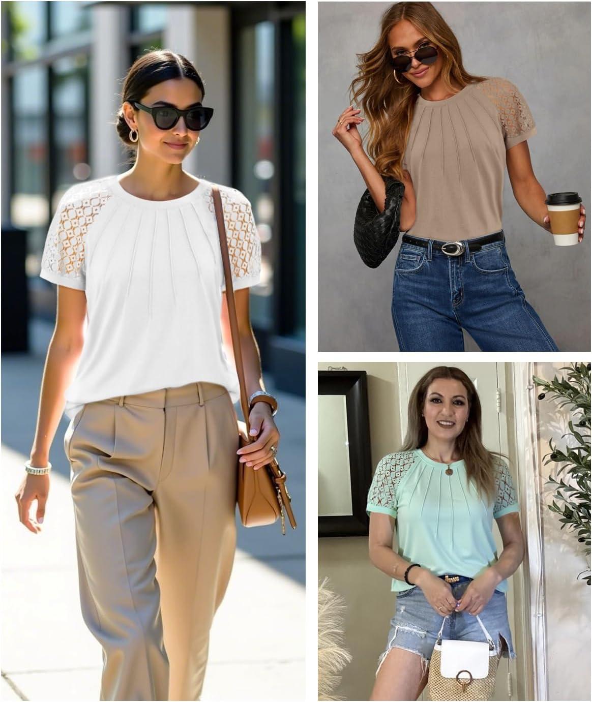 ATHMILE Womens Blouses Business Date Outfits Spring Summer Fall Work Tops Fashion Lace Short Sleeve Casual Shirts 2025(White)