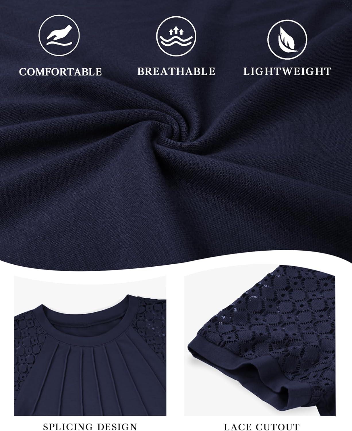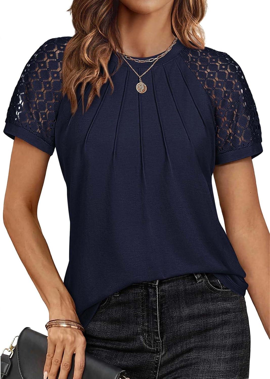 ATHMILE Womens Blouses Business Date Outfits Spring Summer Fall Work Tops Fashion Lace Short Sleeve Casual Shirts 2025(Navy)