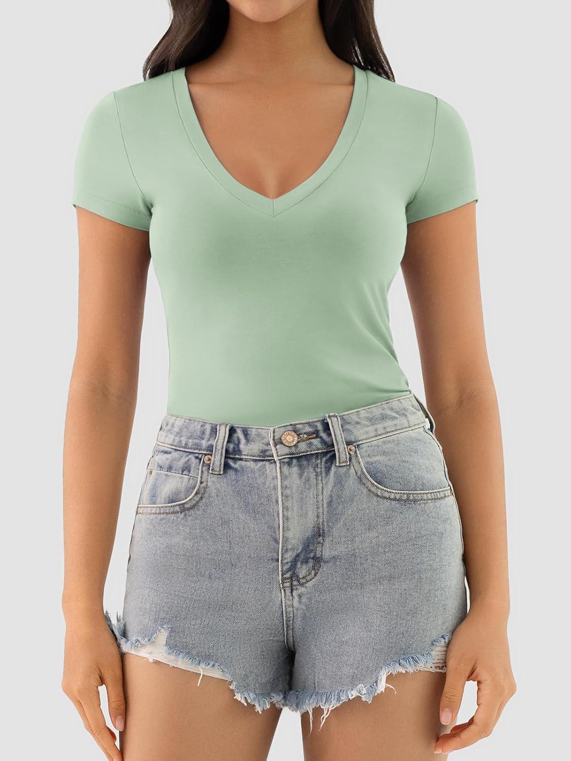 ATHMILE Womens Deep V Neck Short Sleeve Slim Fit T Shirt Tops Tee(Hazeblue)