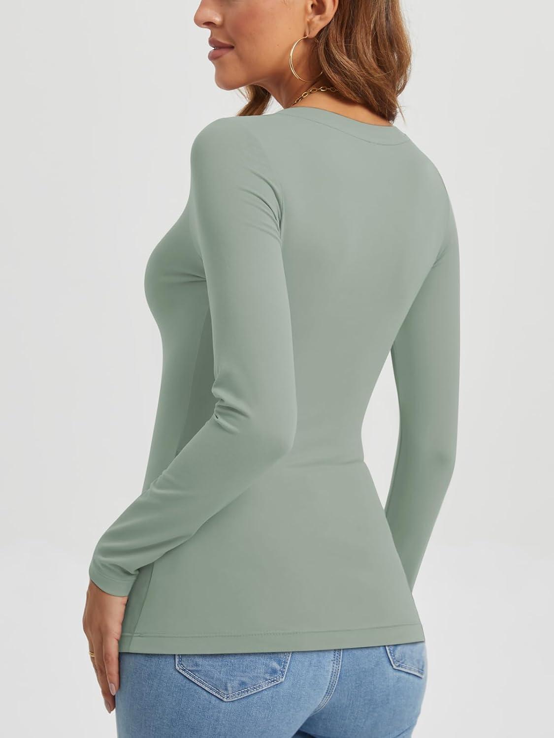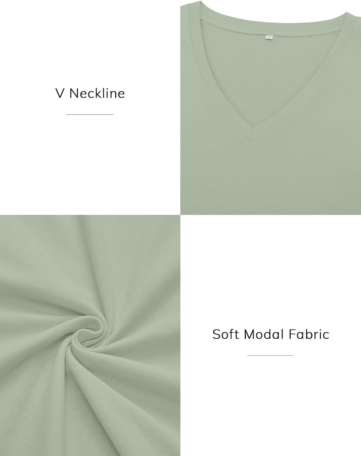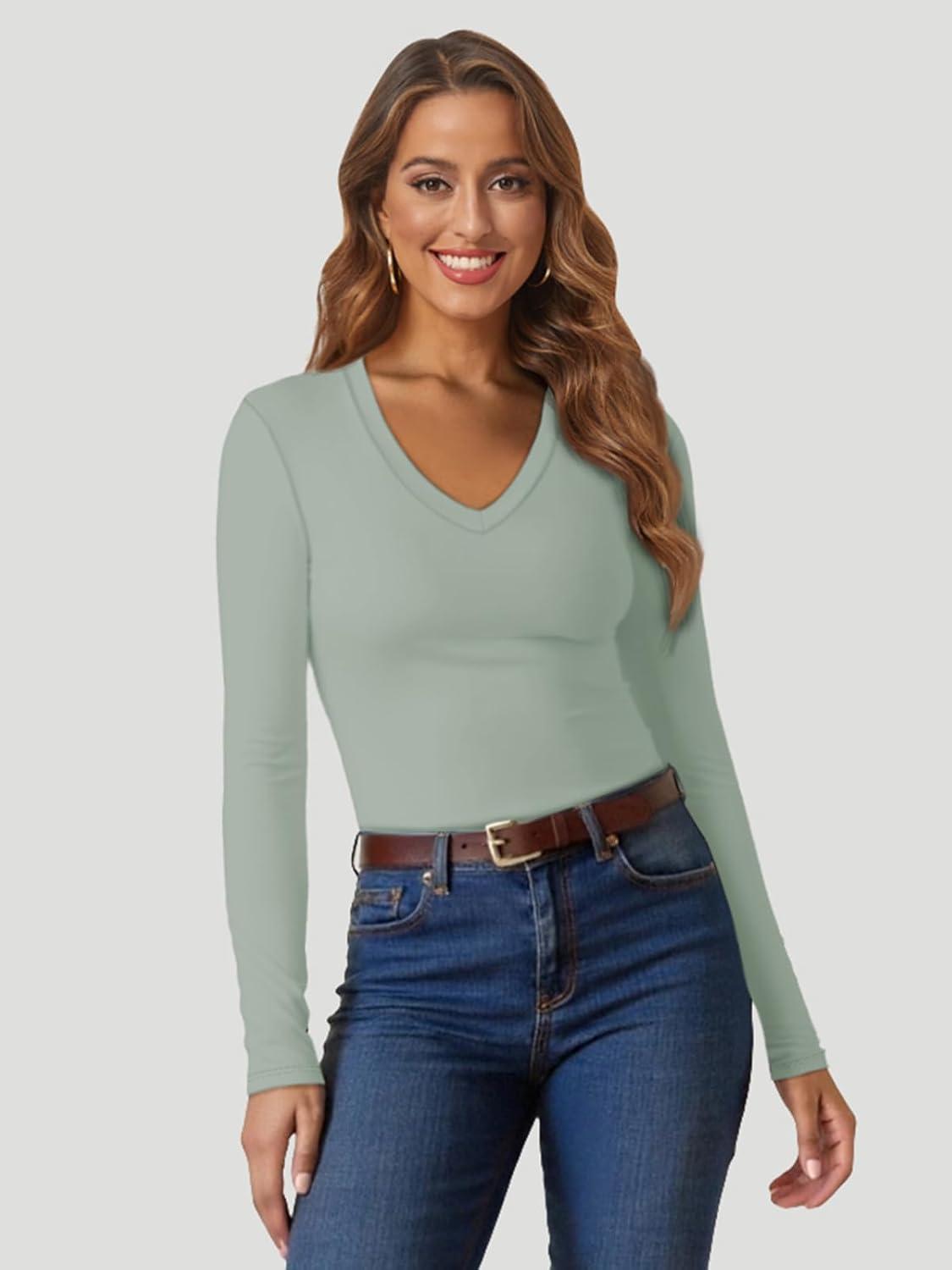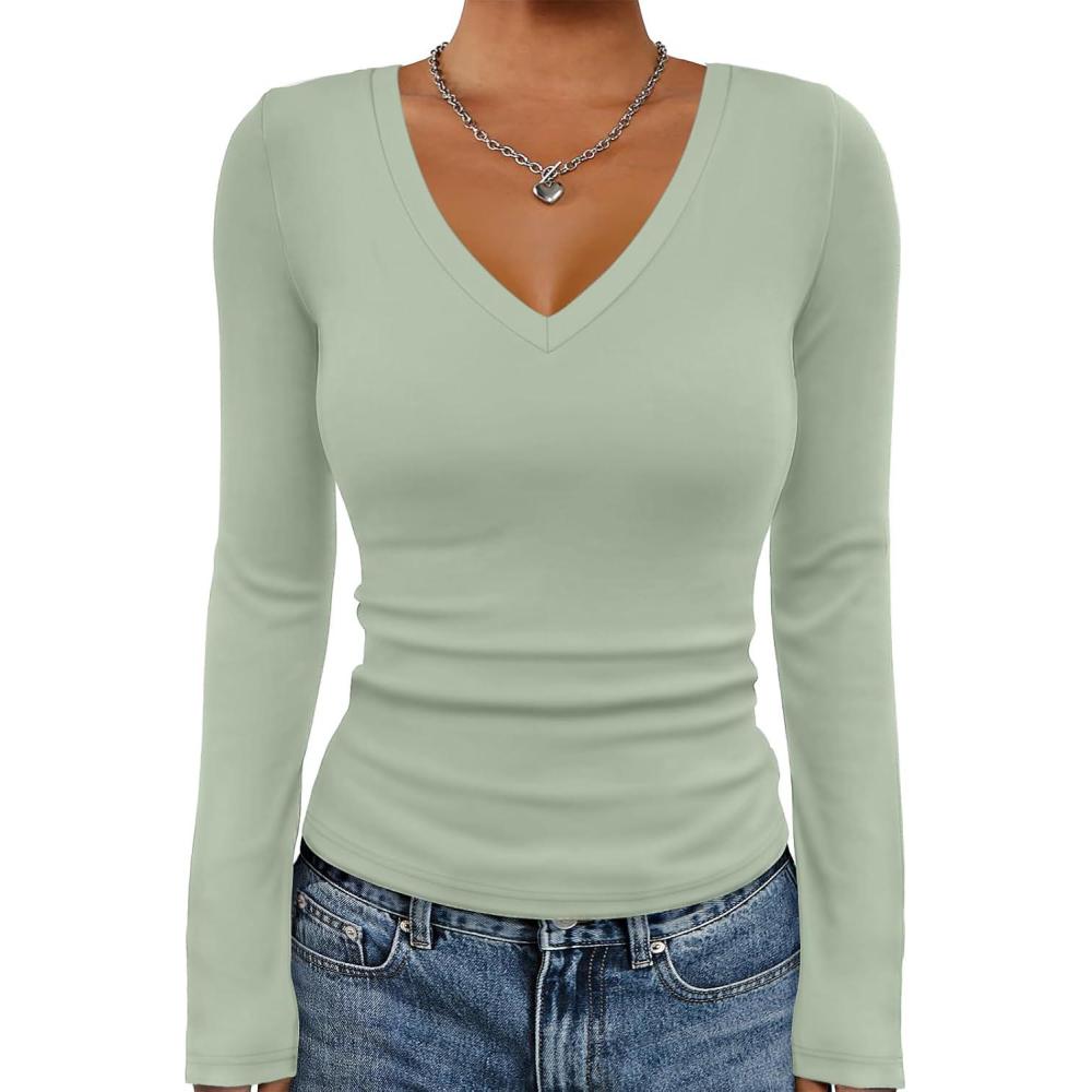 ATHMILE Womens Fall Deep V Neck Long Sleeve Shirts Modal Slim Fit Basic Tee Tops 2025(A-light Green)