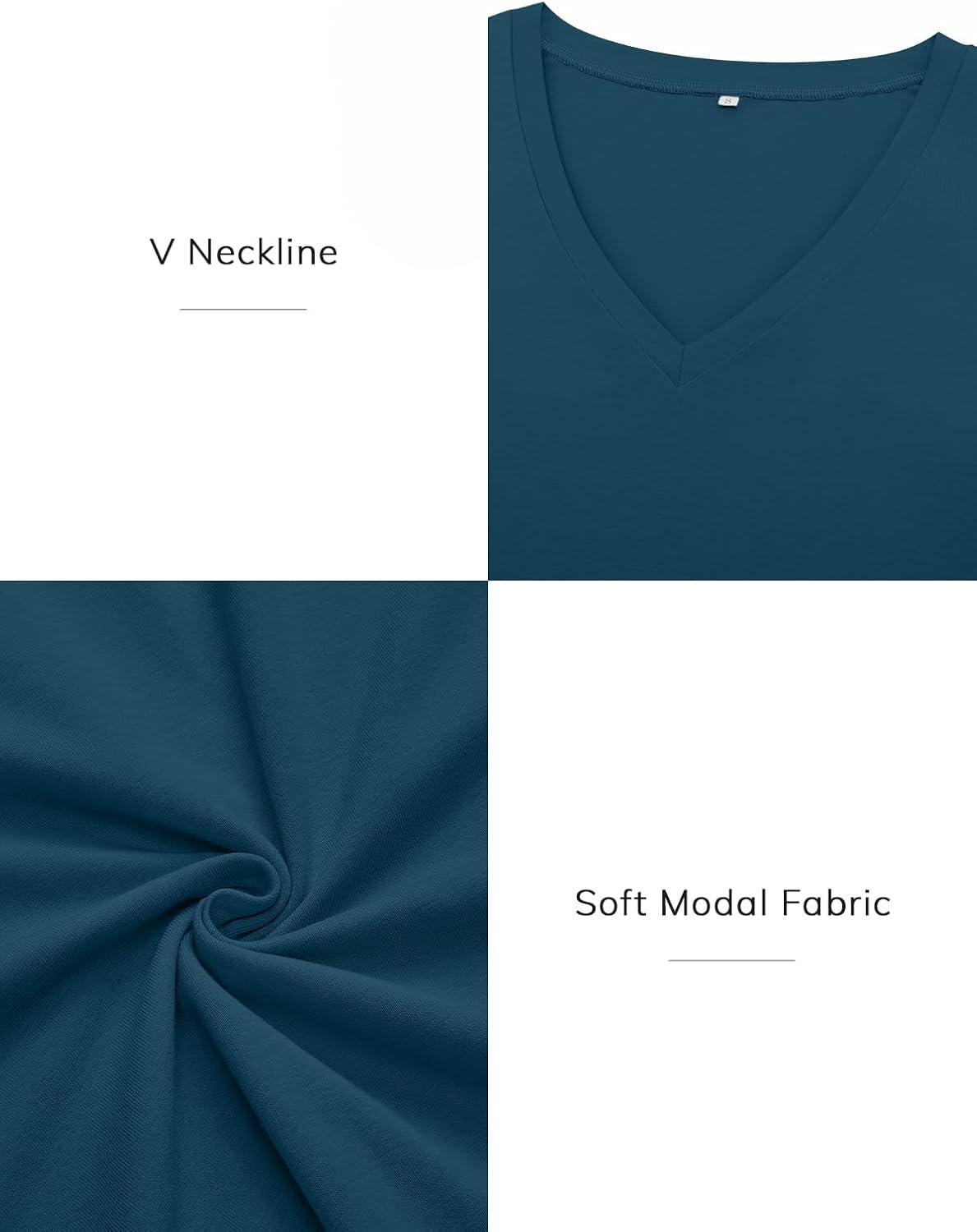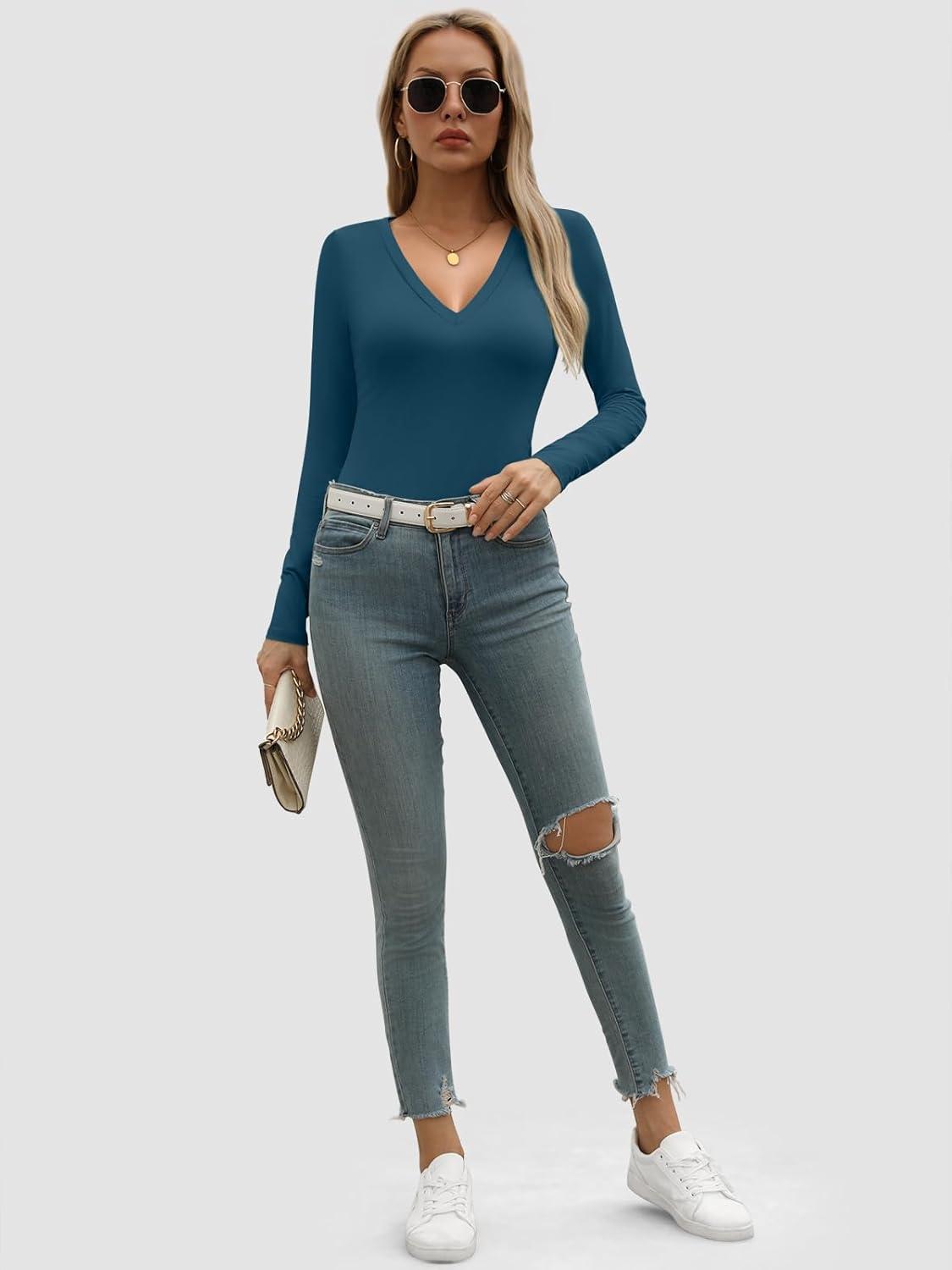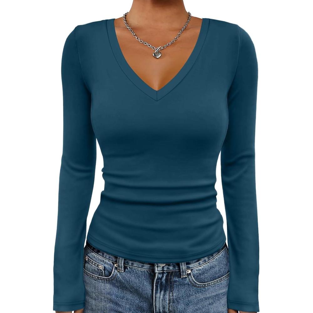 ATHMILE Womens Fall Deep V Neck Long Sleeve Shirts Modal Slim Fit Basic Tee Tops 2025(Navy)