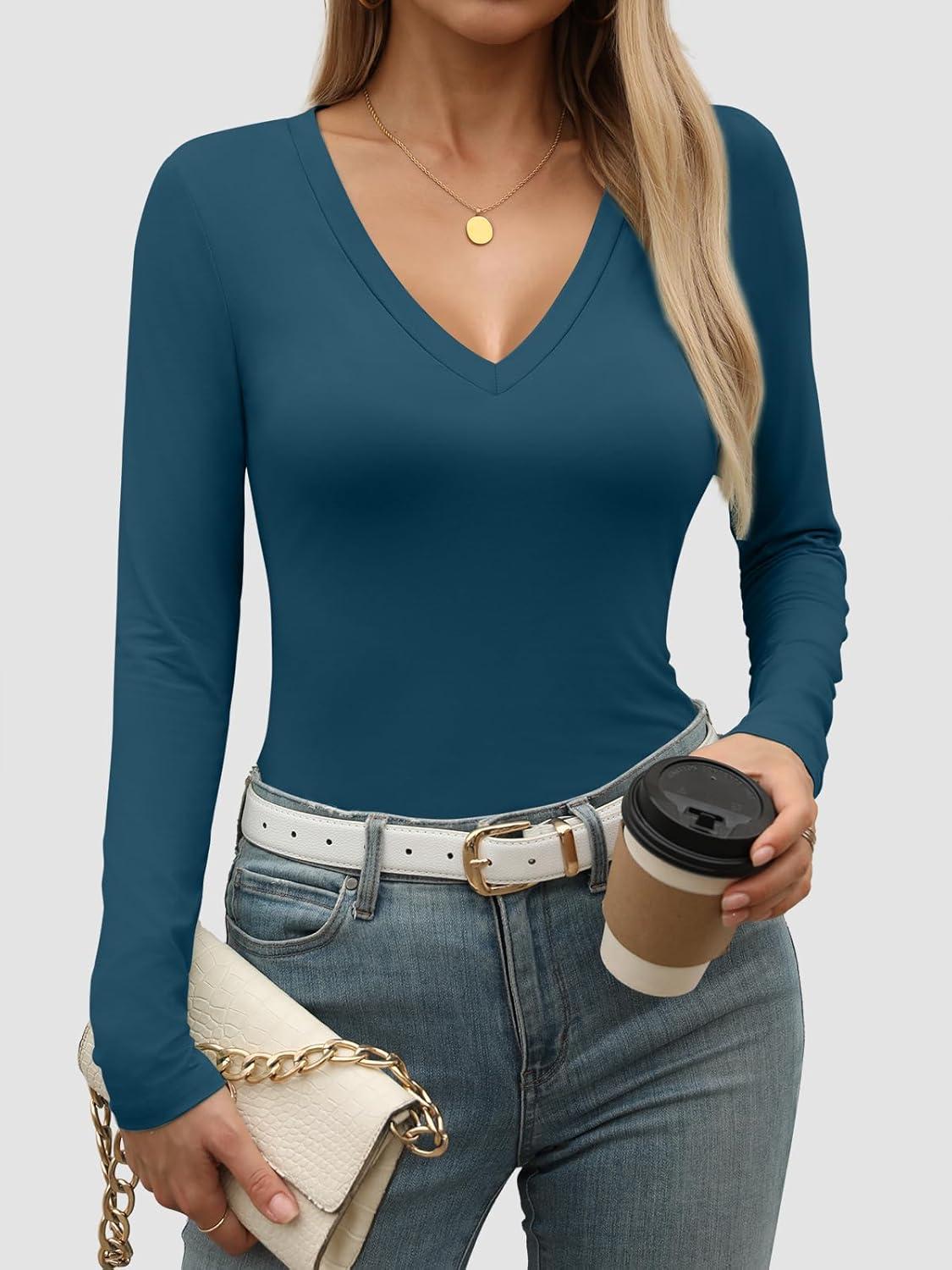 imageATHMILE Womens Fall Deep V Neck Long Sleeve Shirts Modal Slim Fit Basic Tee Tops 2025Navy