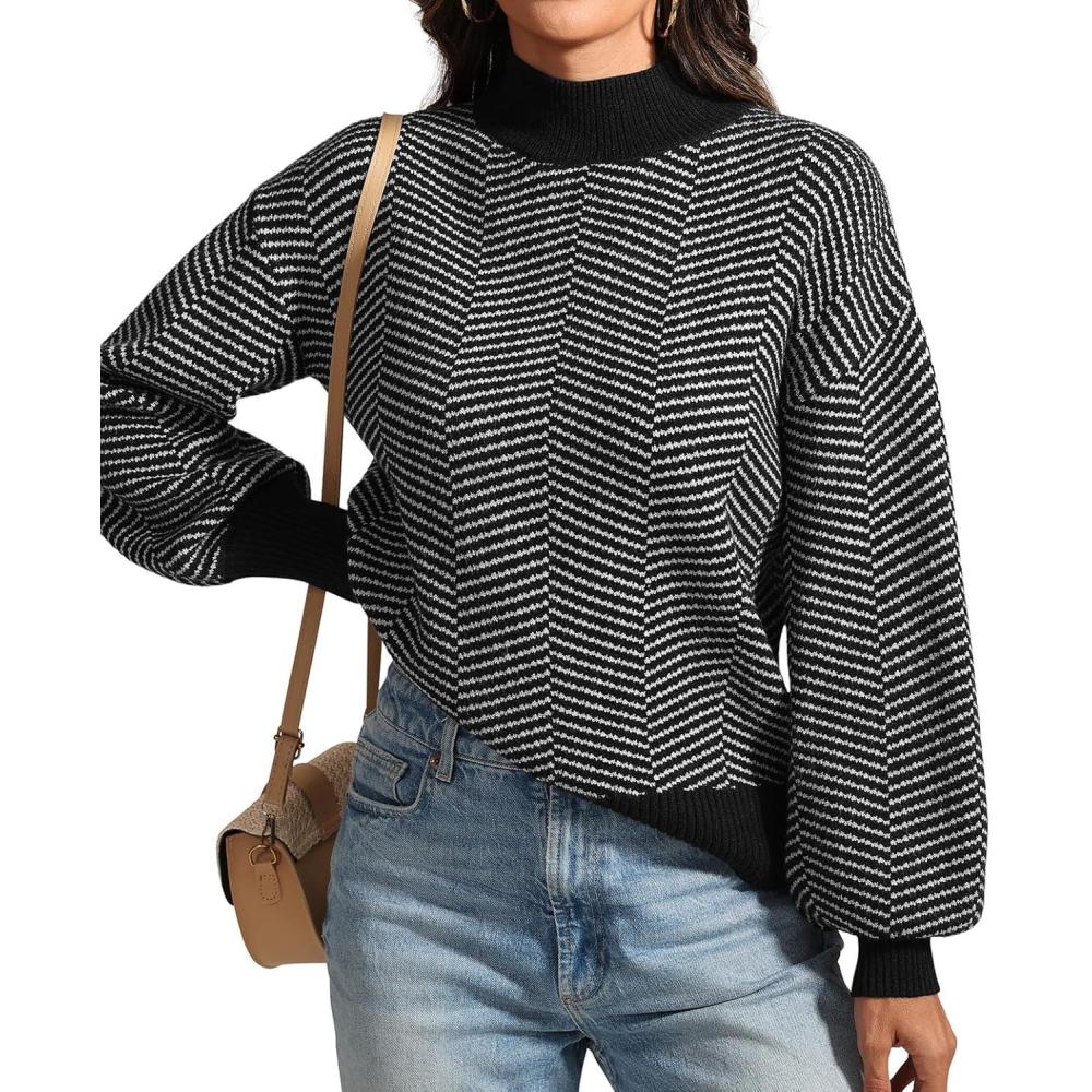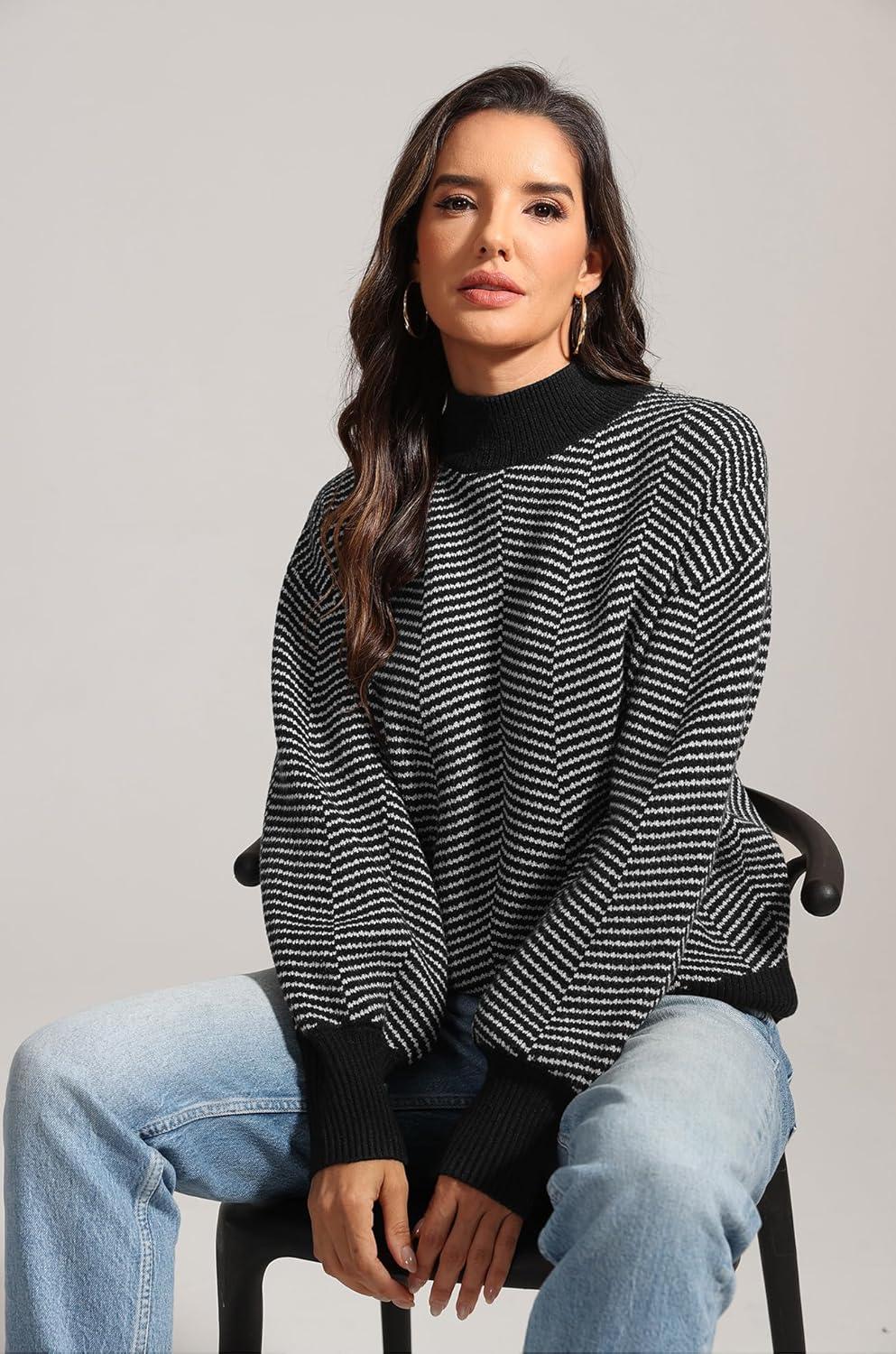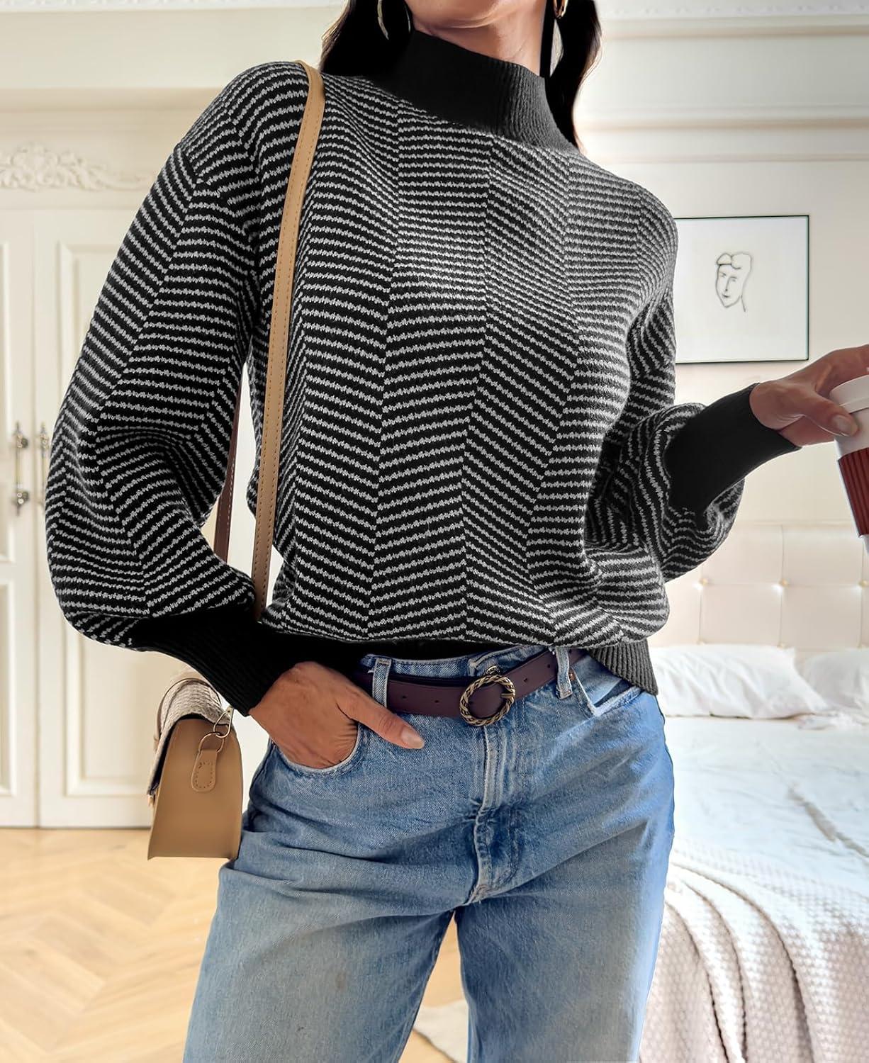 ATHMILE Womens Fall Fashion Mock Neck Sweater Long Sleeve Plaid Ribbed Knit Loose Pullover Tops Trendy Office Outfits(Dim)