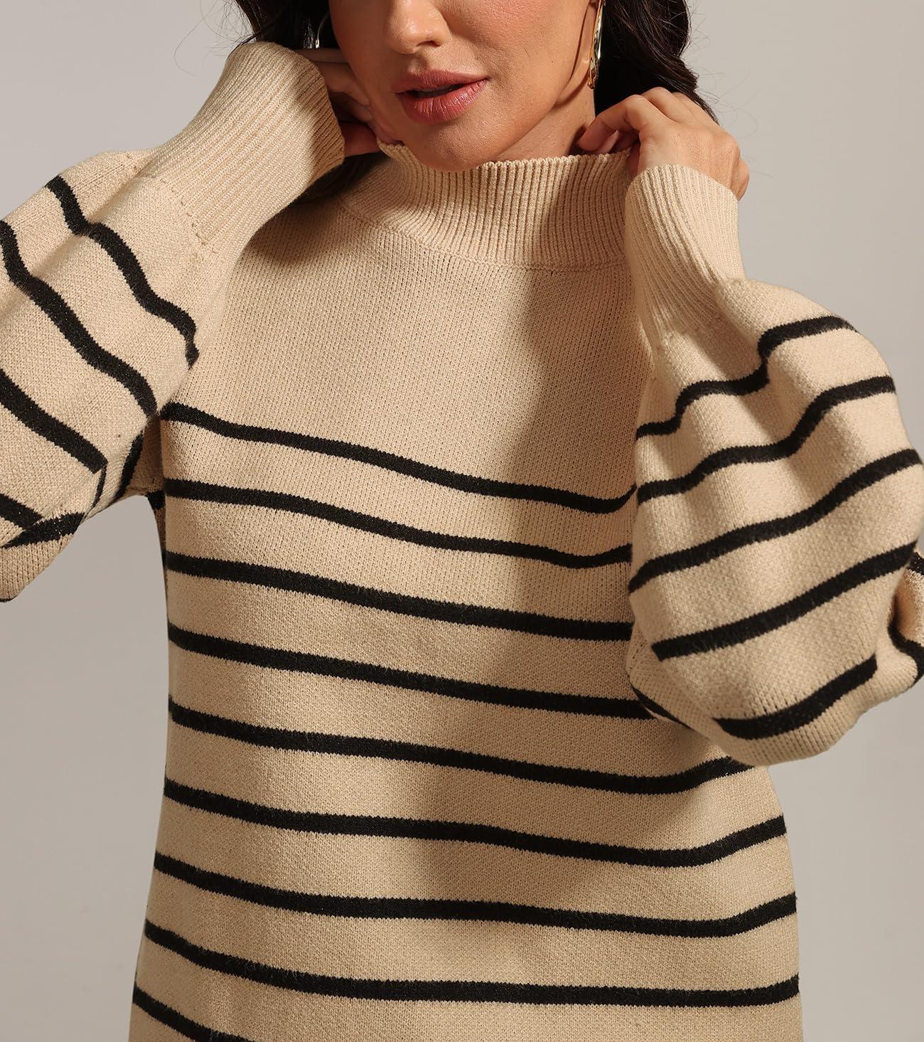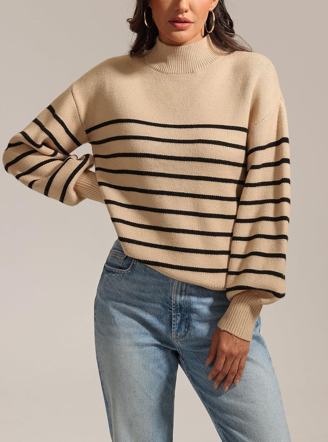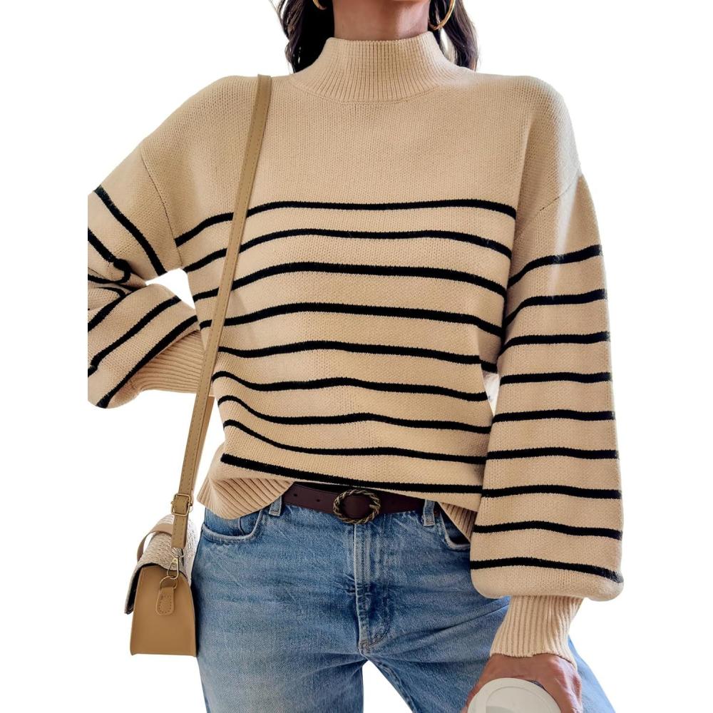 ATHMILE Womens Fall Fashion Mock Neck Sweater Long Sleeve Plaid Ribbed Knit Loose Pullover Tops Trendy Office Outfits(Oatmeal)
