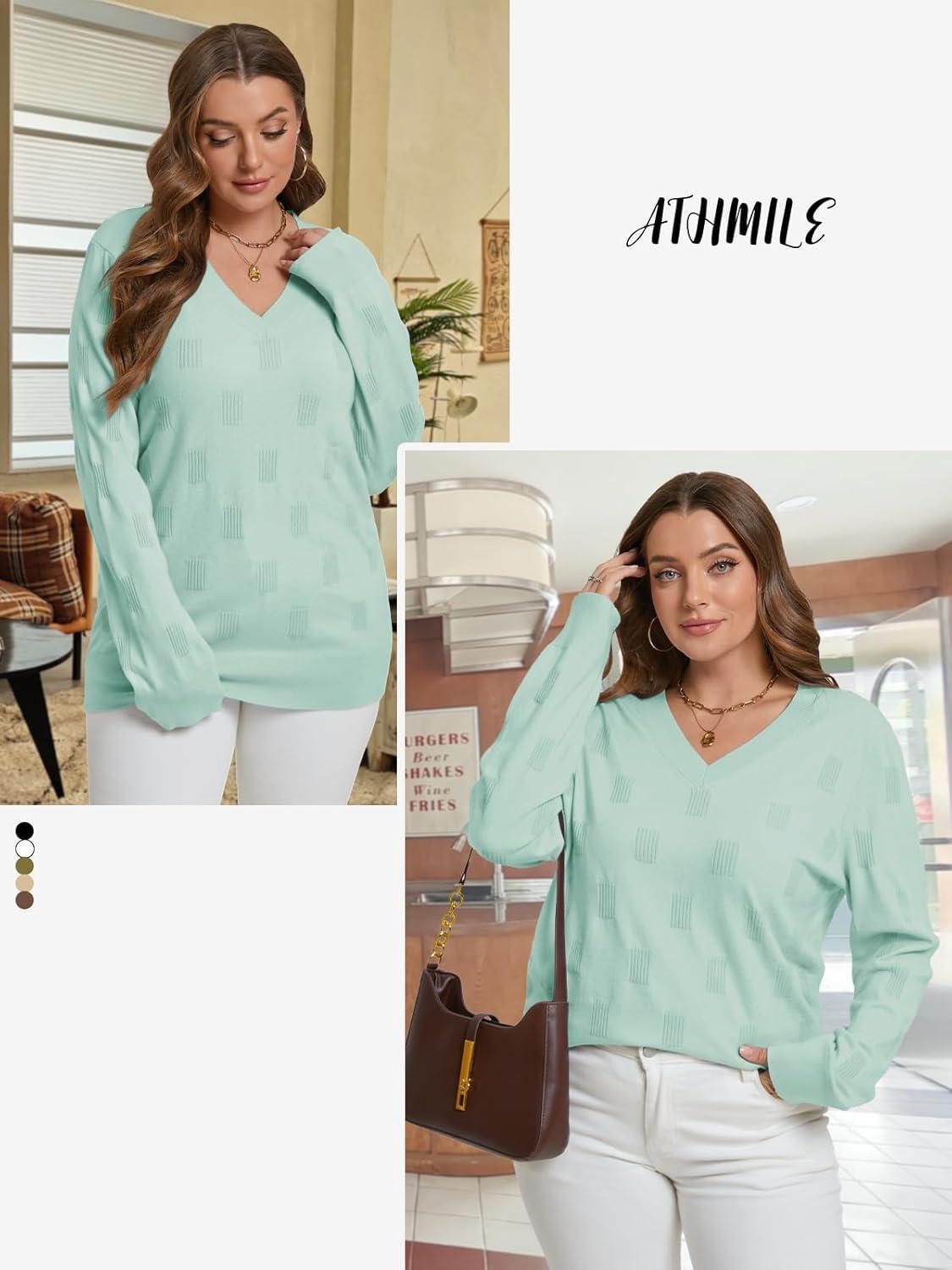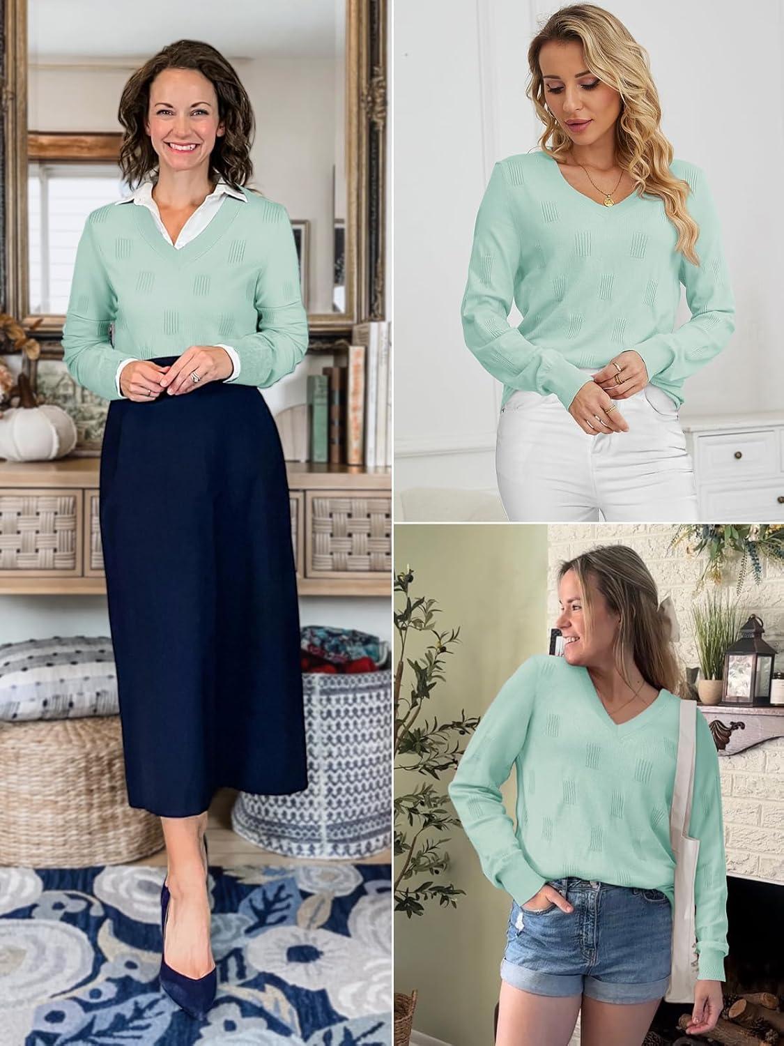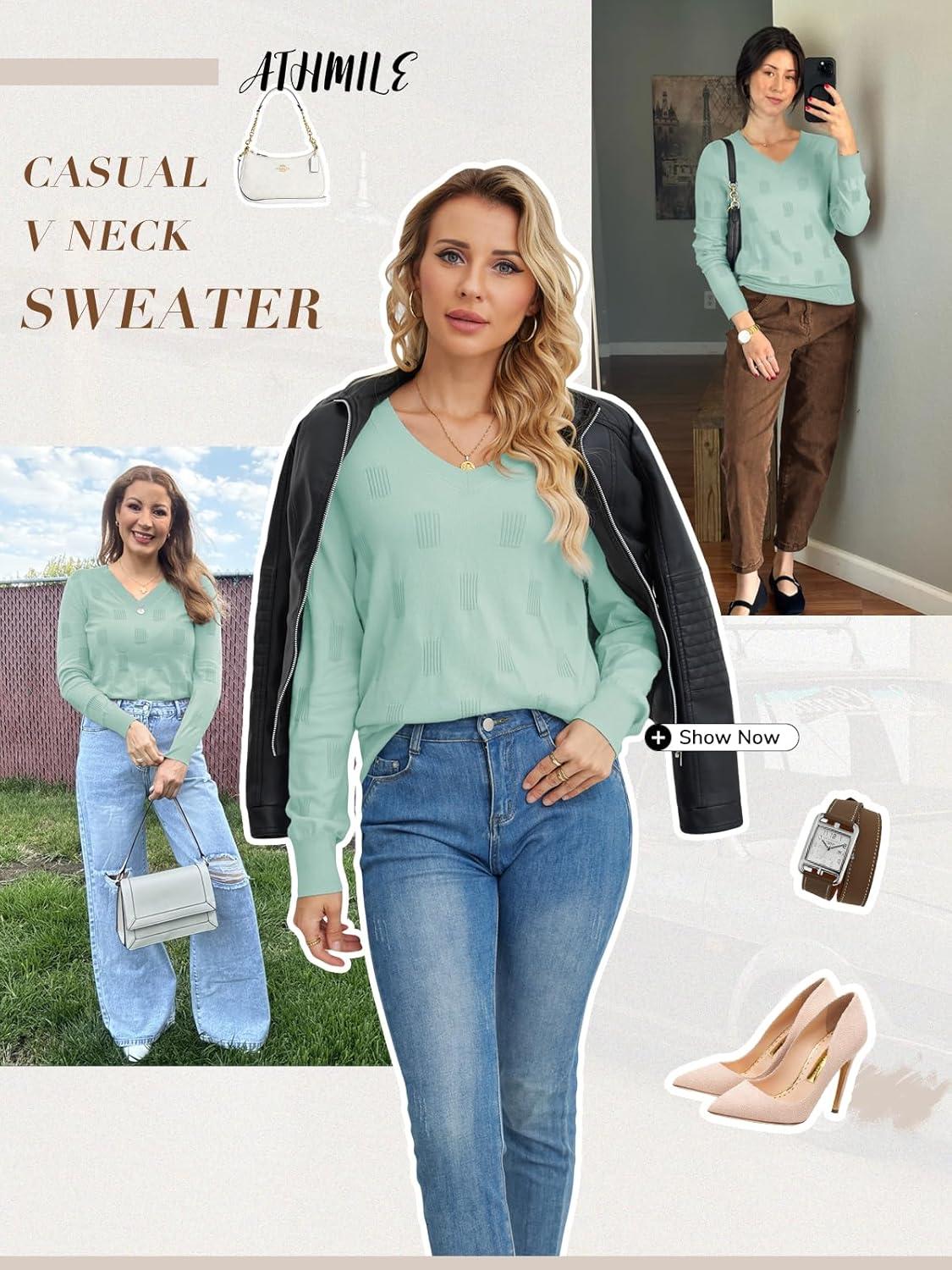 ATHMILE Women's Fall Tops 2025 Fashion Trendy Pullover Sweater V Neck Long Sleeve Shirt Knit Blouse Clothes Outfits(Mint Green)