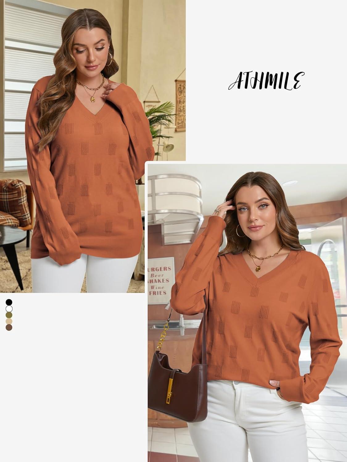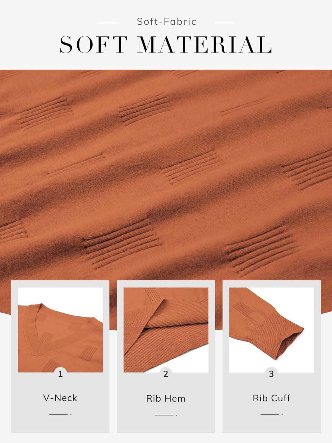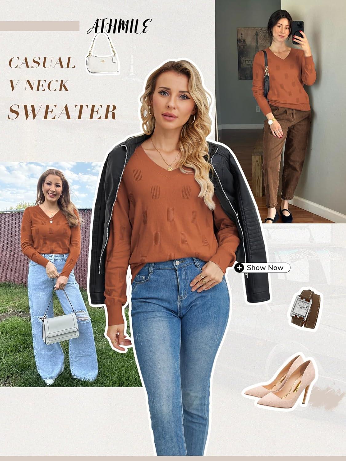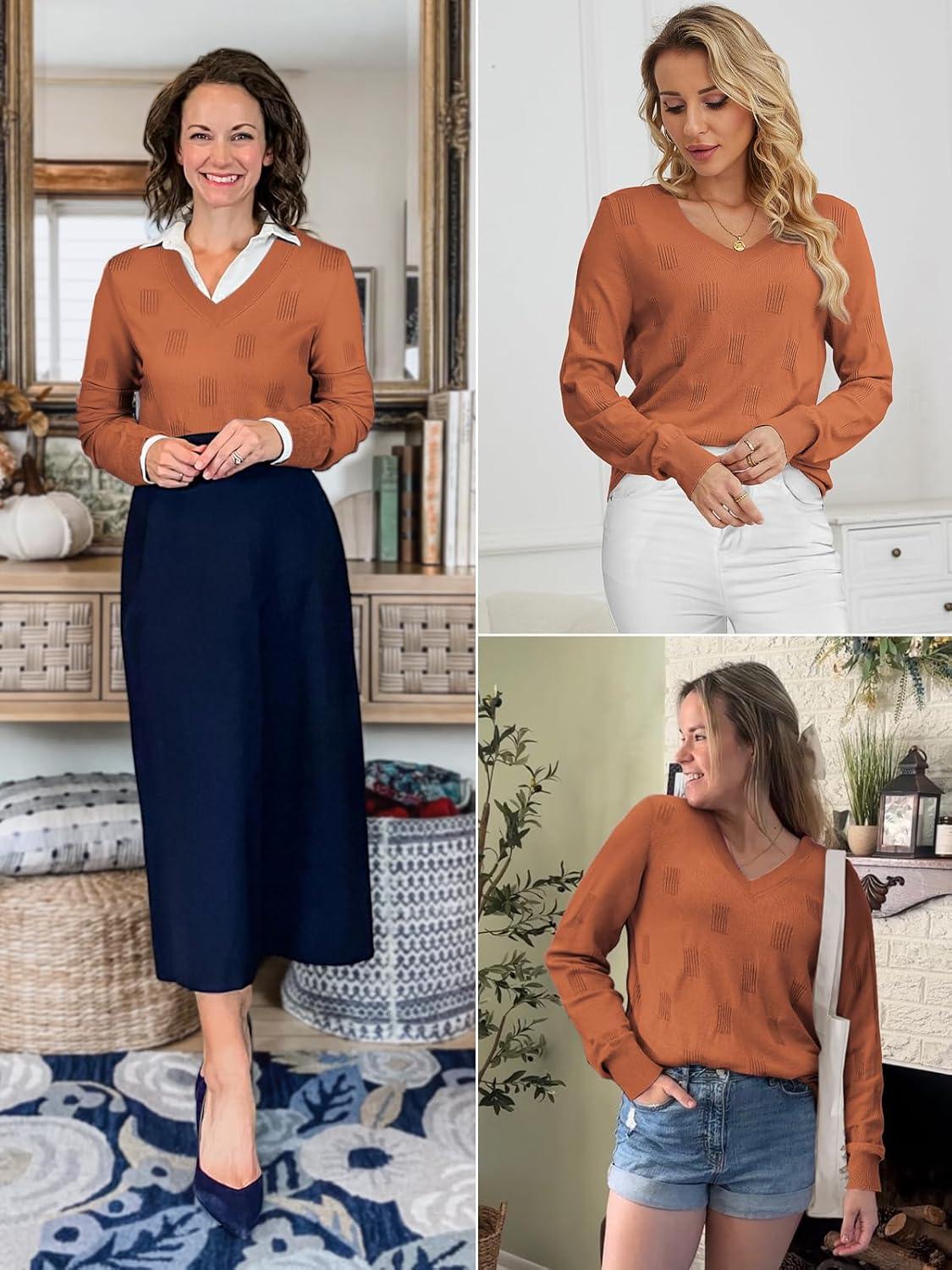 ATHMILE Women’s Fall Tops 2025 Fashion Trendy Pullover Sweater V Neck Long Sleeve Shirt Knit Blouse Clothes Outfits(Rust)