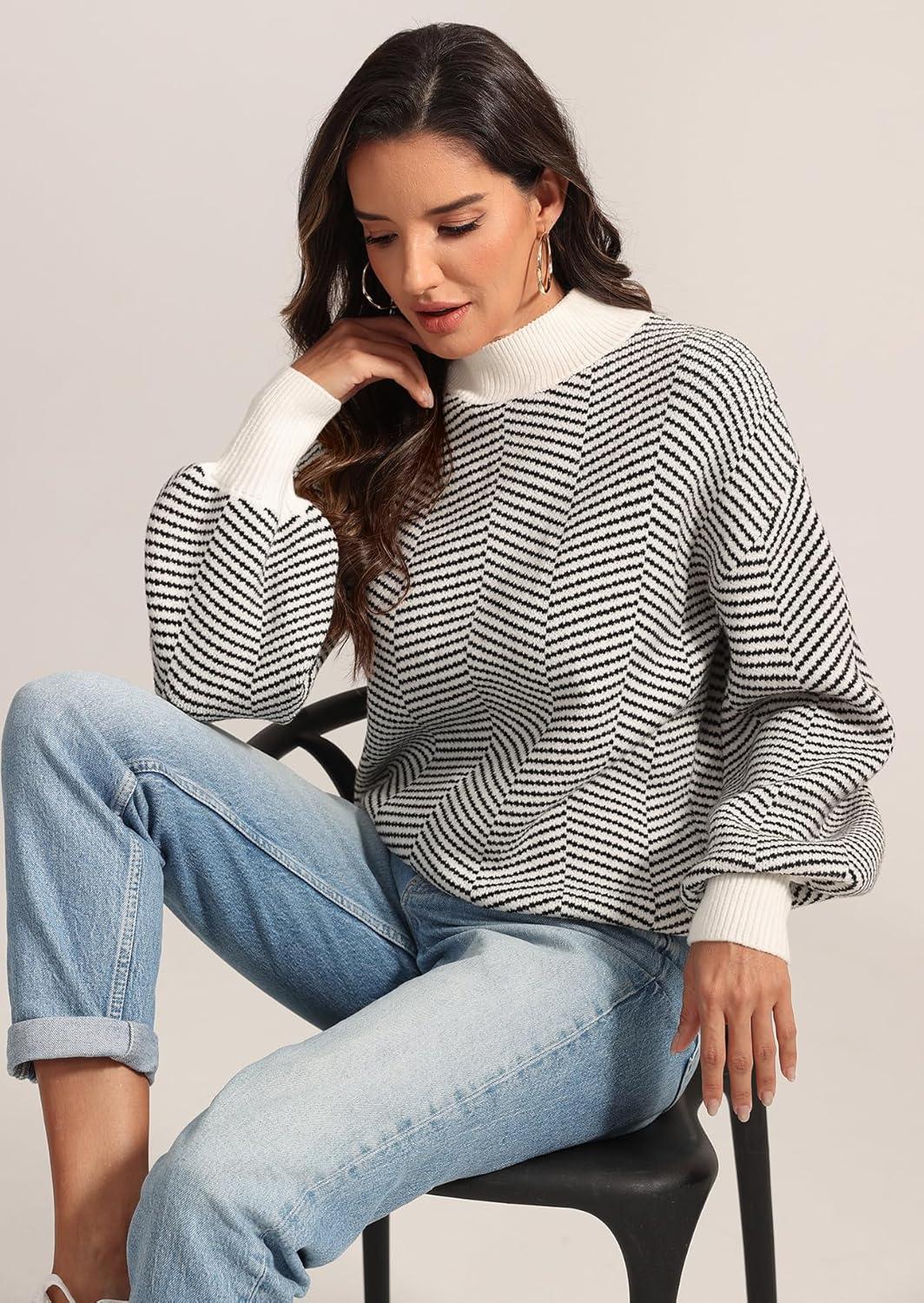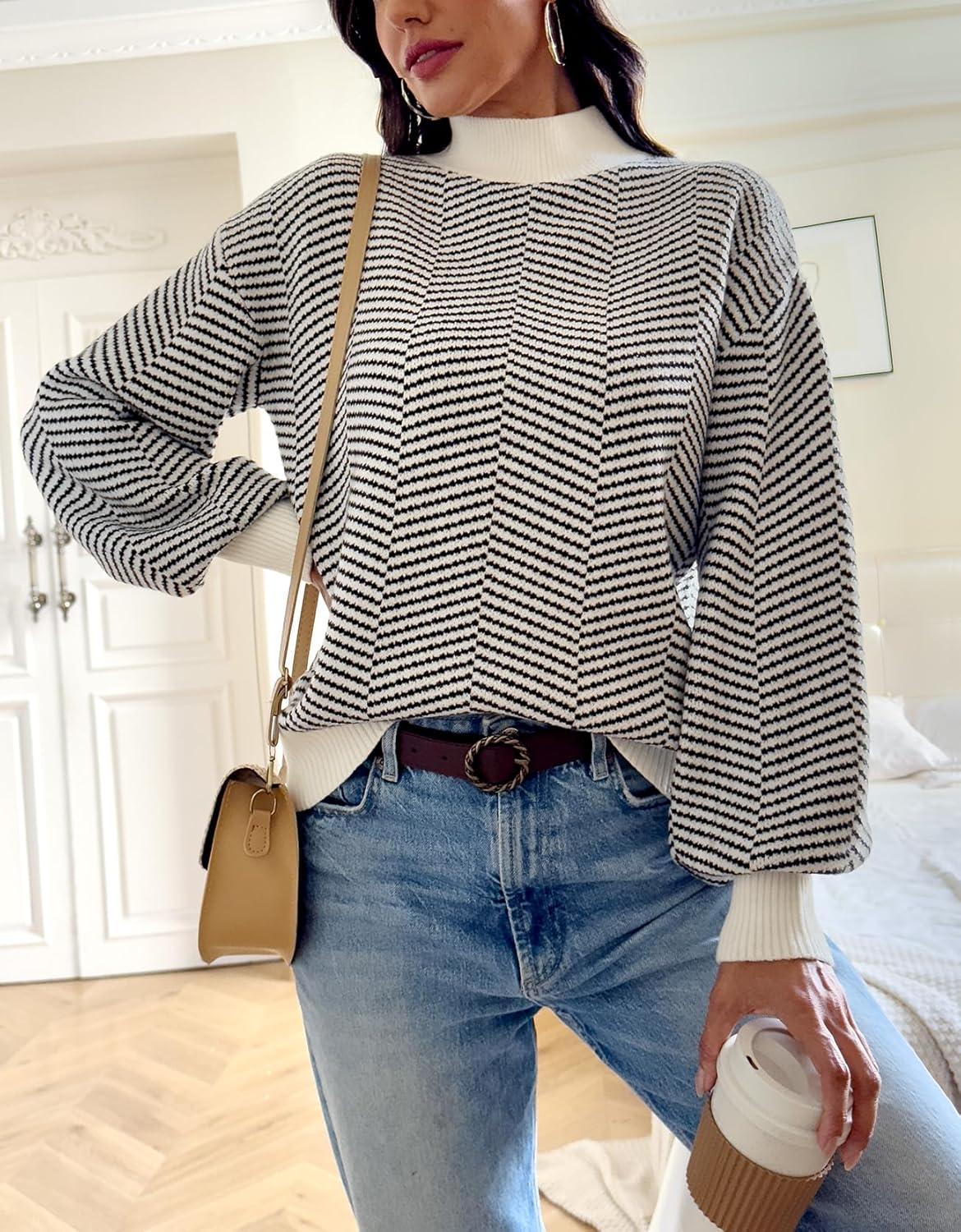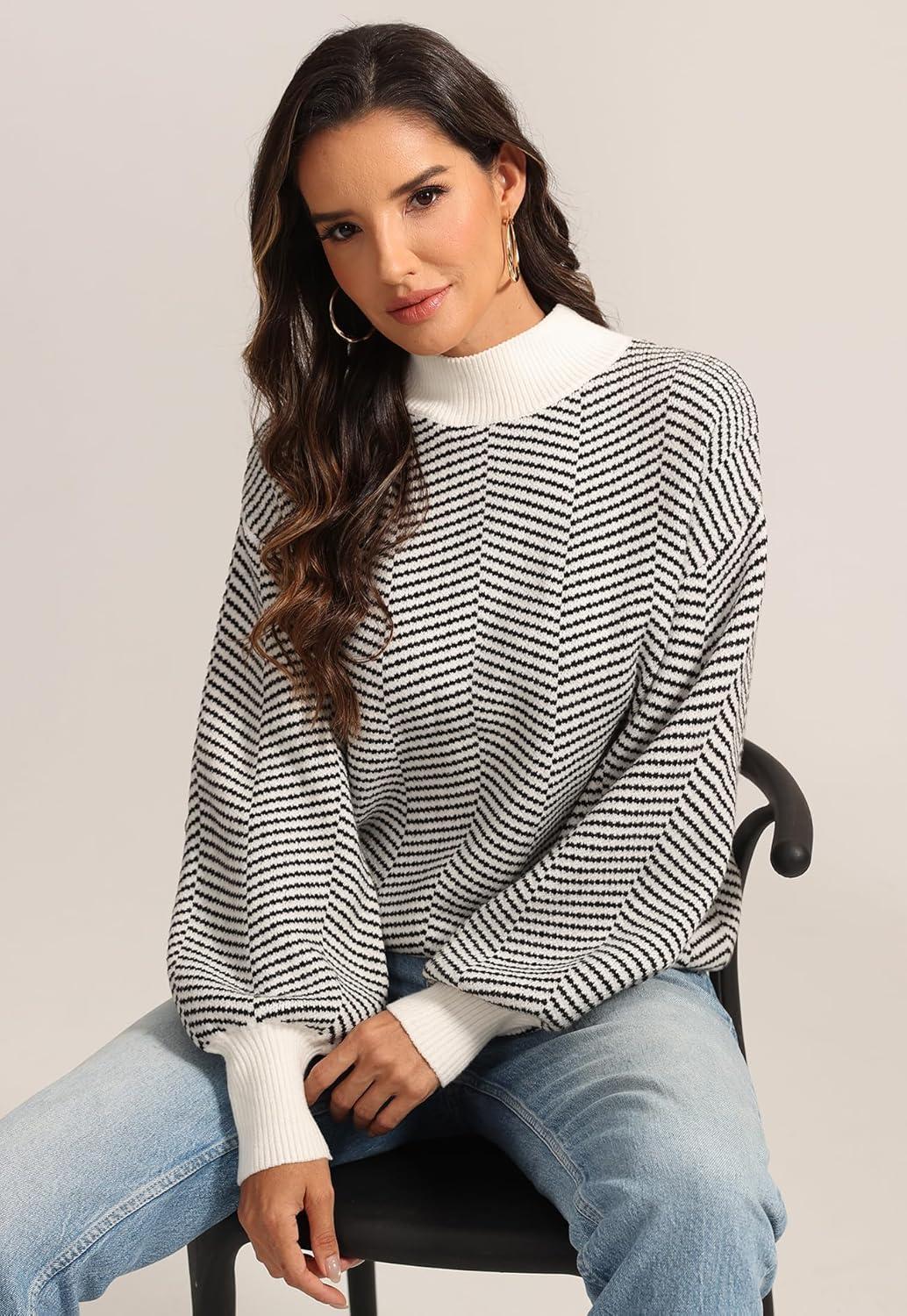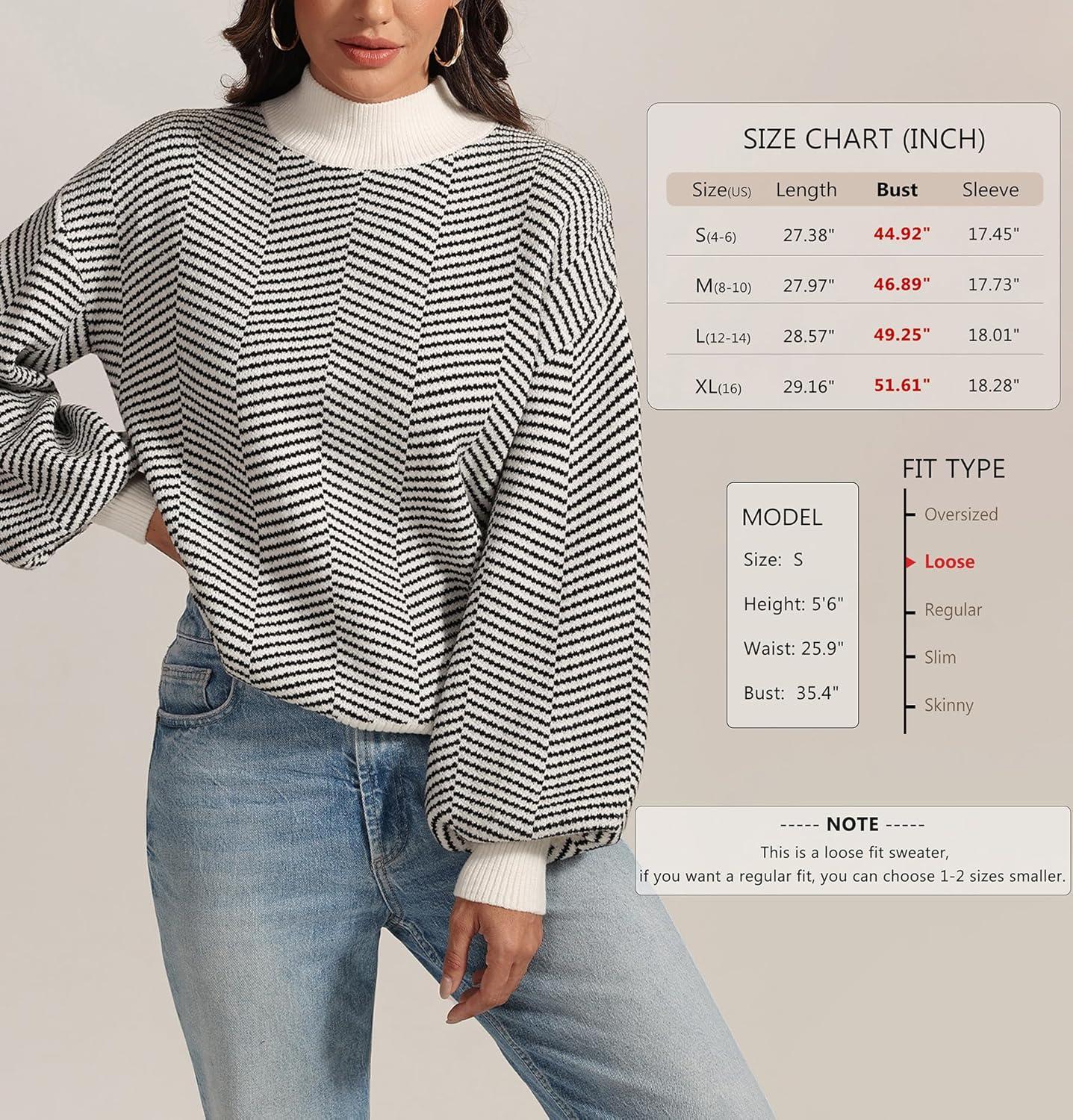 ATHMILE Womens Fashion Turtleneck Sweater Long Sleeve Plaid Ribbed Knit Loose Pullover Tops Trendy Office Outfits(Brownstripe)