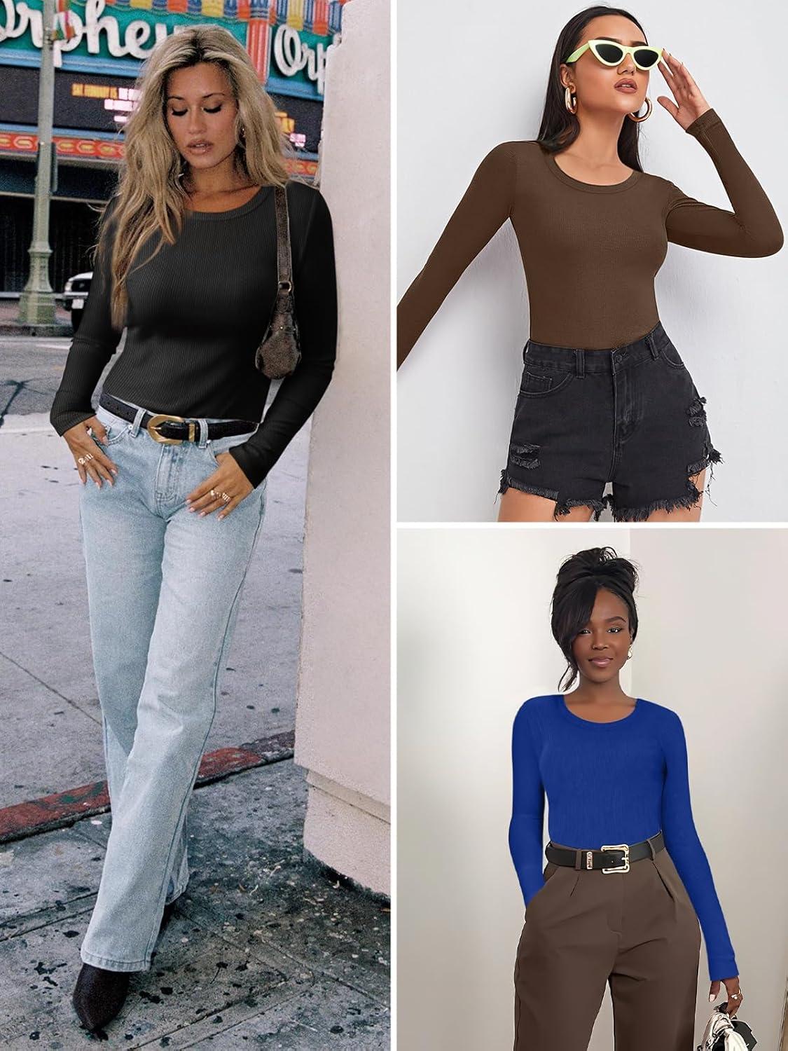 ATHMILE Womens Long Sleeve Crewneck Ribbed Tops Fall Fitted Stretch Casual Basic T Shirts 2025(A-light Blue)