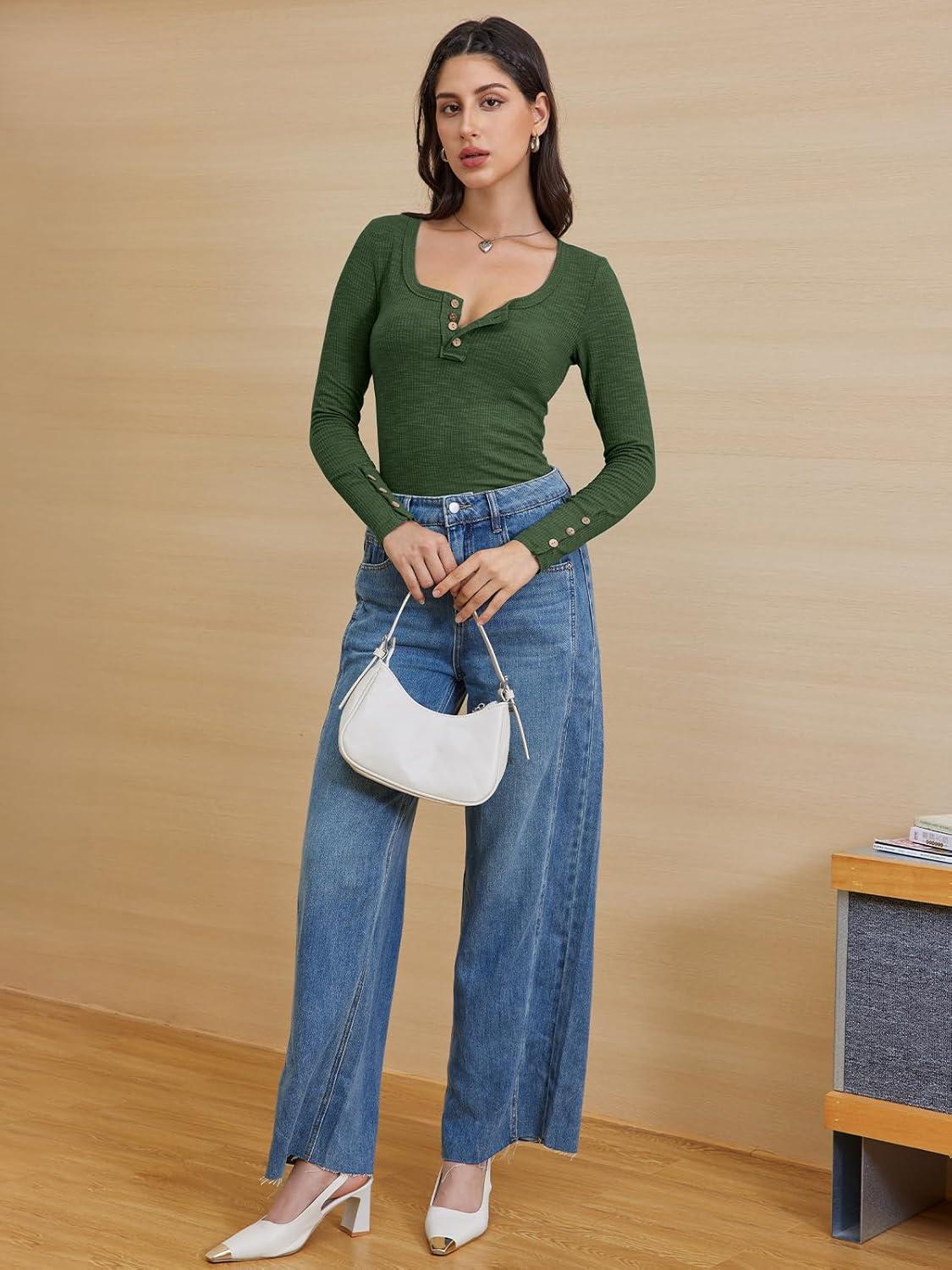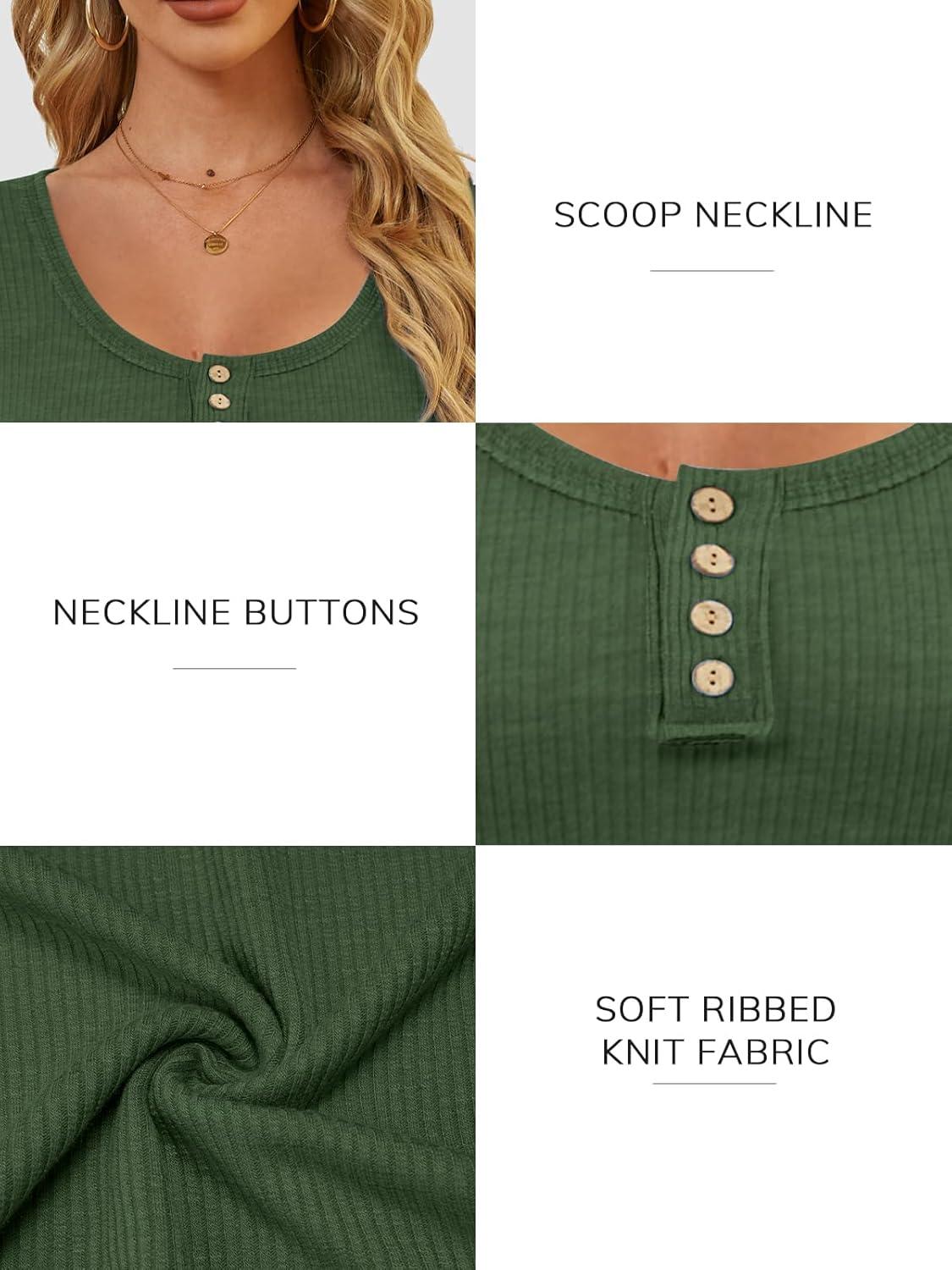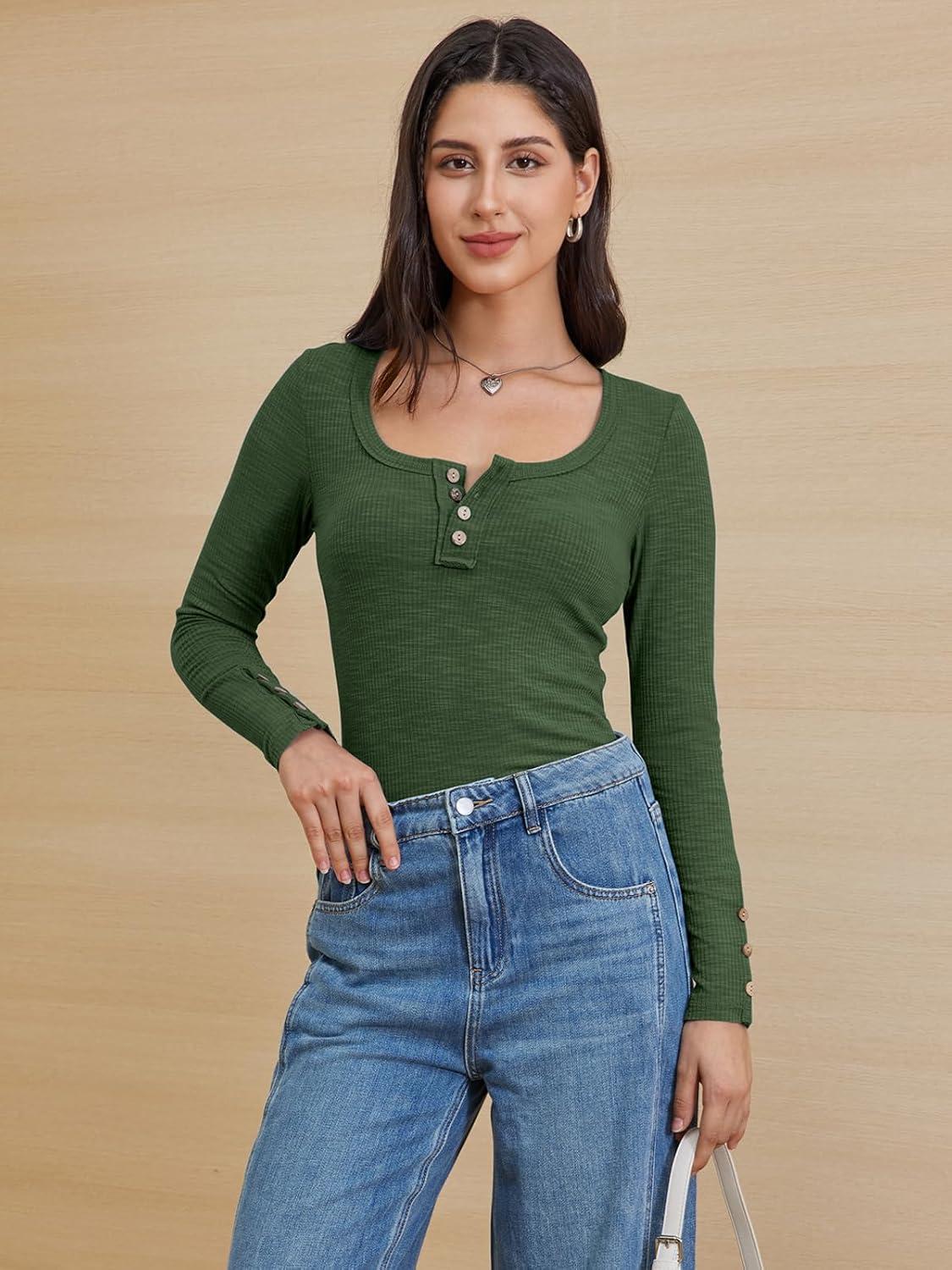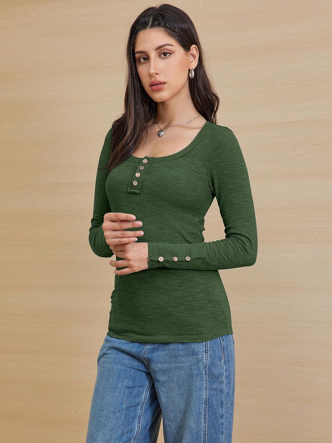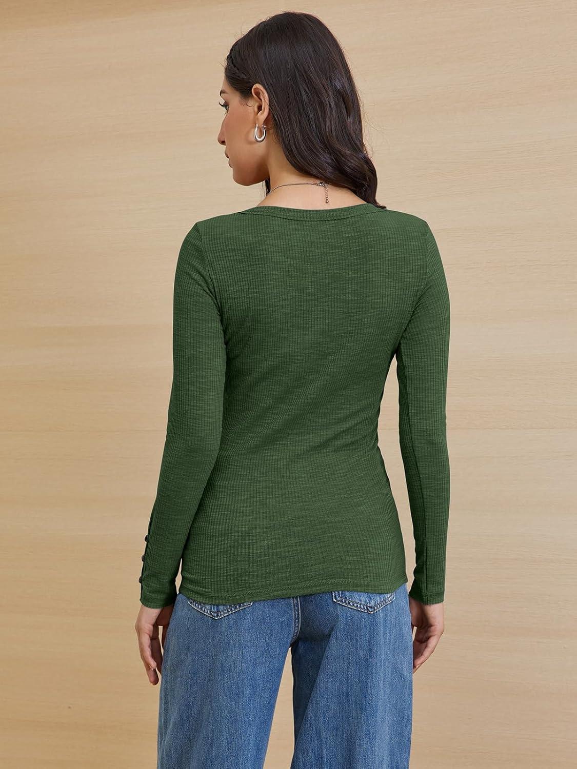 ATHMILE Women’s Long Sleeve Shirts Casual Fall Henley Top Button Down Blouses Basic Ribbed Knit T Shirts 2025(Armygreen)