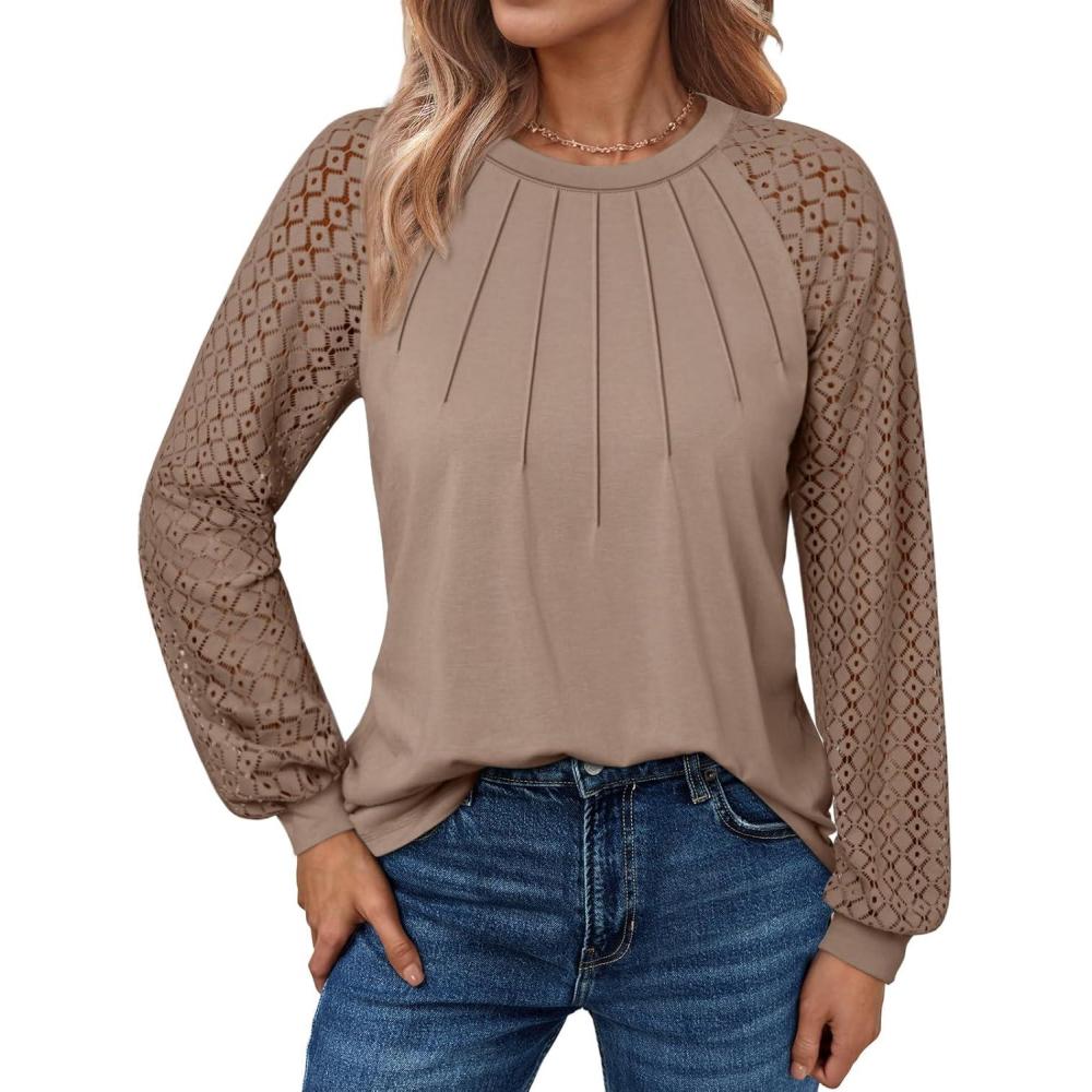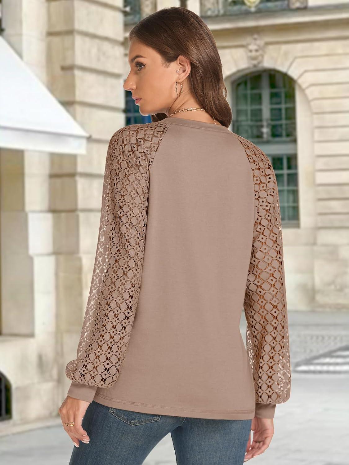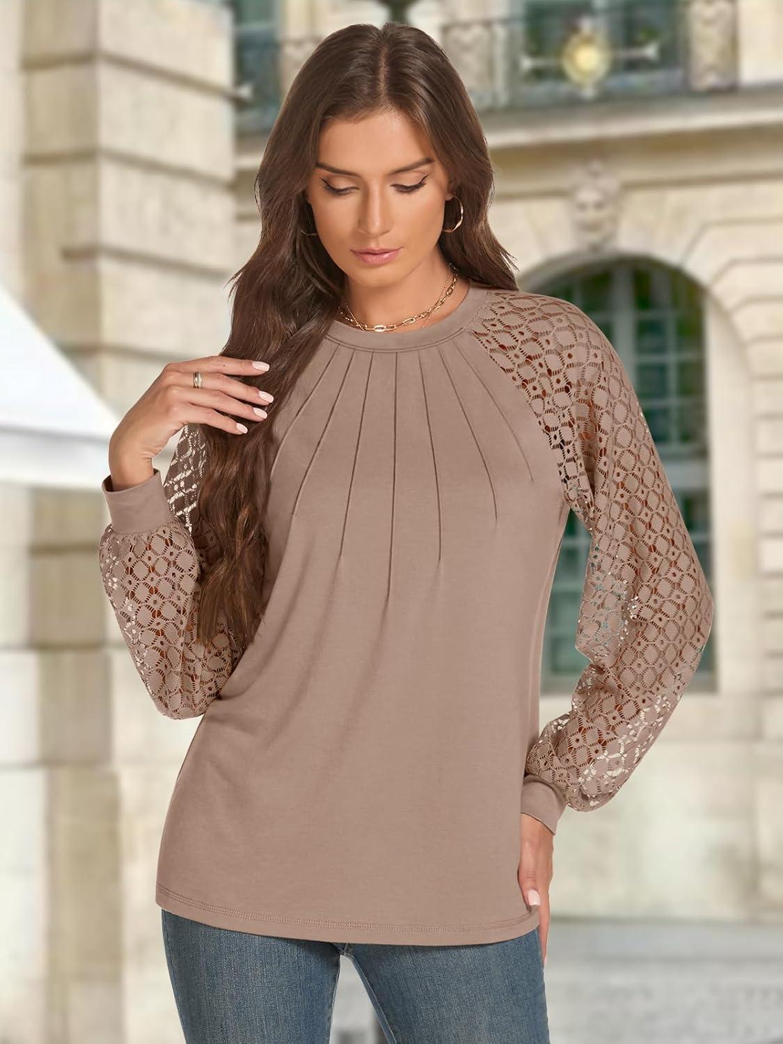 ATHMILE Womens Long Sleeve Shirts Lace Tops Business Casual Outfits Dressy Fall Fashion Blouses(Khaki)