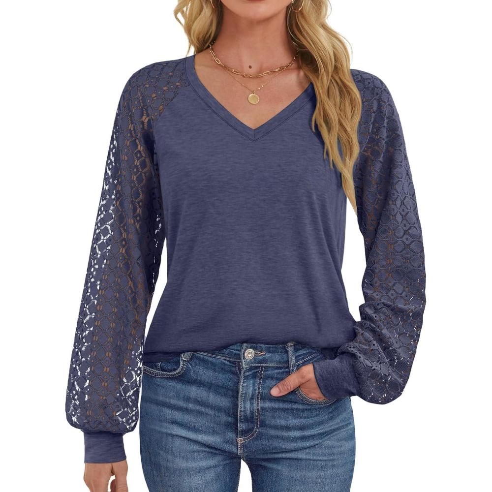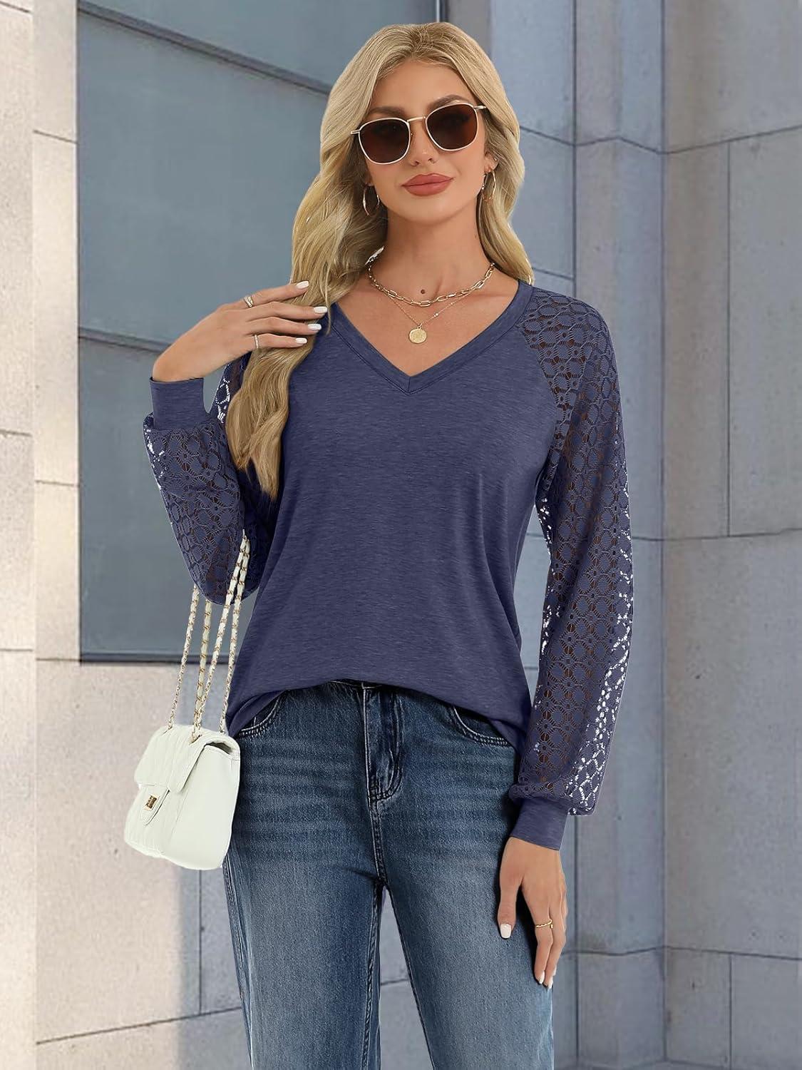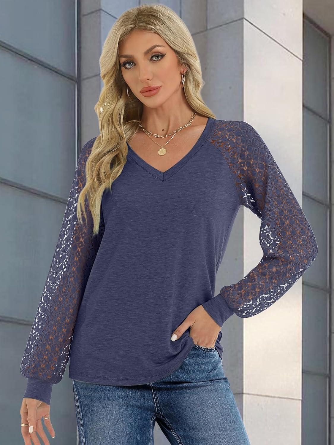 ATHMILE Womens Long Sleeve Shirts V-Neck Lace Tops Business Casual Blouses Tee 2025 Trendy Fall Fashion Outfits Clothes(Darkblue)