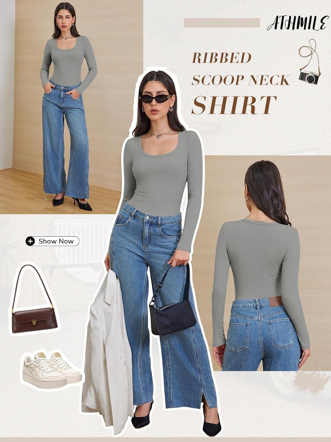 ATHMILE Womens Long Sleeve Tops Fall Scoop Neck Ribbed Knit Shirts Slim Fitted Casual Basic Tee T Shirt for Women 2025(A-grey)
