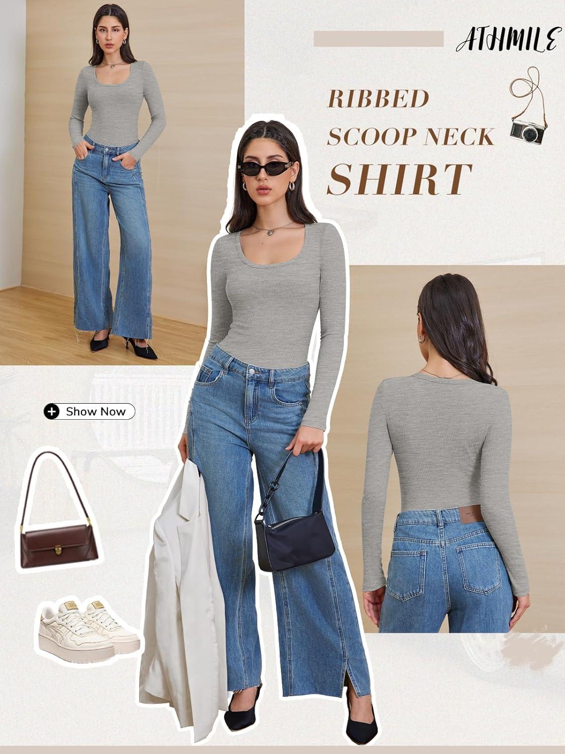 ATHMILE Womens Long Sleeve Tops Fall Scoop Neck Ribbed Knit Shirts Slim Fitted Casual Basic Tee T Shirt for Women 2025(A-grey)