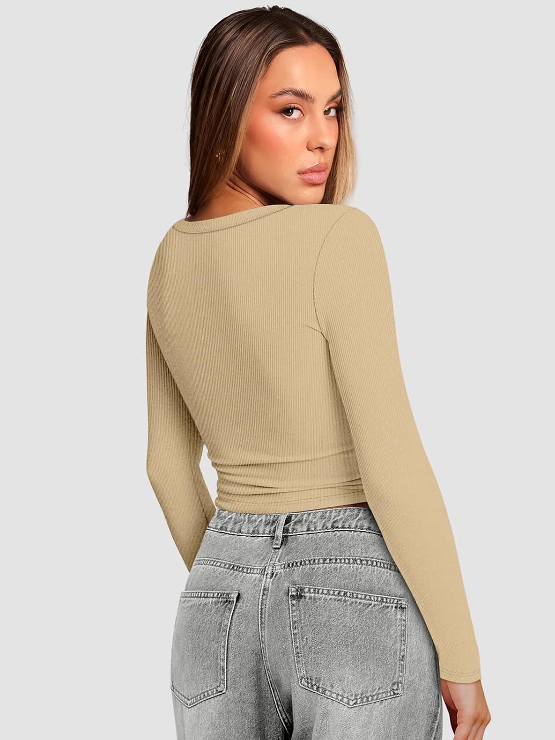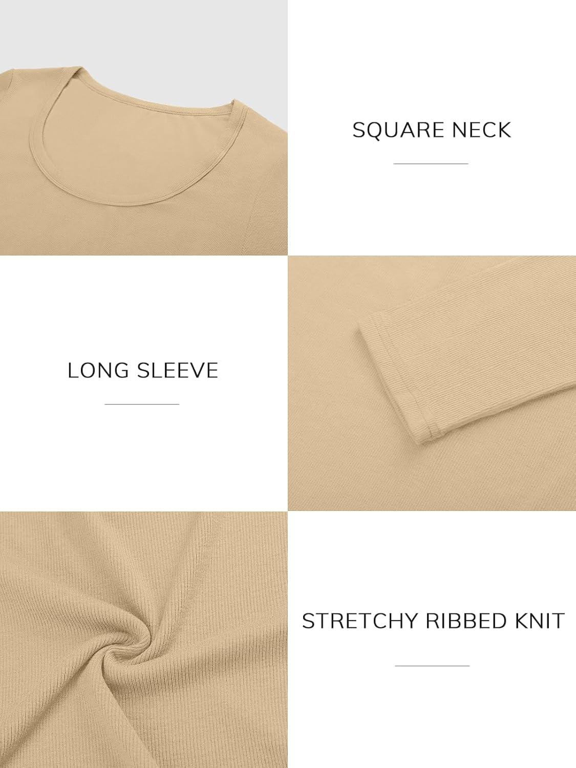 ATHMILE Womens Long Sleeve Tops Fall Scoop Neck Ribbed Knit Shirts Slim Fitted Casual Basic Tee T Shirt for Women 2025(B-light Beige)