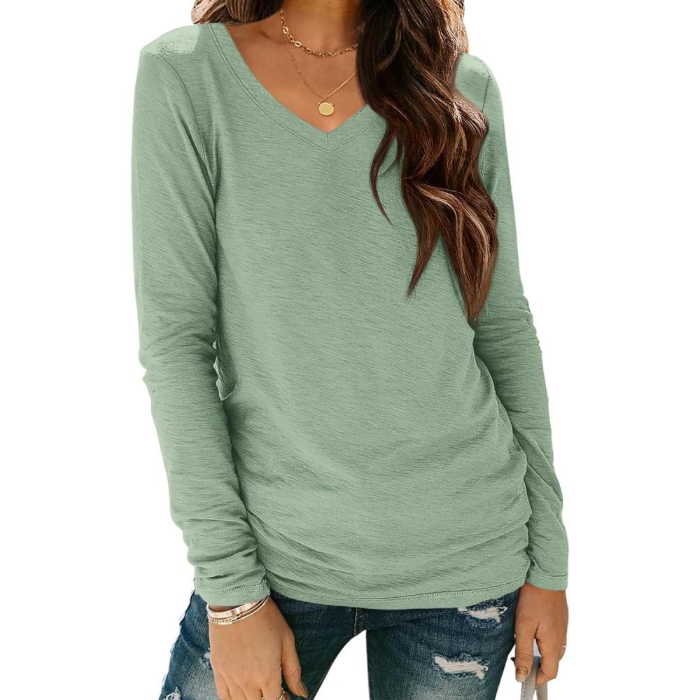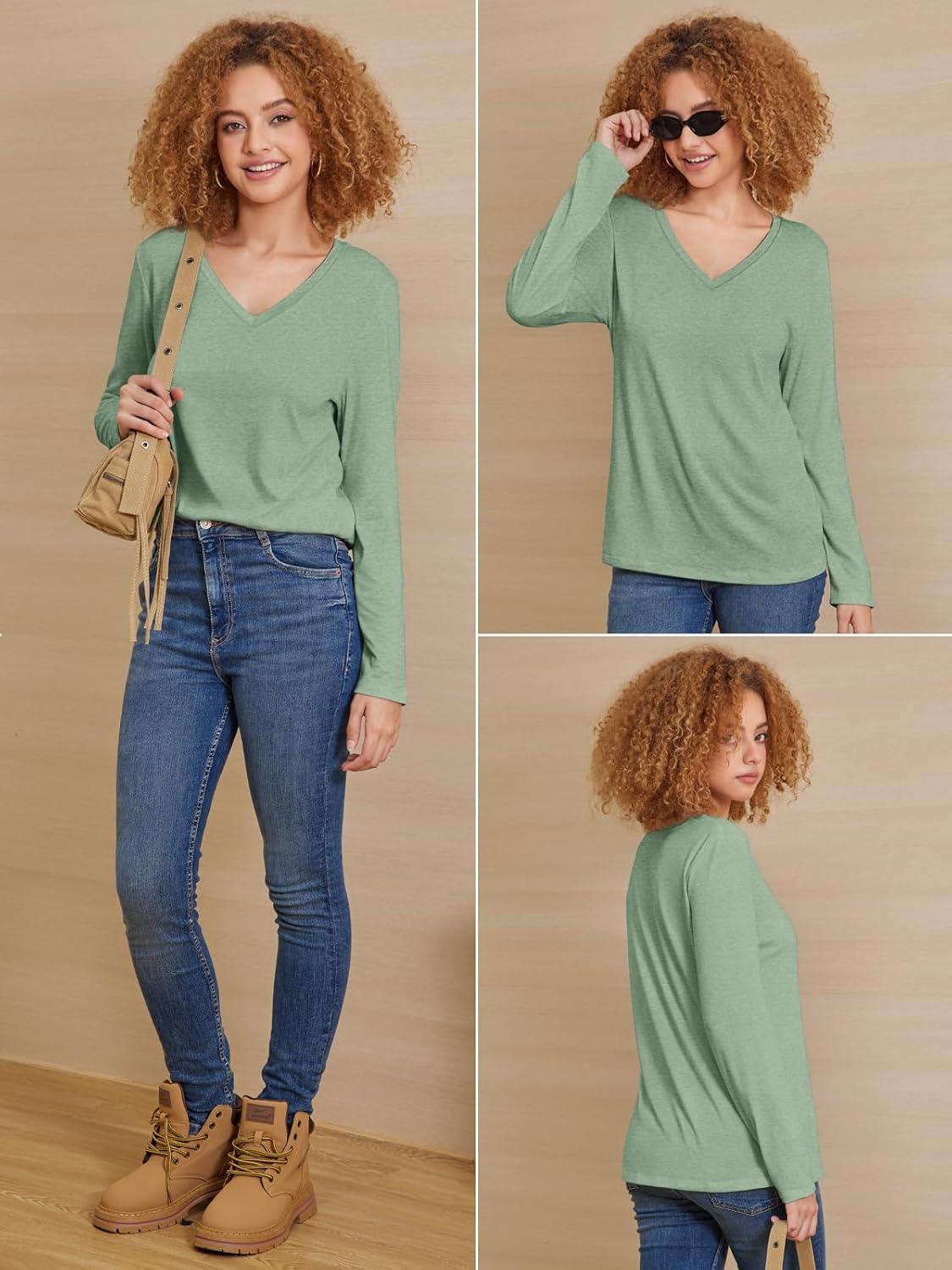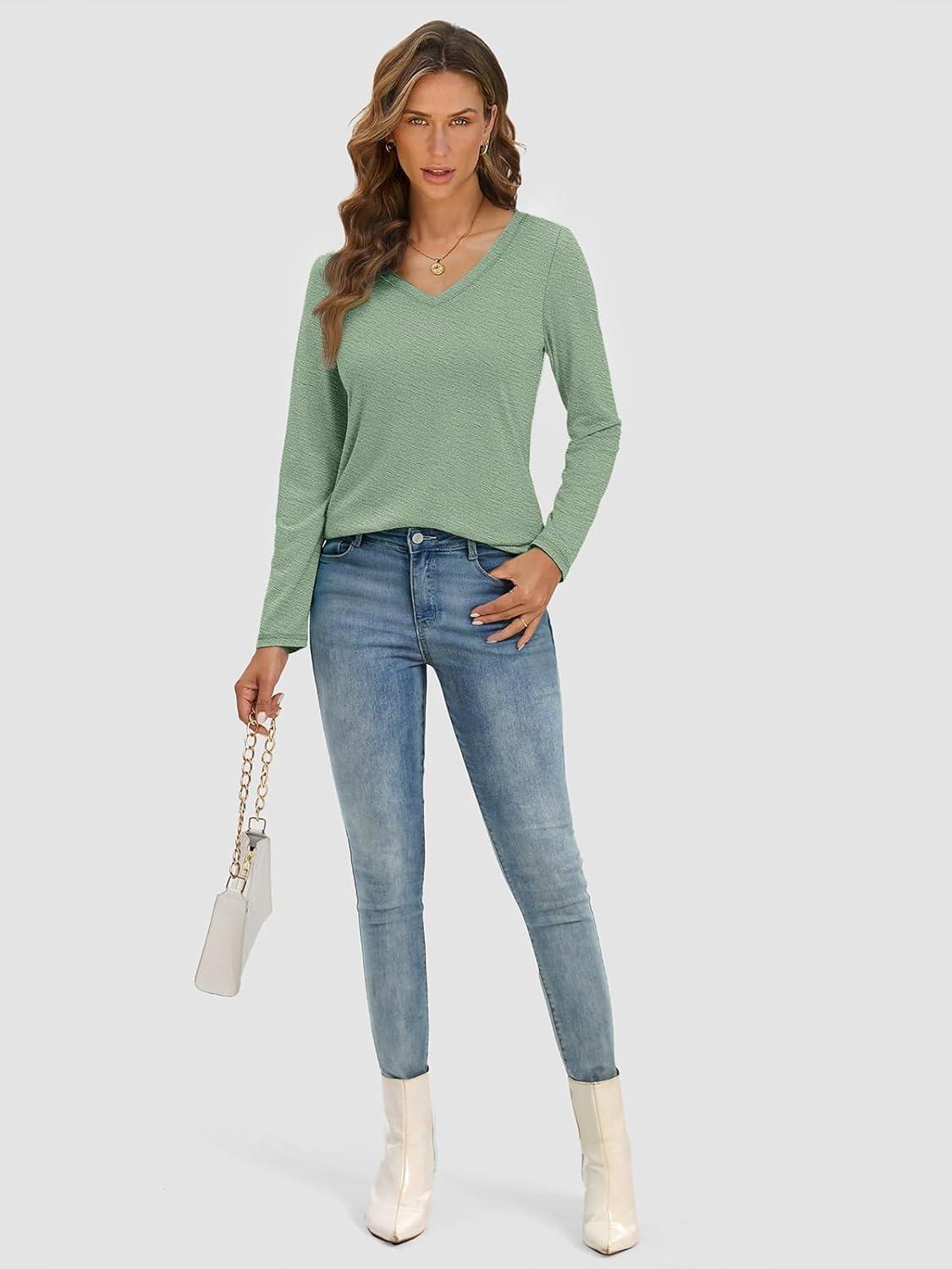 ATHMILE Womens Long Sleeve V Neck Shirts Basic Tee Casual Top Fall Trendy Tunic Outfits Fitted T Shirts(Light Green)