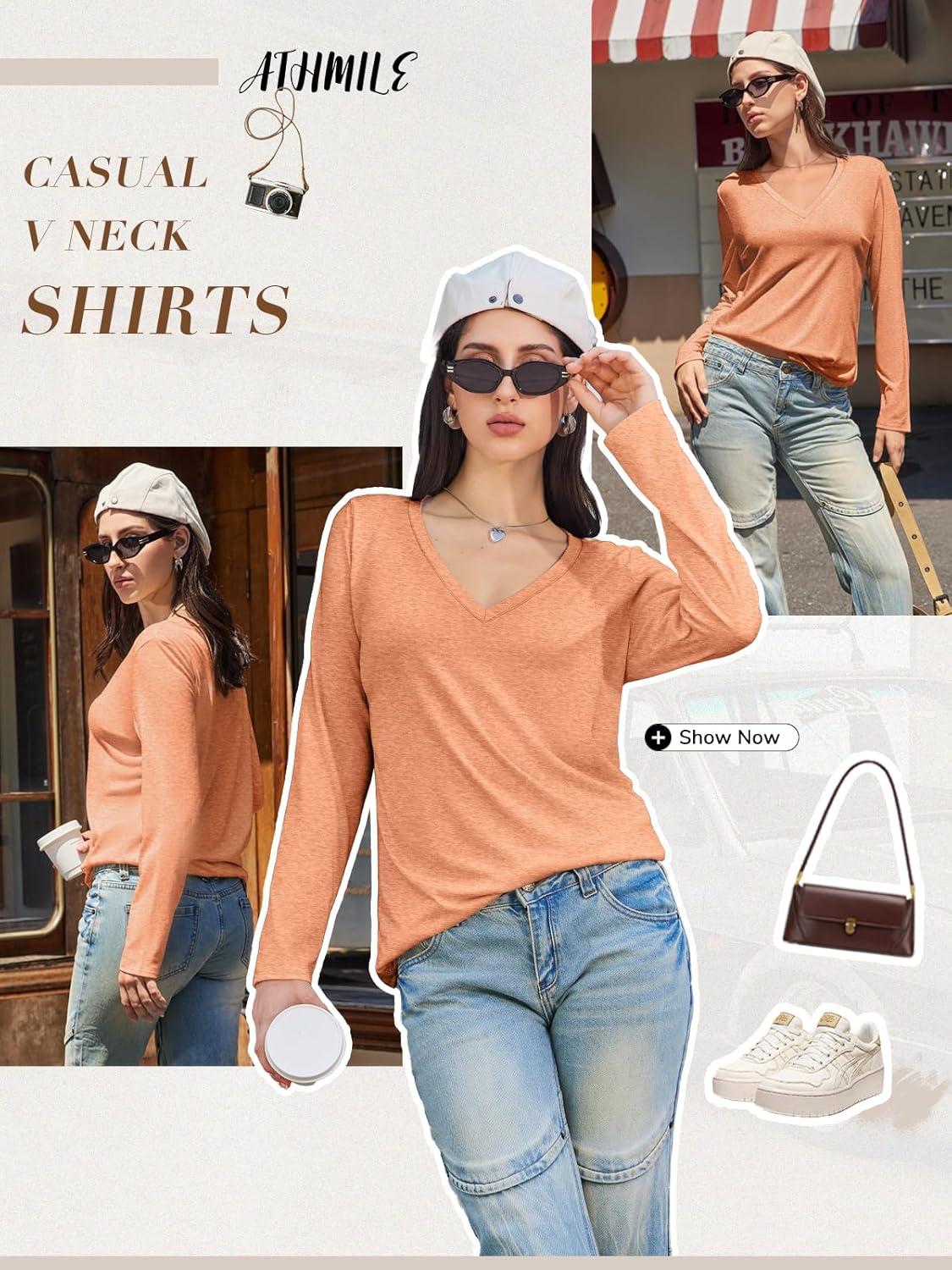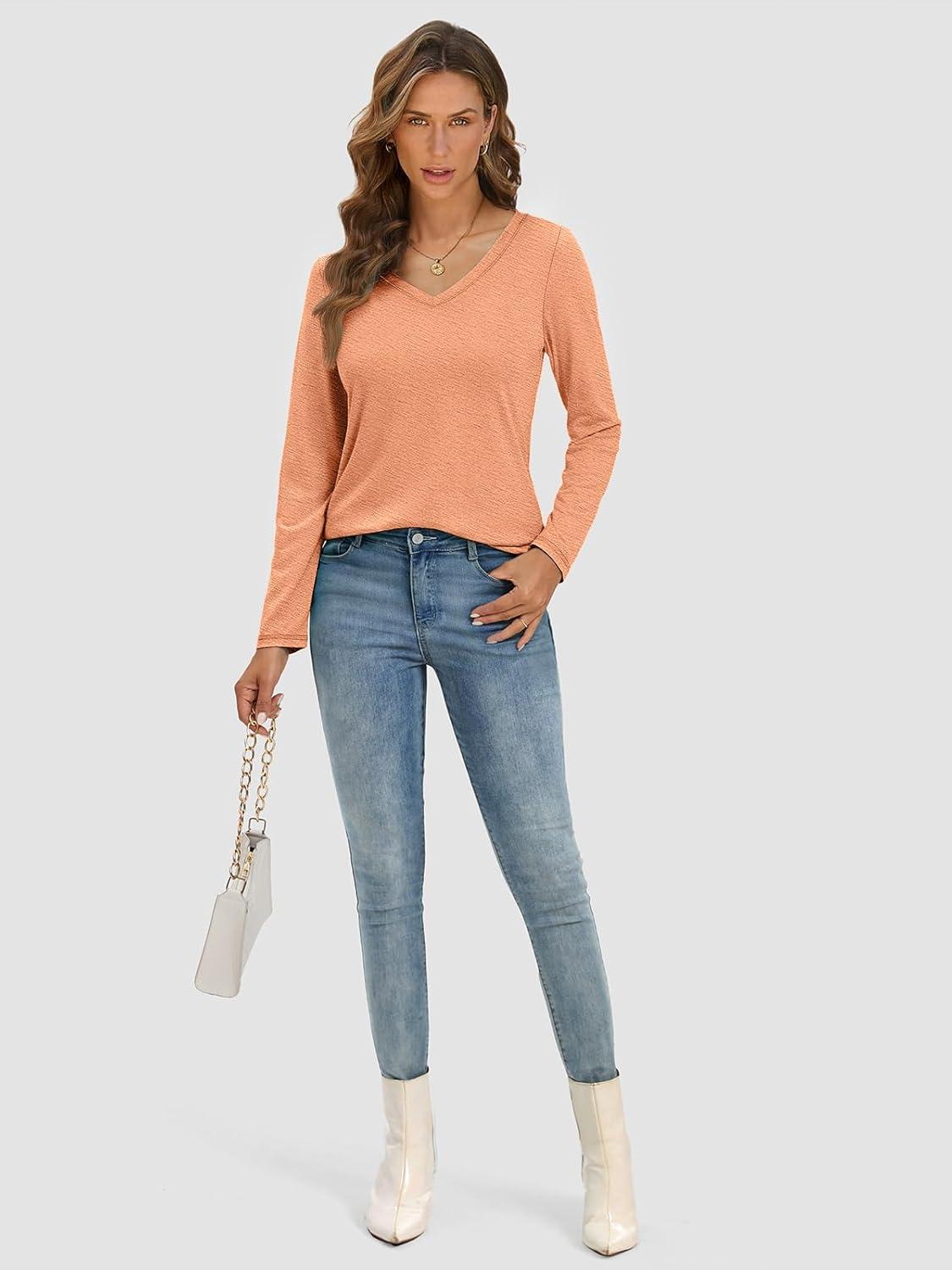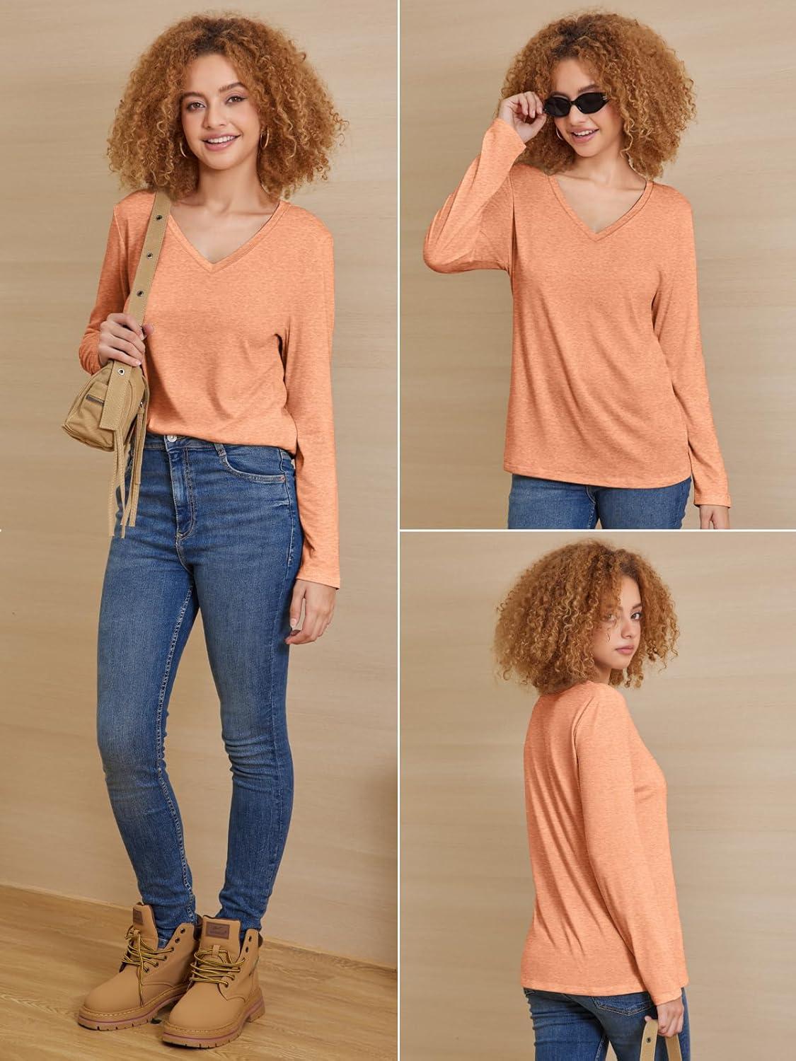 ATHMILE Womens Long Sleeve V Neck Shirts Basic Tee Casual Top Fall Trendy Tunic Outfits Fitted T Shirts(Light Orange)