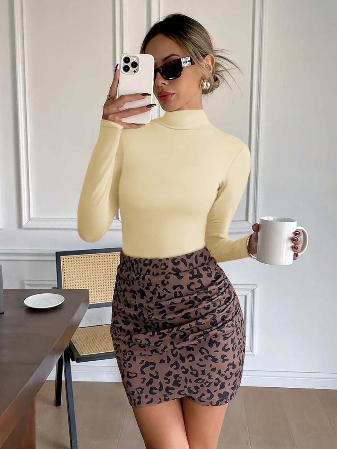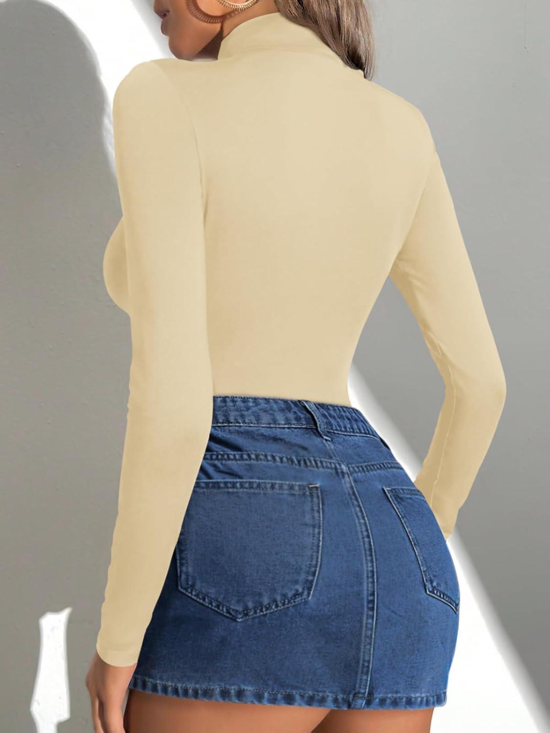 ATHMILE Women's Mock Turtle Neck Long Sleeve Tops Bodysuit Jumpsuit(Apricot)