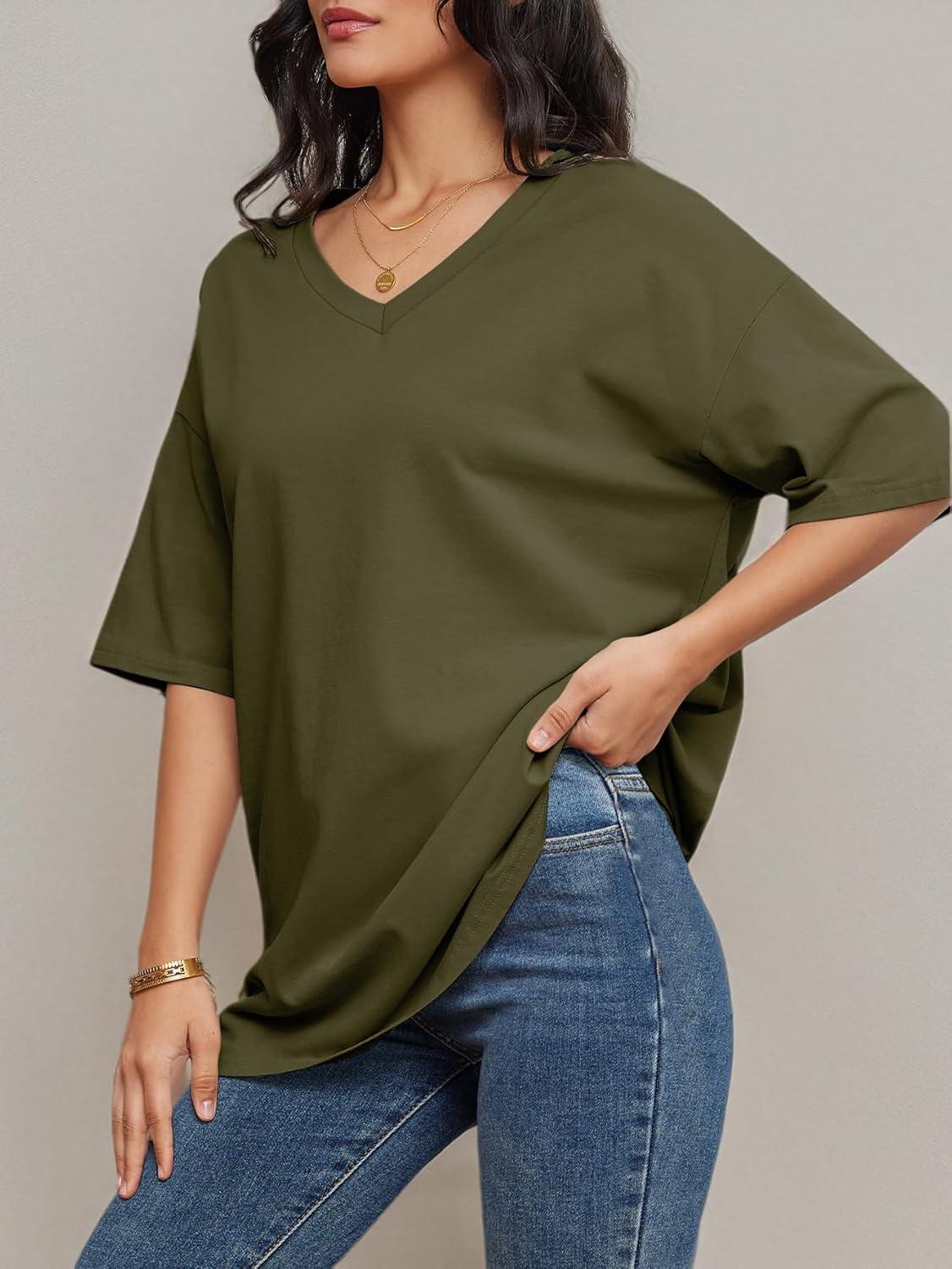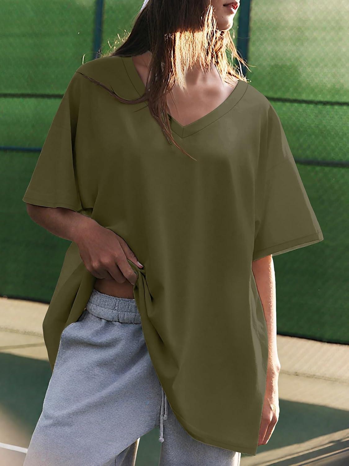 ATHMILE Womens Oversized Shirts V Neck Plus Size Spring Workout Summer Tops Beach Vacation 2026 Gym Clothes Basic Tee(Army Green)