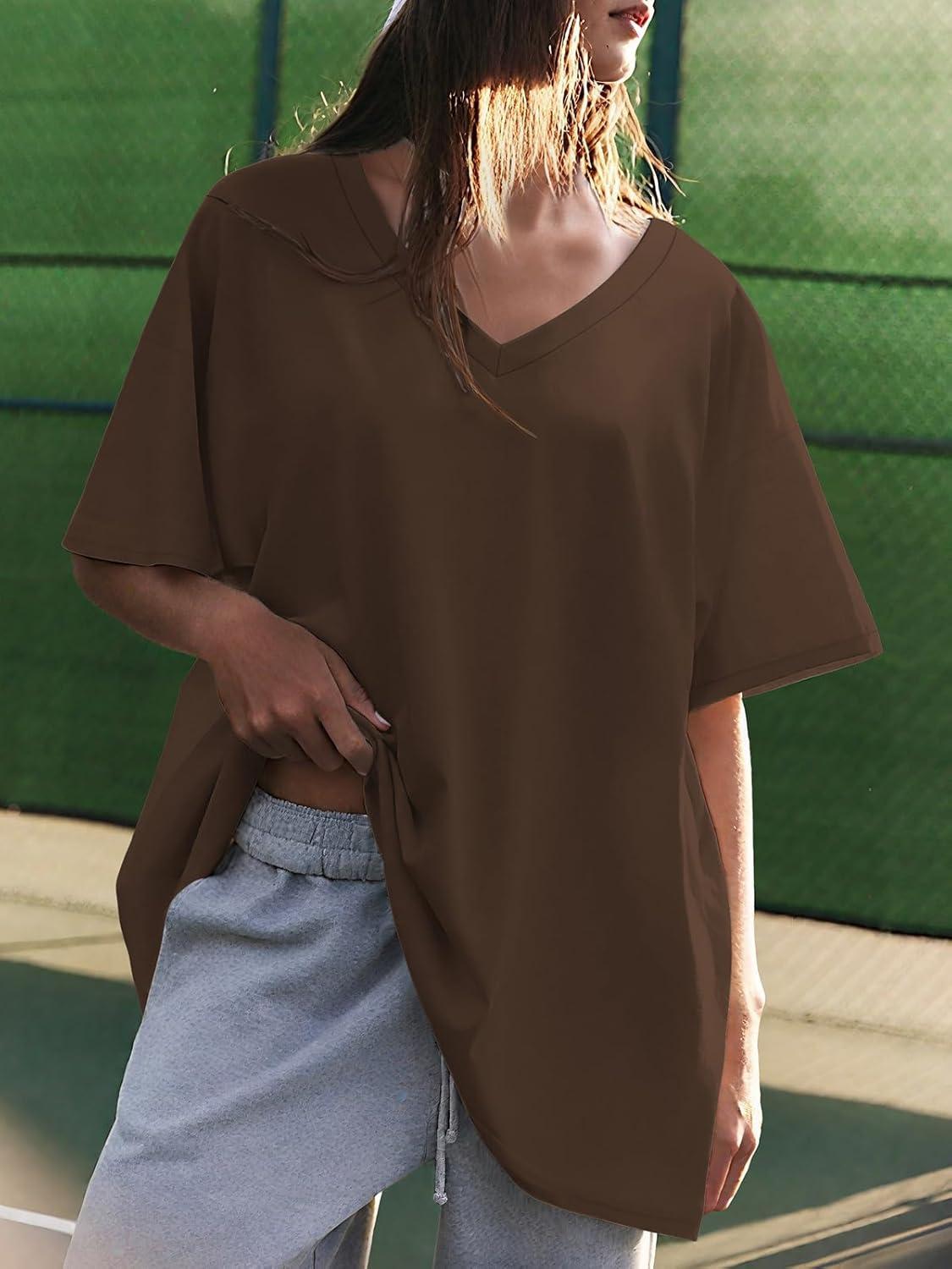 ATHMILE Womens Oversized Shirts V Neck Plus Size Spring Workout Summer Tops Beach Vacation 2026 Gym Clothes Basic Tee(Brown)